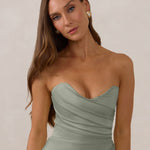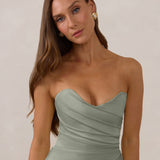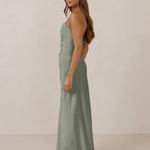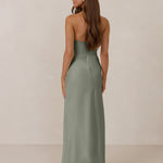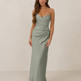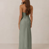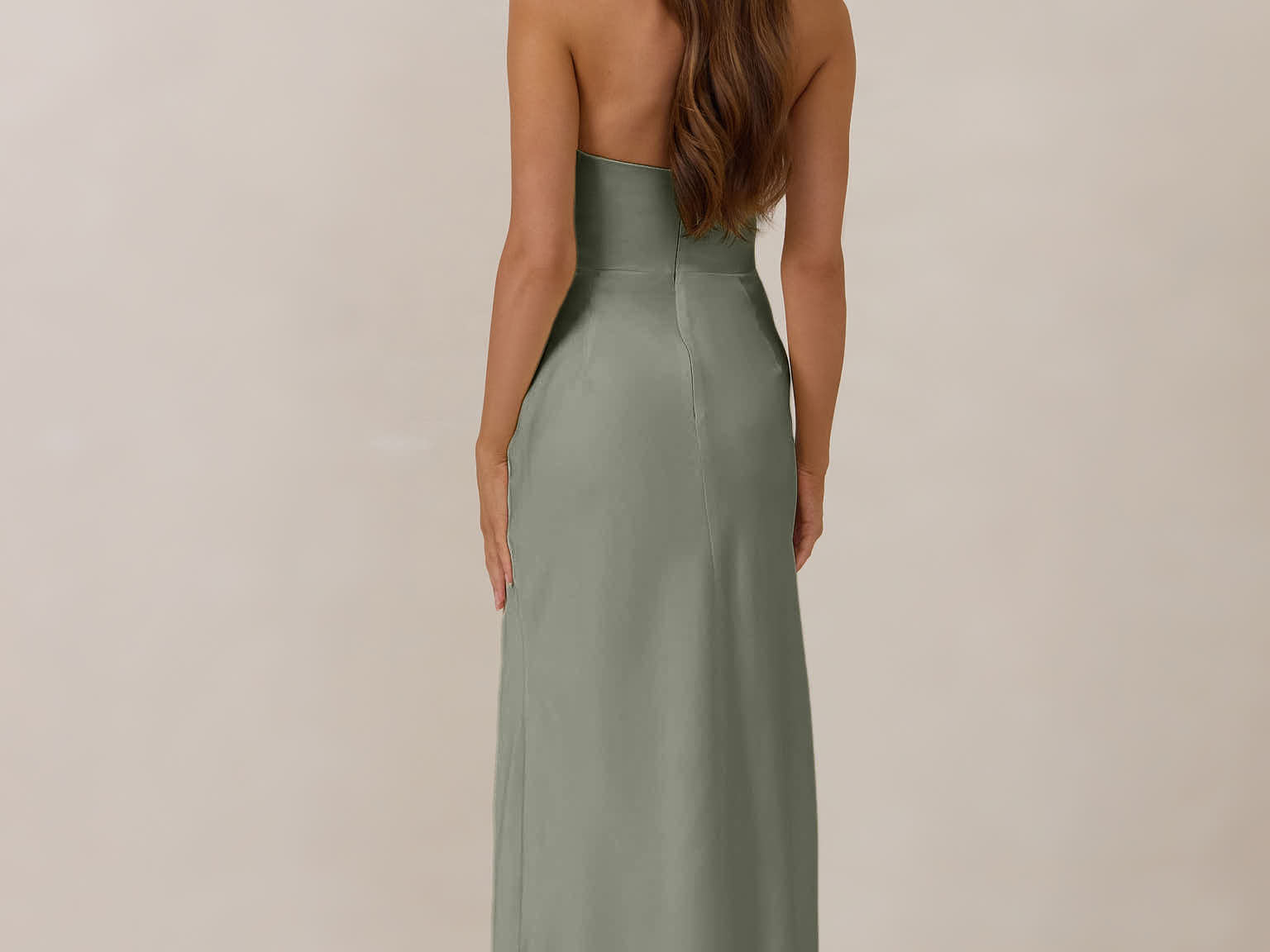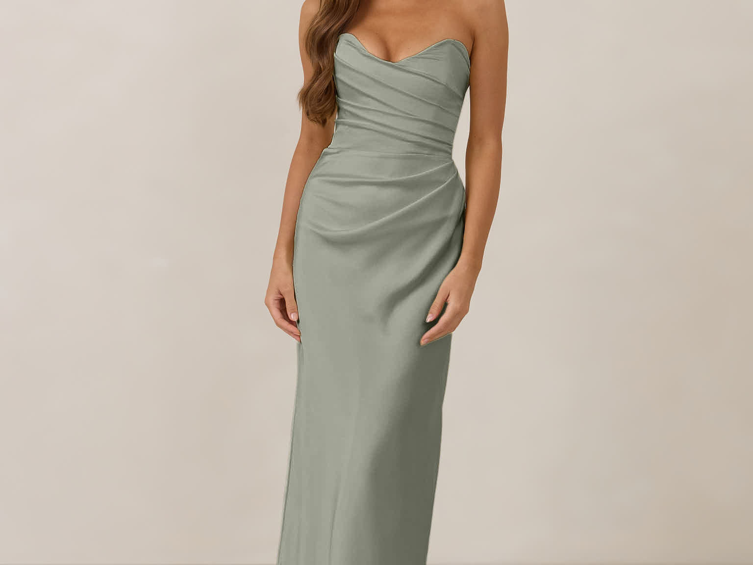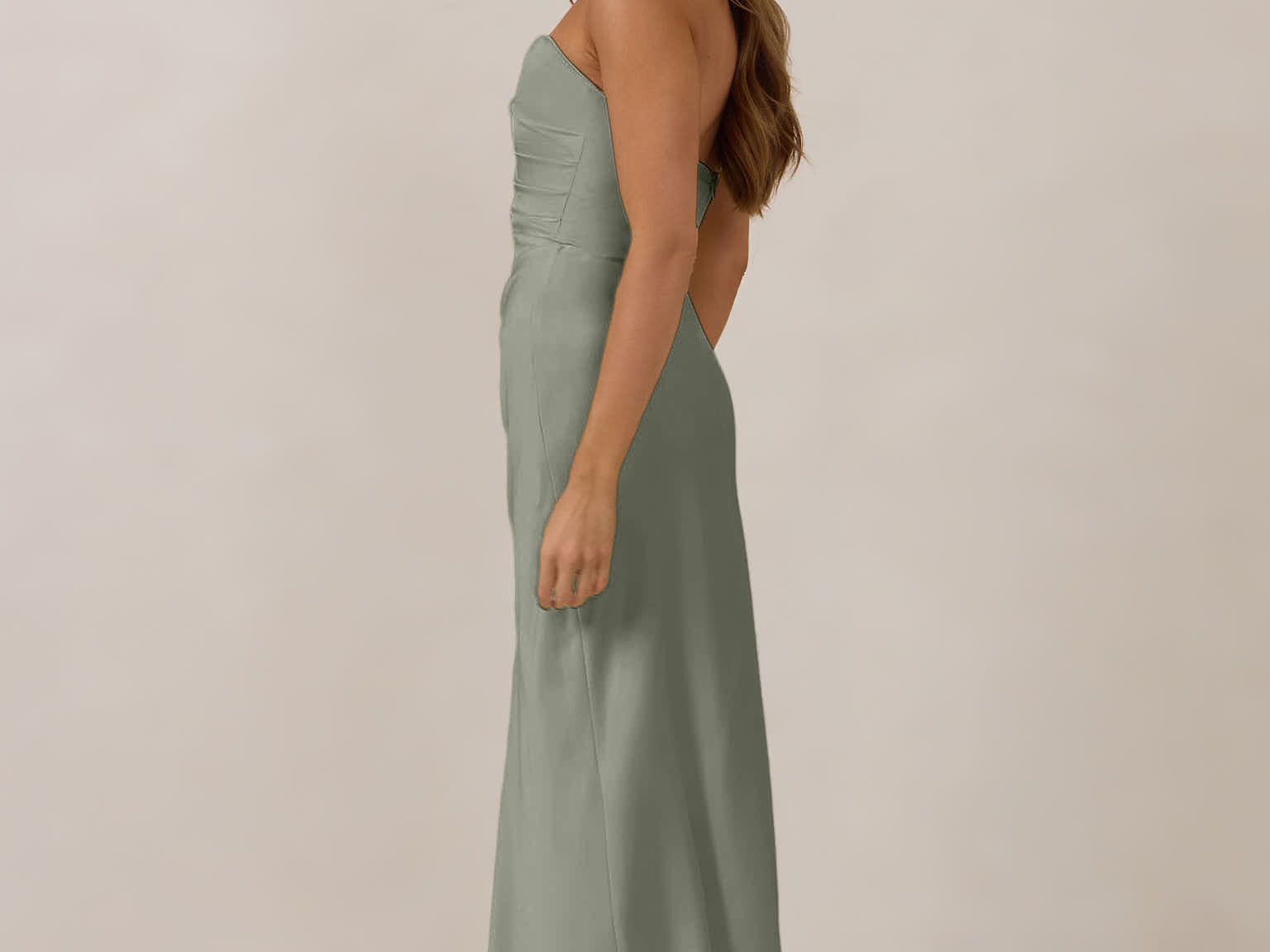 Designed with a scoop sweetheart neckline and soft pleating through the boned bodice and skirt, this dress creates a sleek, feminine silhouette. Elegant and timeless, it’s an ideal choice for weddings, receptions, or any formal occasion.