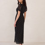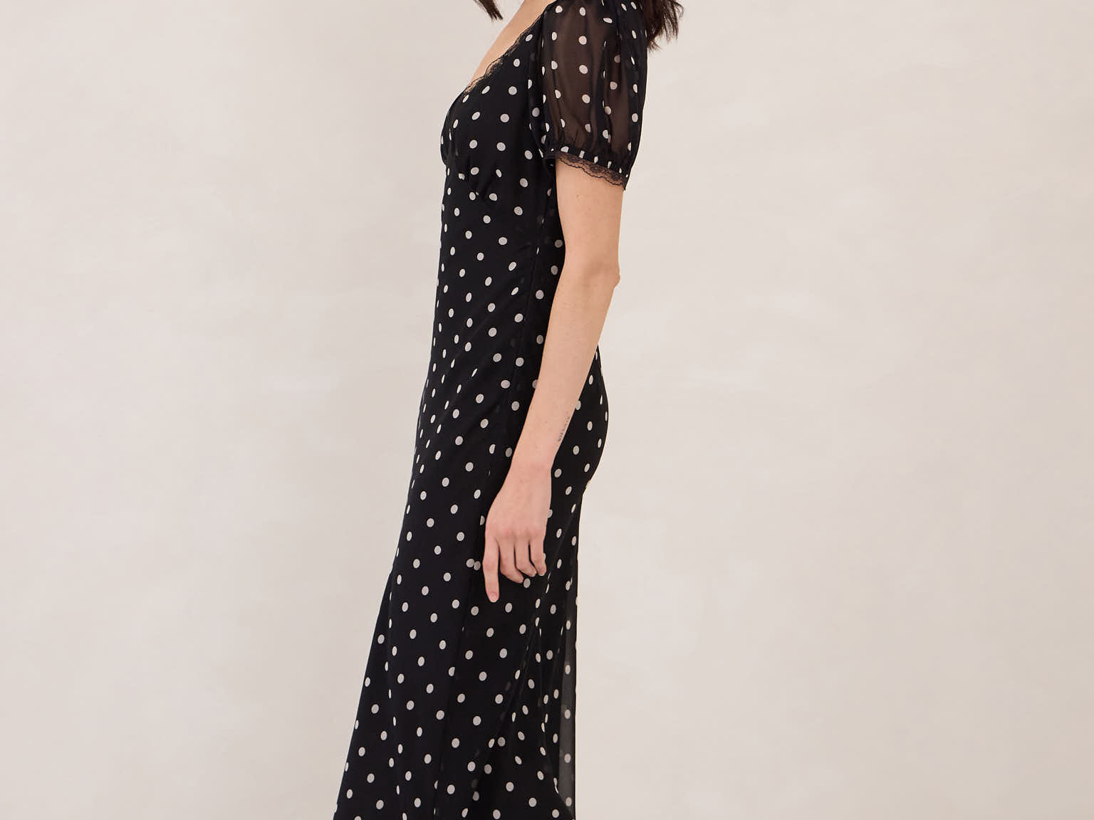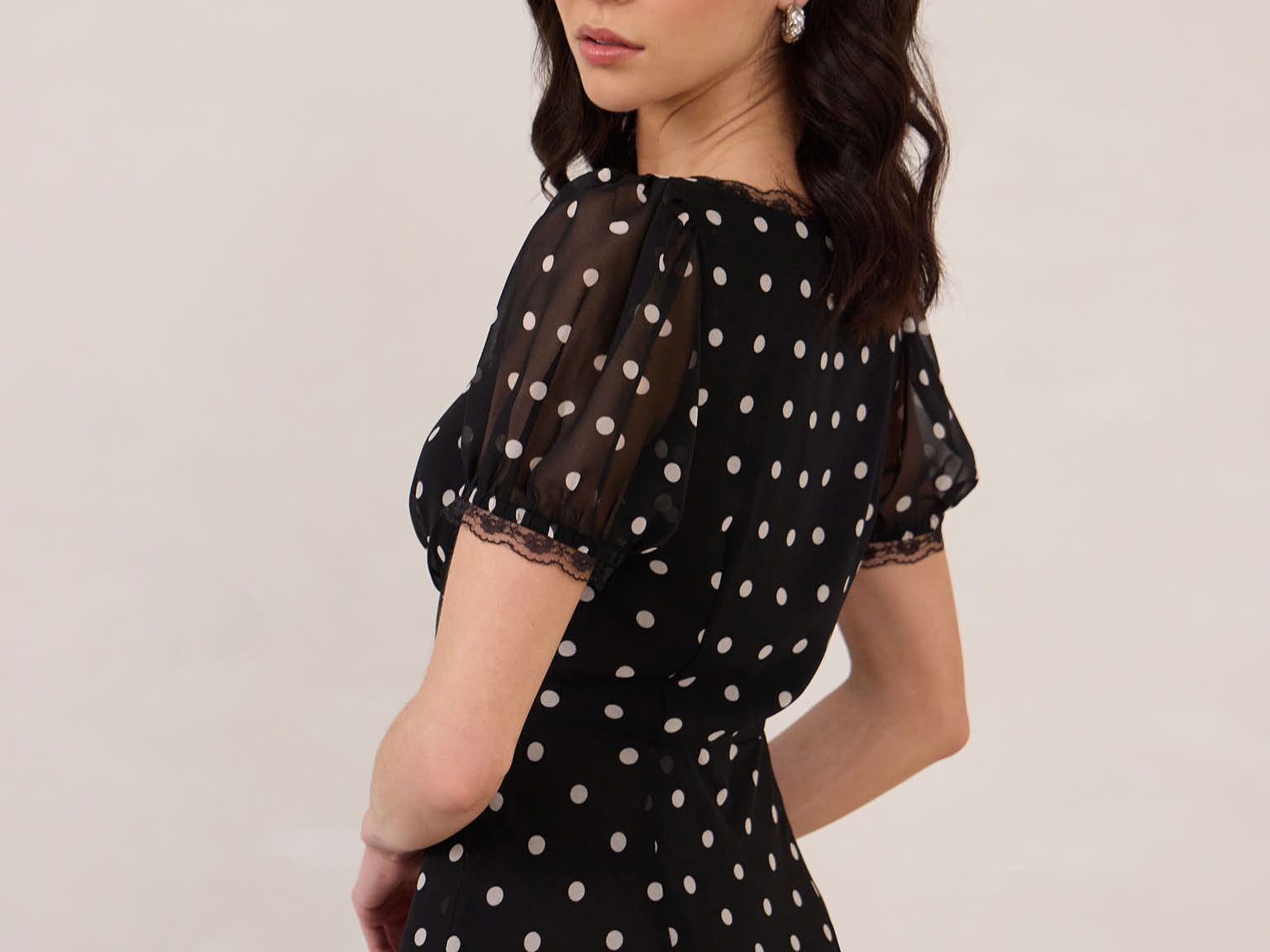 The perfect combination of sexy and cute. Made with chiffon, and a delicate lace lined detail around the neckline and sleeves, The Bowery masters the transition from day to night in this effortless polka dot dress.