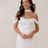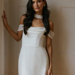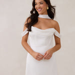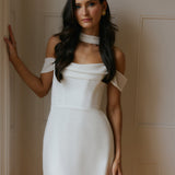 Crafted from sleek satin, this mini dress features a soft draped chiffon neckline and delicate off-the-shoulder sleeves for an understated yet striking look. Whether for a rehearsal dinner, bridal shower, or after-party, it’s the perfect piece for any wedding moment.