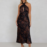 - Halter neckline with button closure