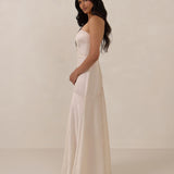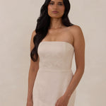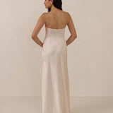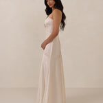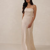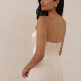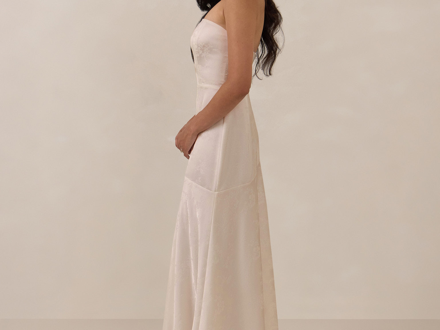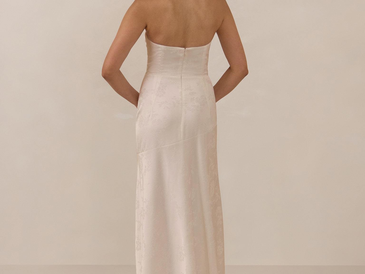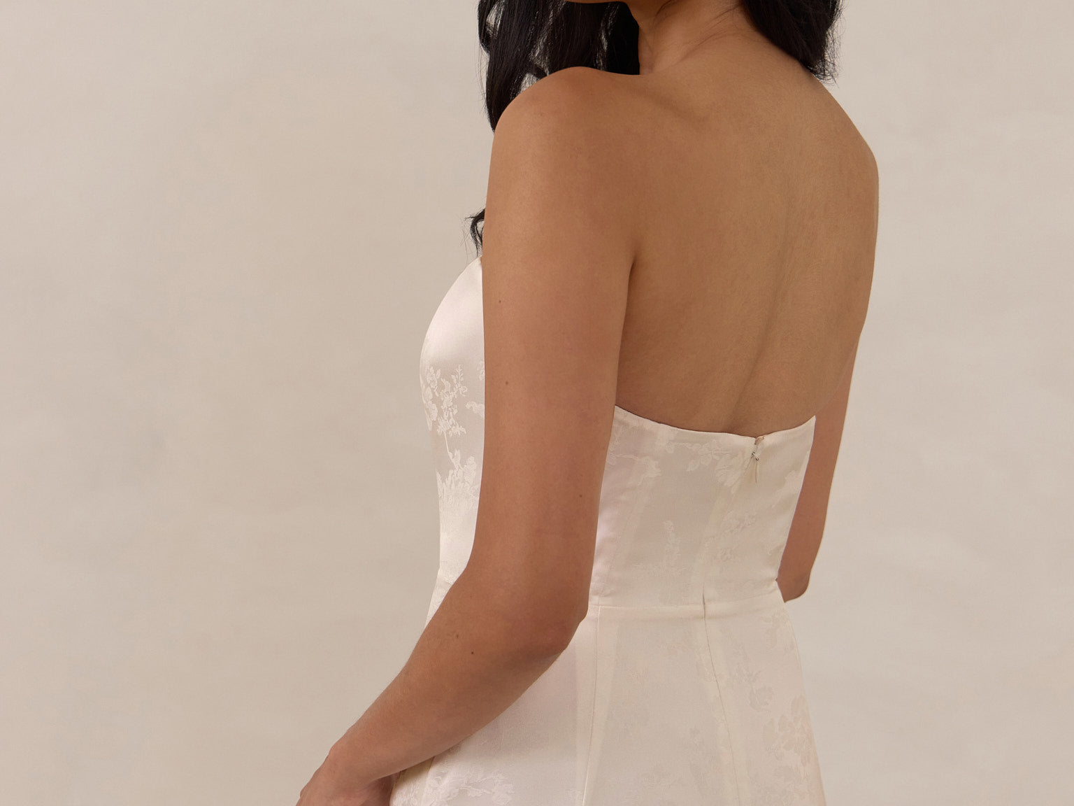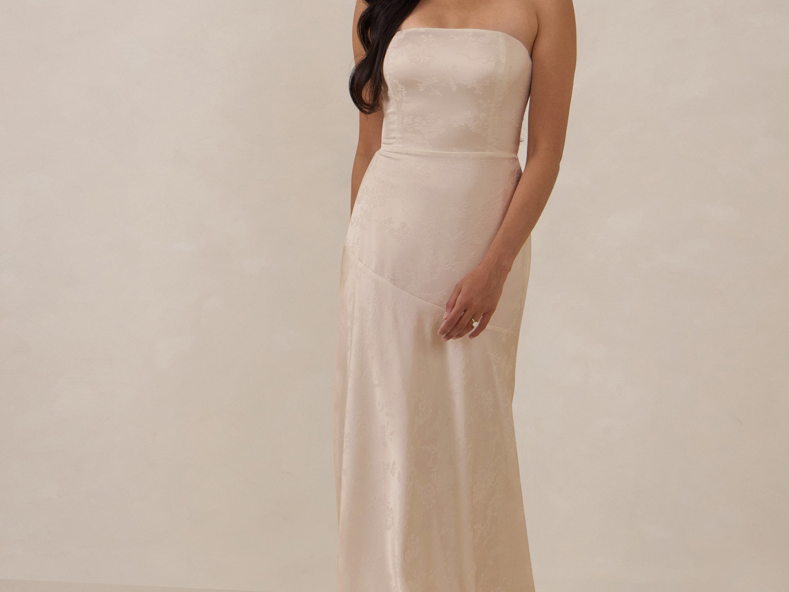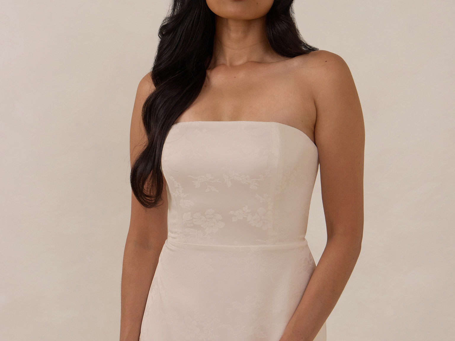 The Delaney is a full-length, strapless silhouette crafted from luxurious Jacquard satin. Clean lines and a smooth, sculpted bodice create a timeless look, while the sleek finish makes it an elevated choice for any bridal party.