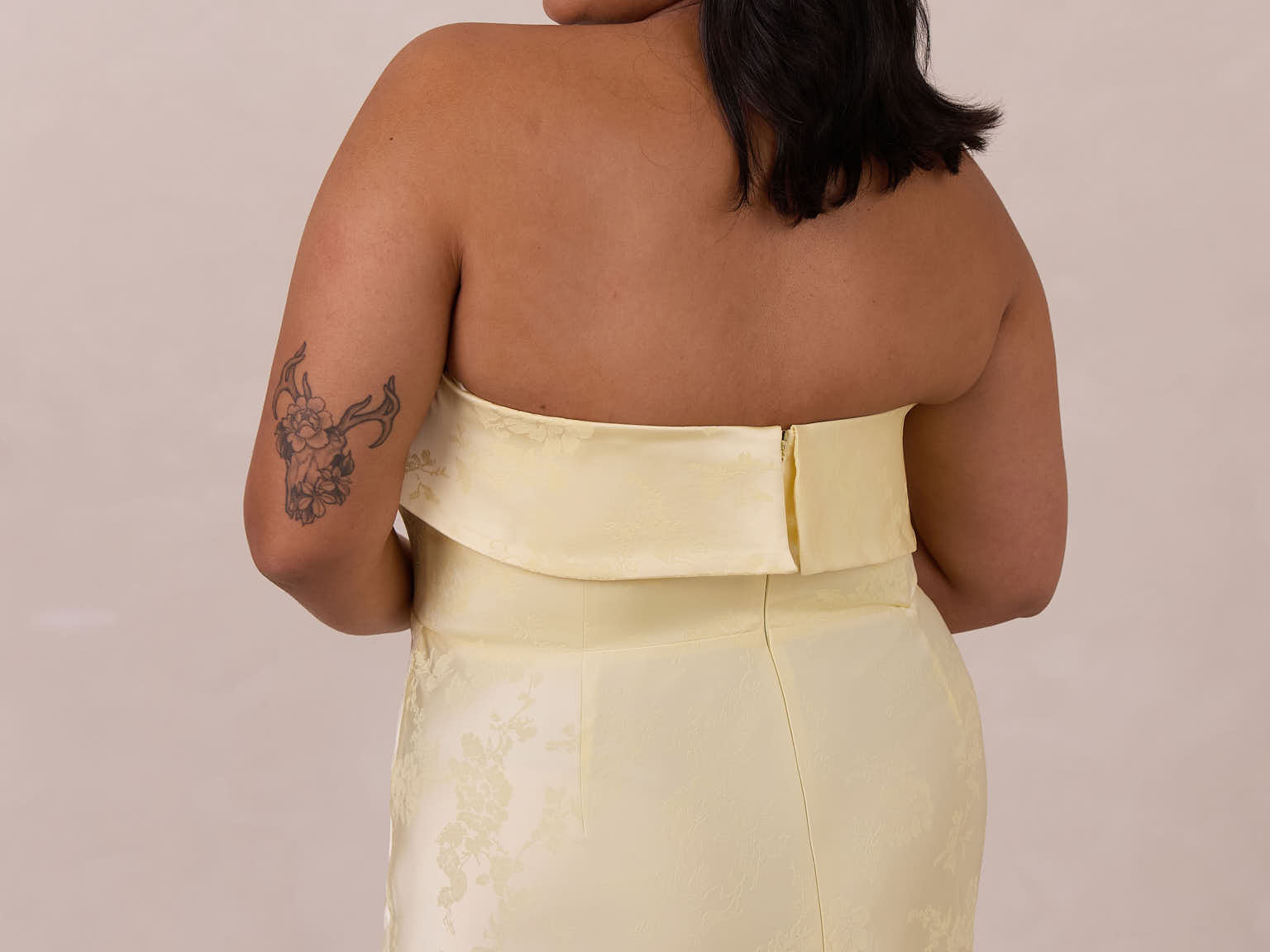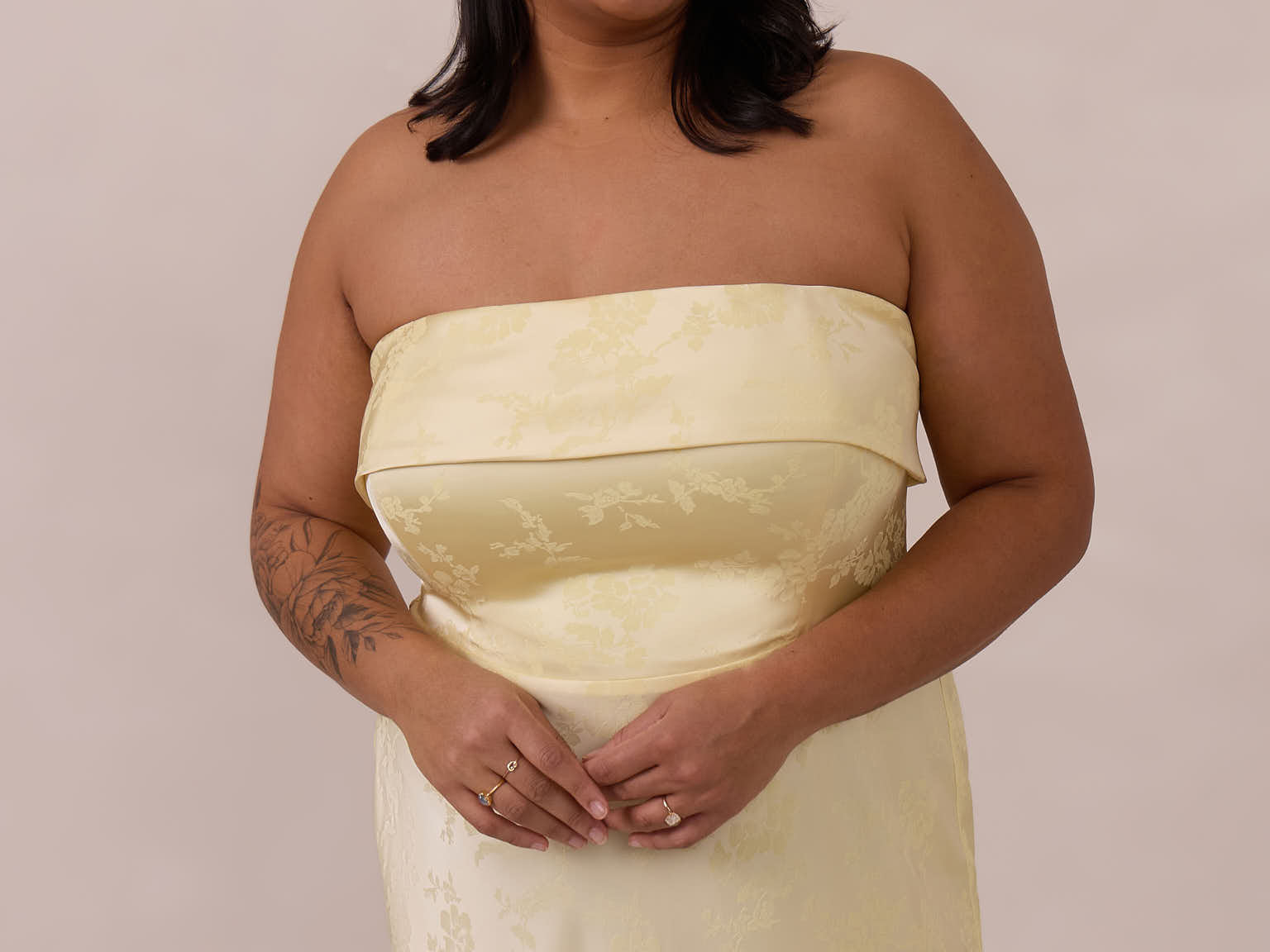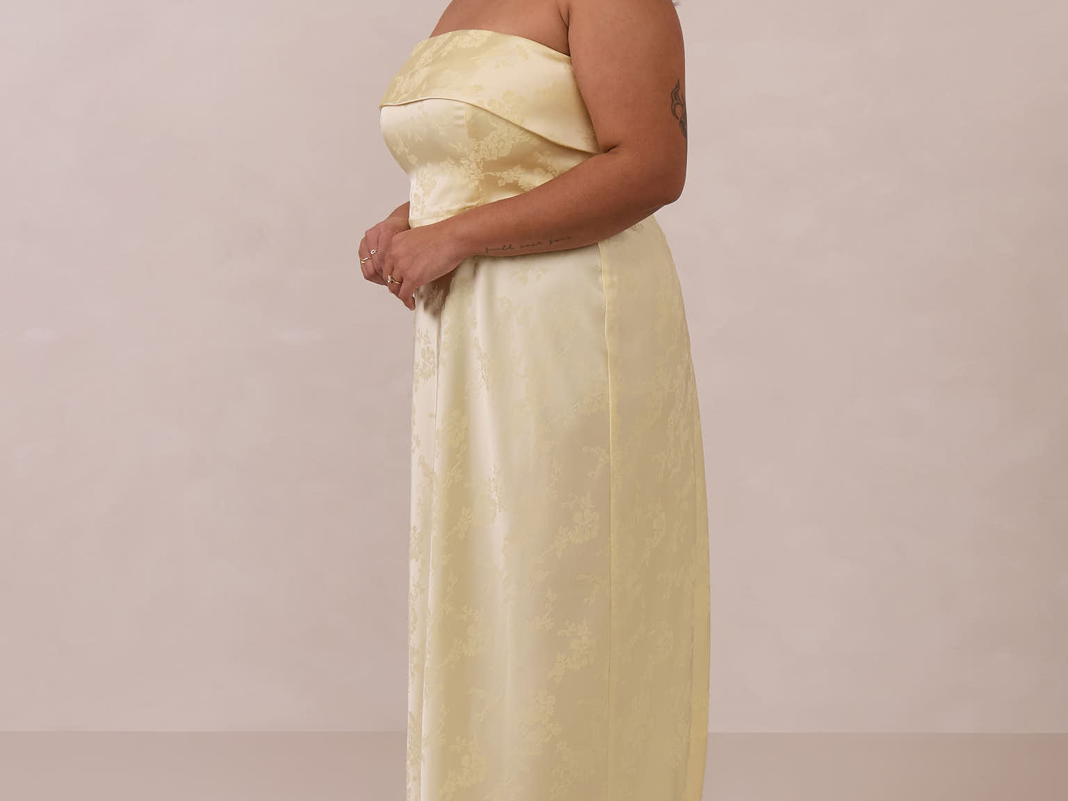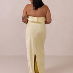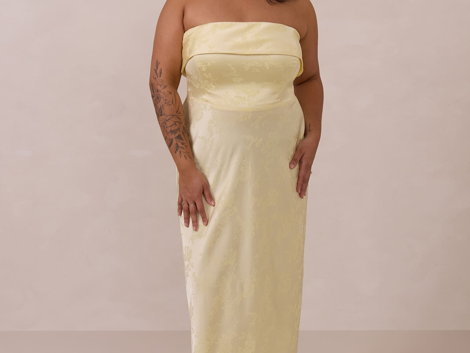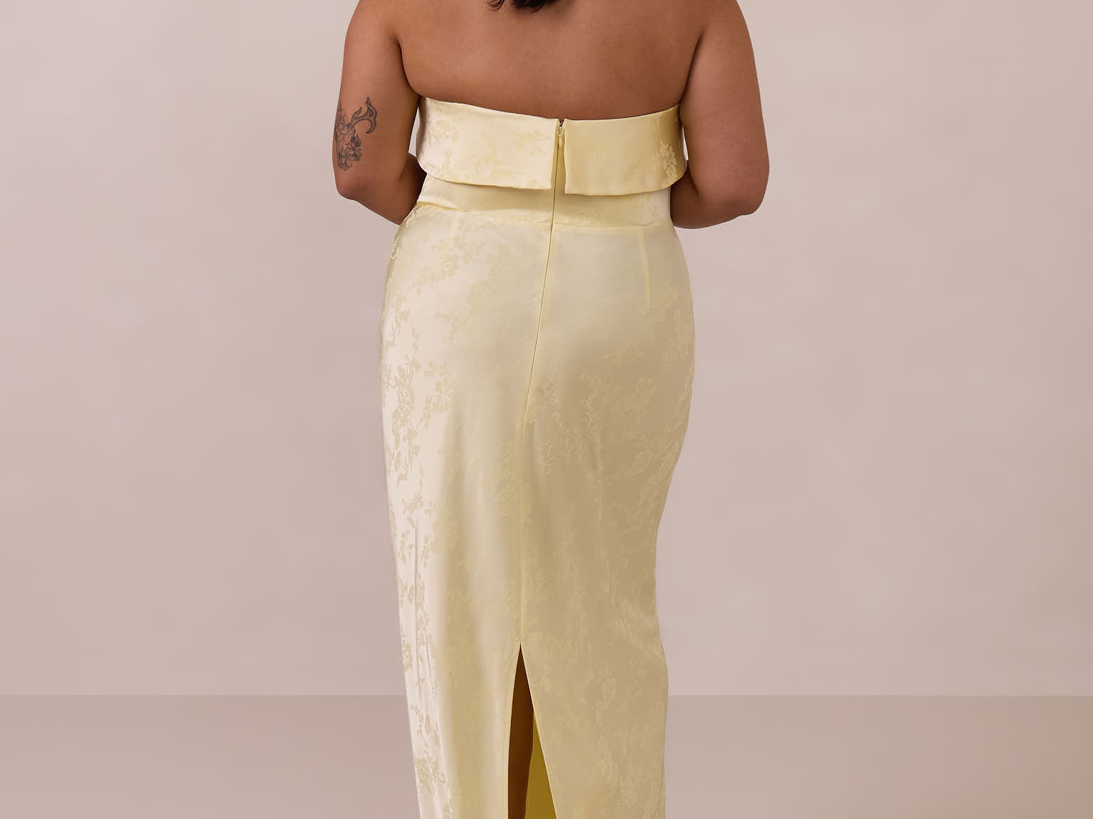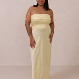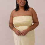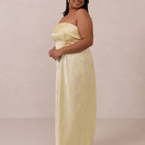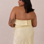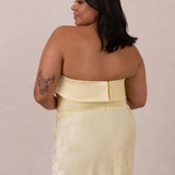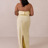 A timeless piece designed to captivate. Designed from luxe jacquard fabric with a subtle sheen and intricate texture, this dress exudes understated glamour. The structured, folded strapless neckline adds a modern sculptural element, gracefully framing the shoulders.