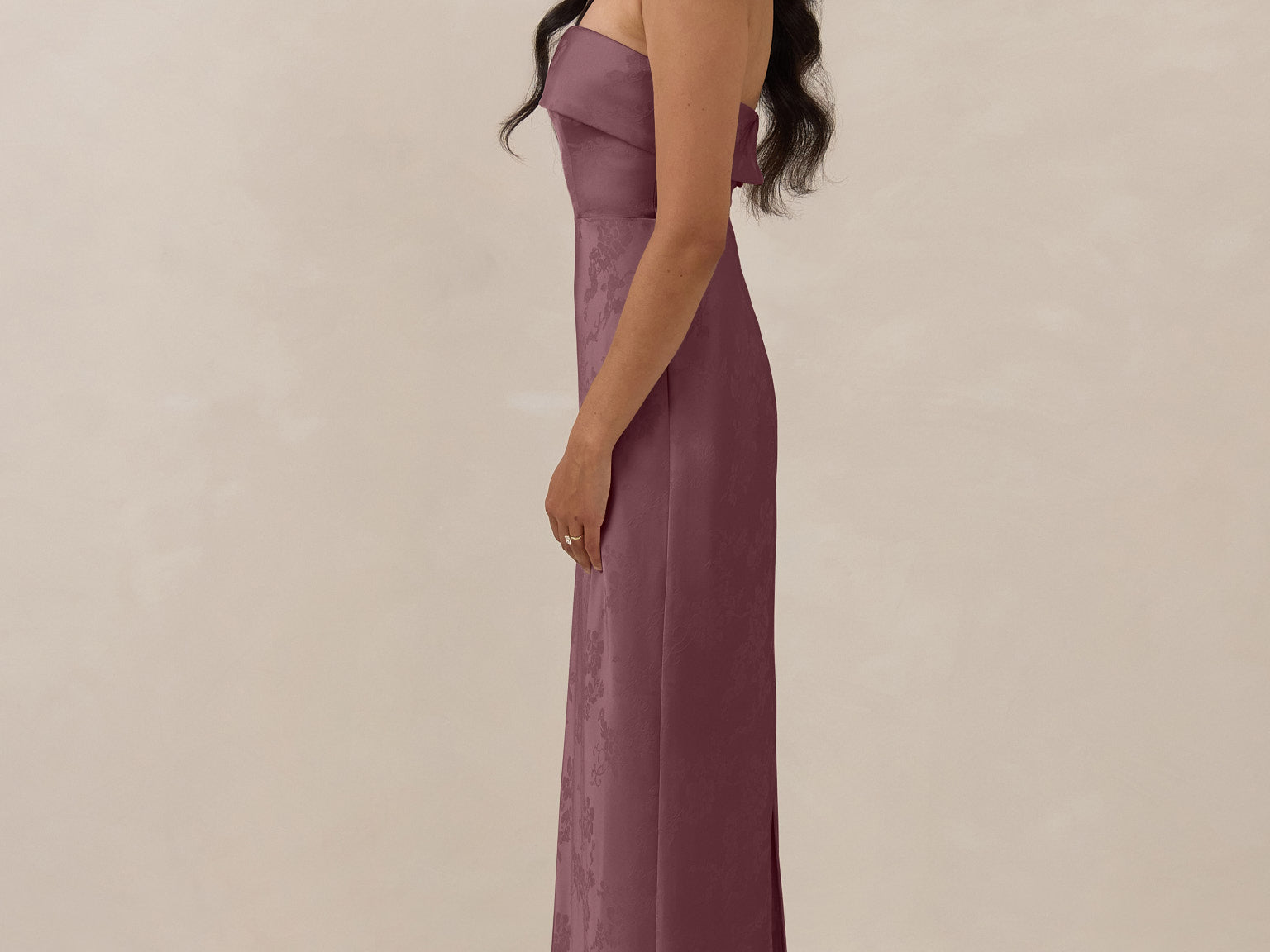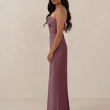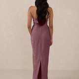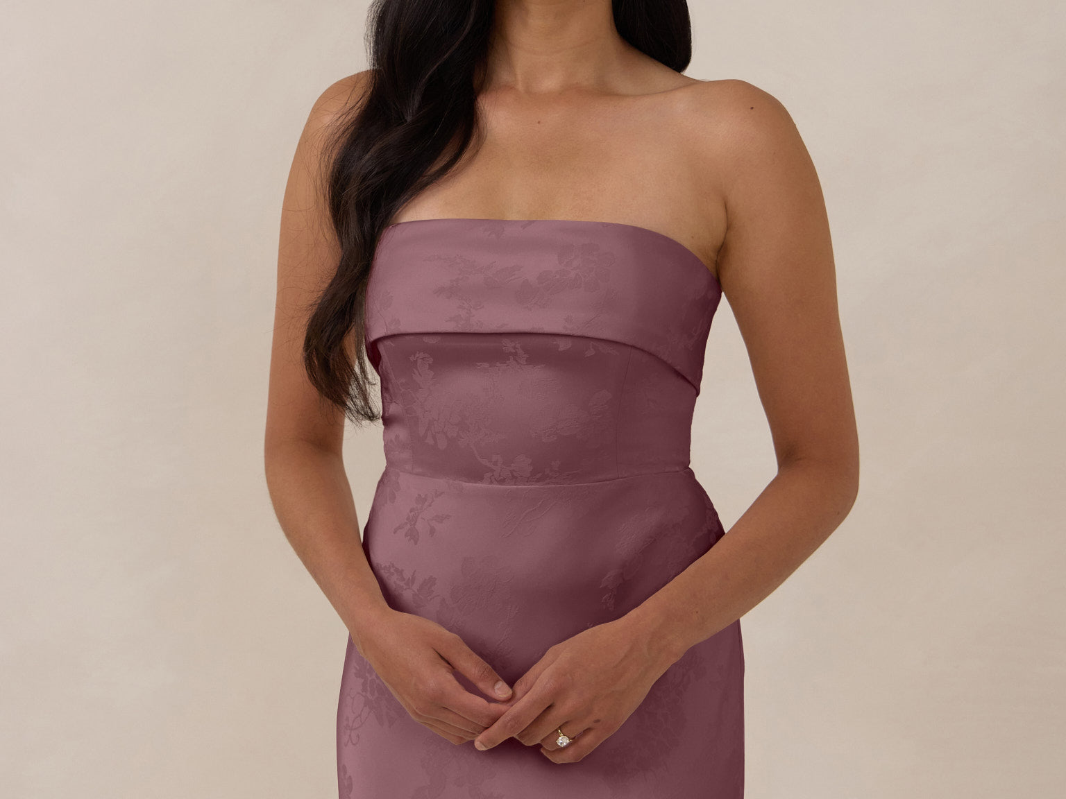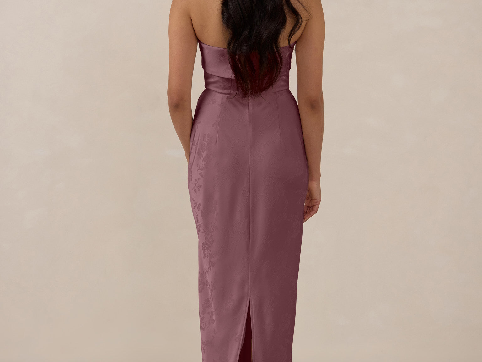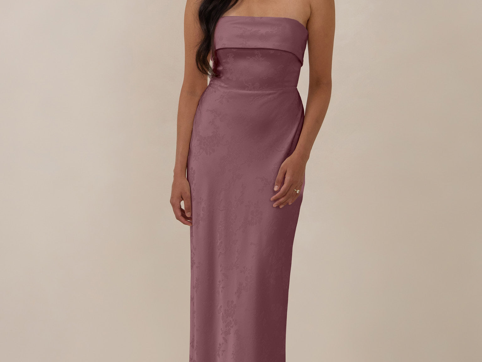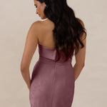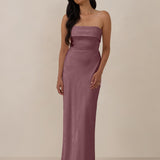 A timeless piece designed to captivate. Designed from luxe bubble satin fabric with a subtle sheen, this dress exudes understated glamour. The structured, folded strapless neckline adds a modern sculptural element, gracefully framing the shoulders.
