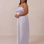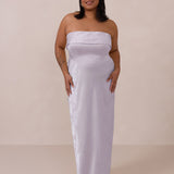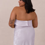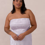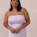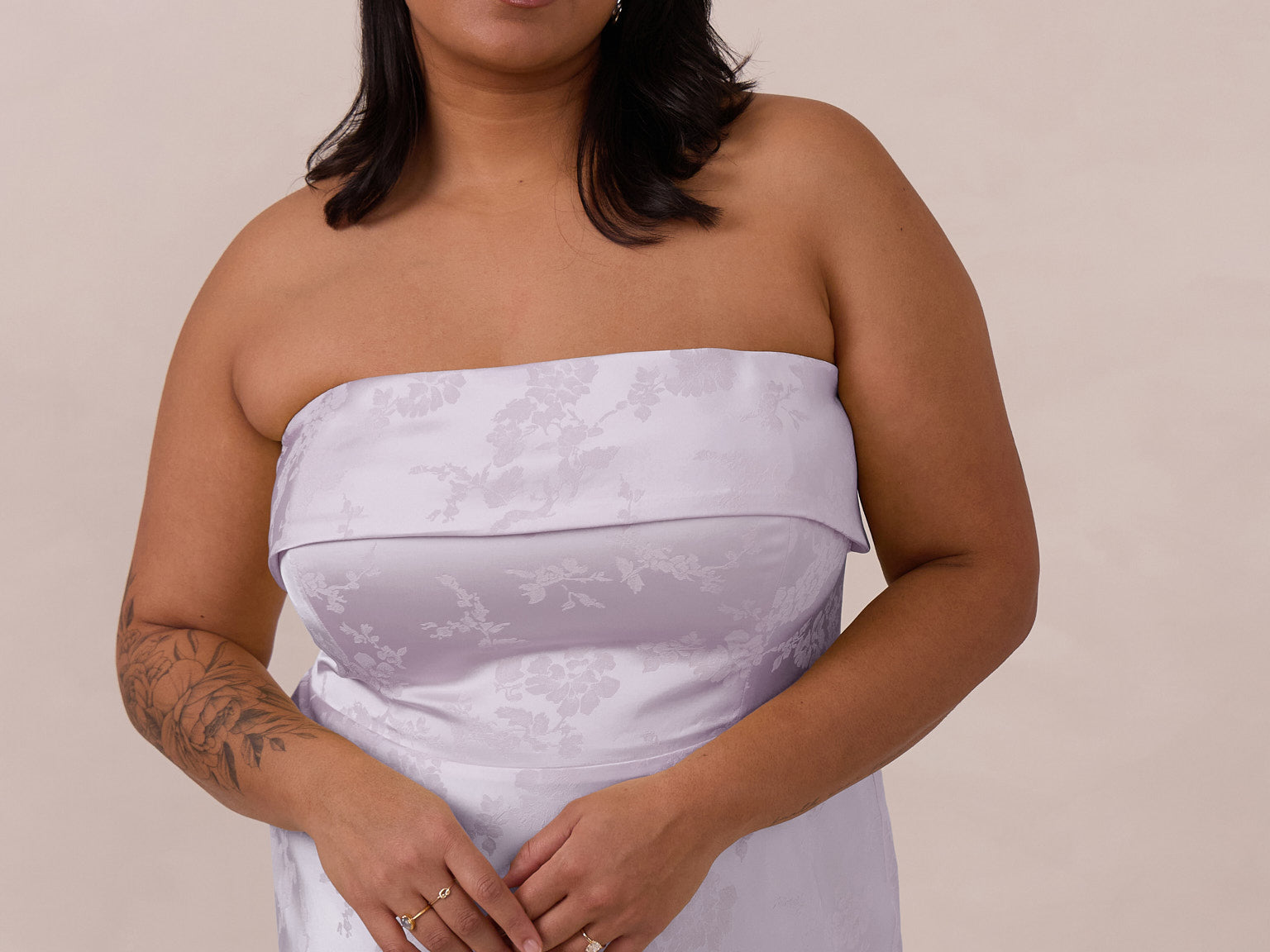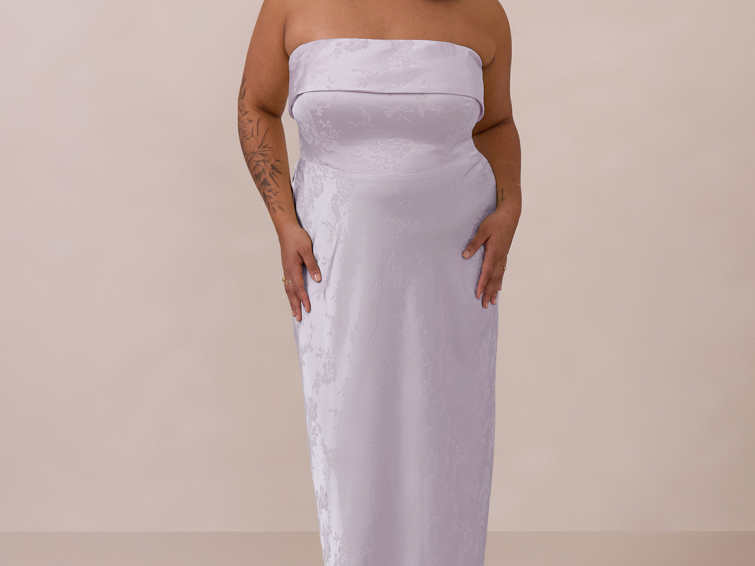 A timeless piece designed to captivate. Designed from luxe jacquard fabric with a subtle sheen and intricate texture, this dress exudes understated glamour. The structured, folded strapless neckline adds a modern sculptural element, gracefully framing the shoulders.