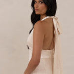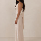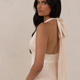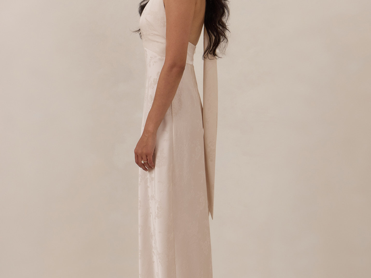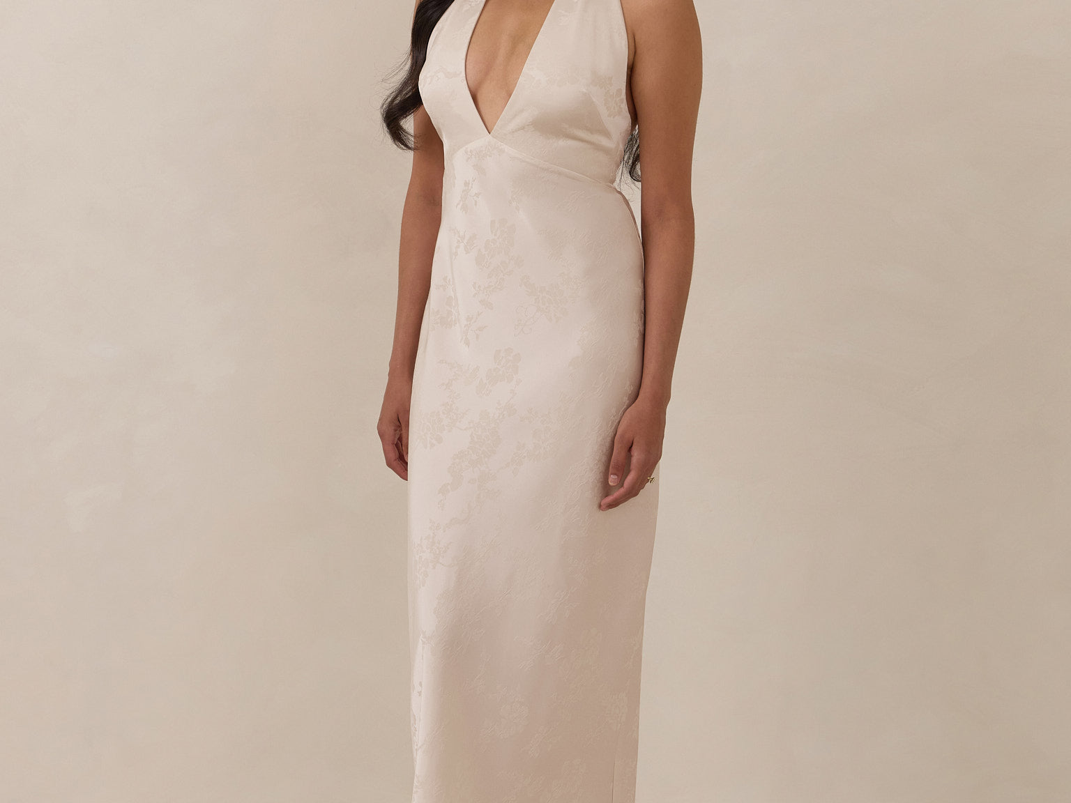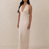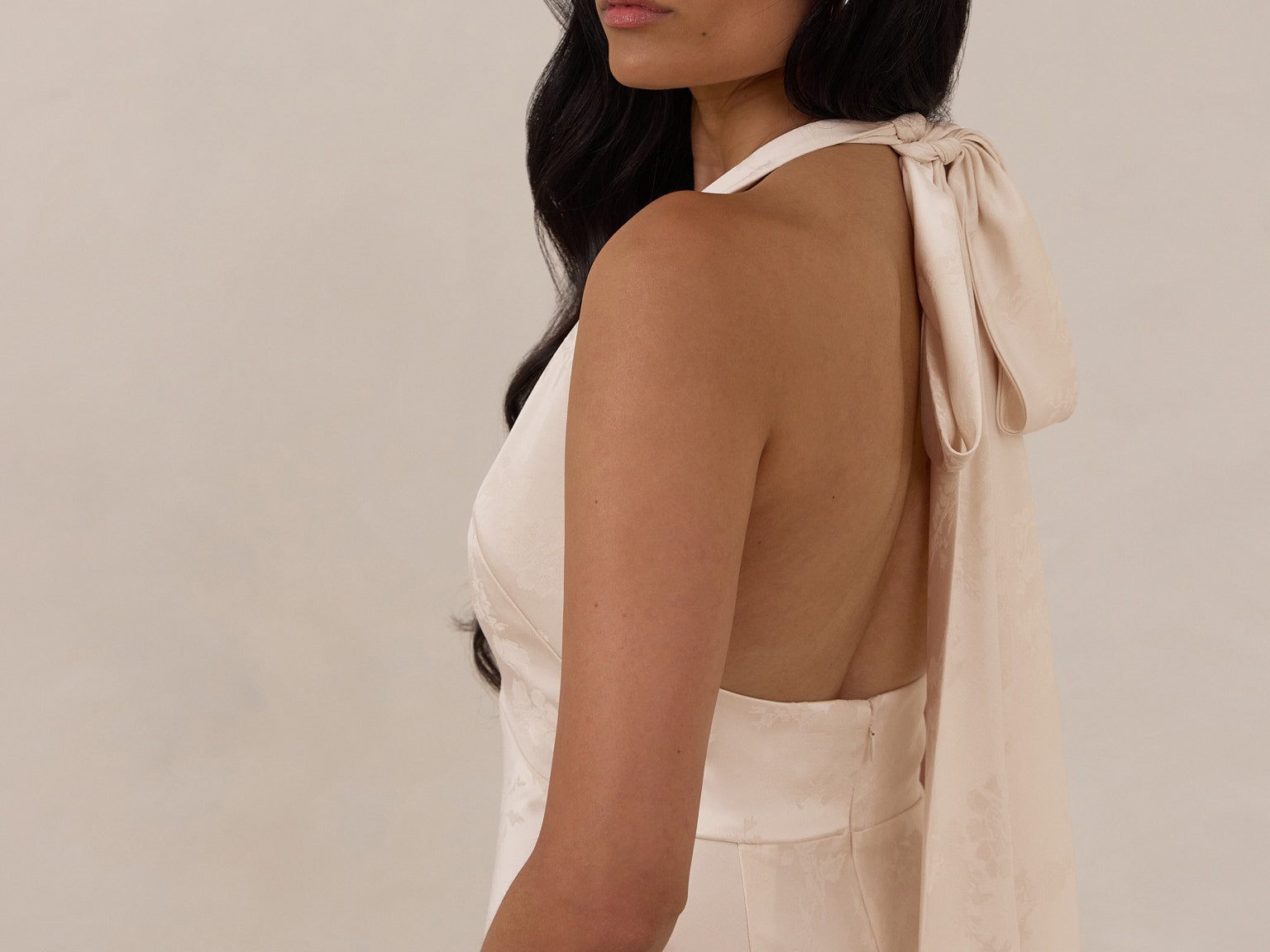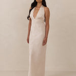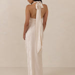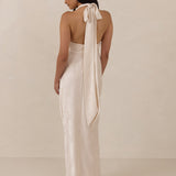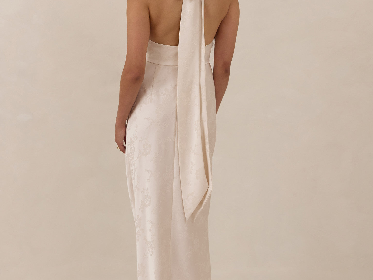 A sleek and versatile silhouette crafted in luxurious Jacquard for a touch of texture and sophistication. Designed for effortless elegance, it features a halter neckline with a dramatic open back and long ties that can be styled as a scarf or knotted for a custom halter look. The bias-cut skirt flows beautifully into a flattering maxi length, creating graceful movement with every step.