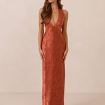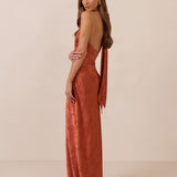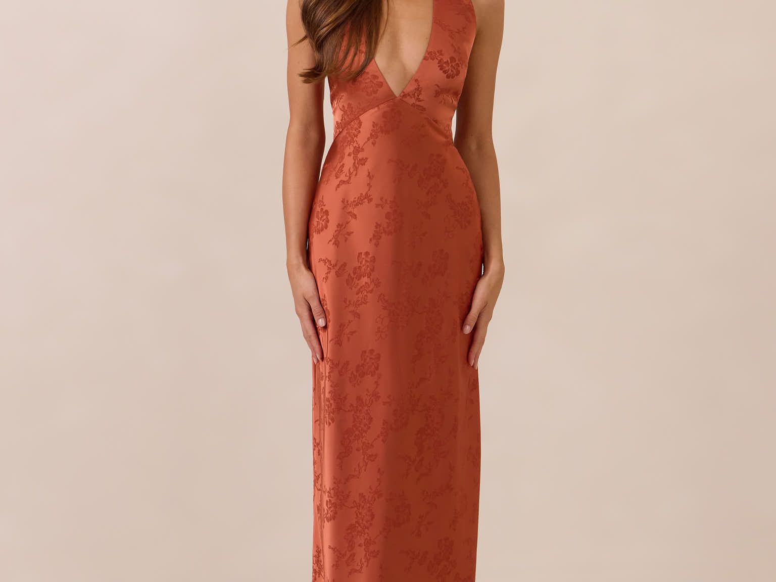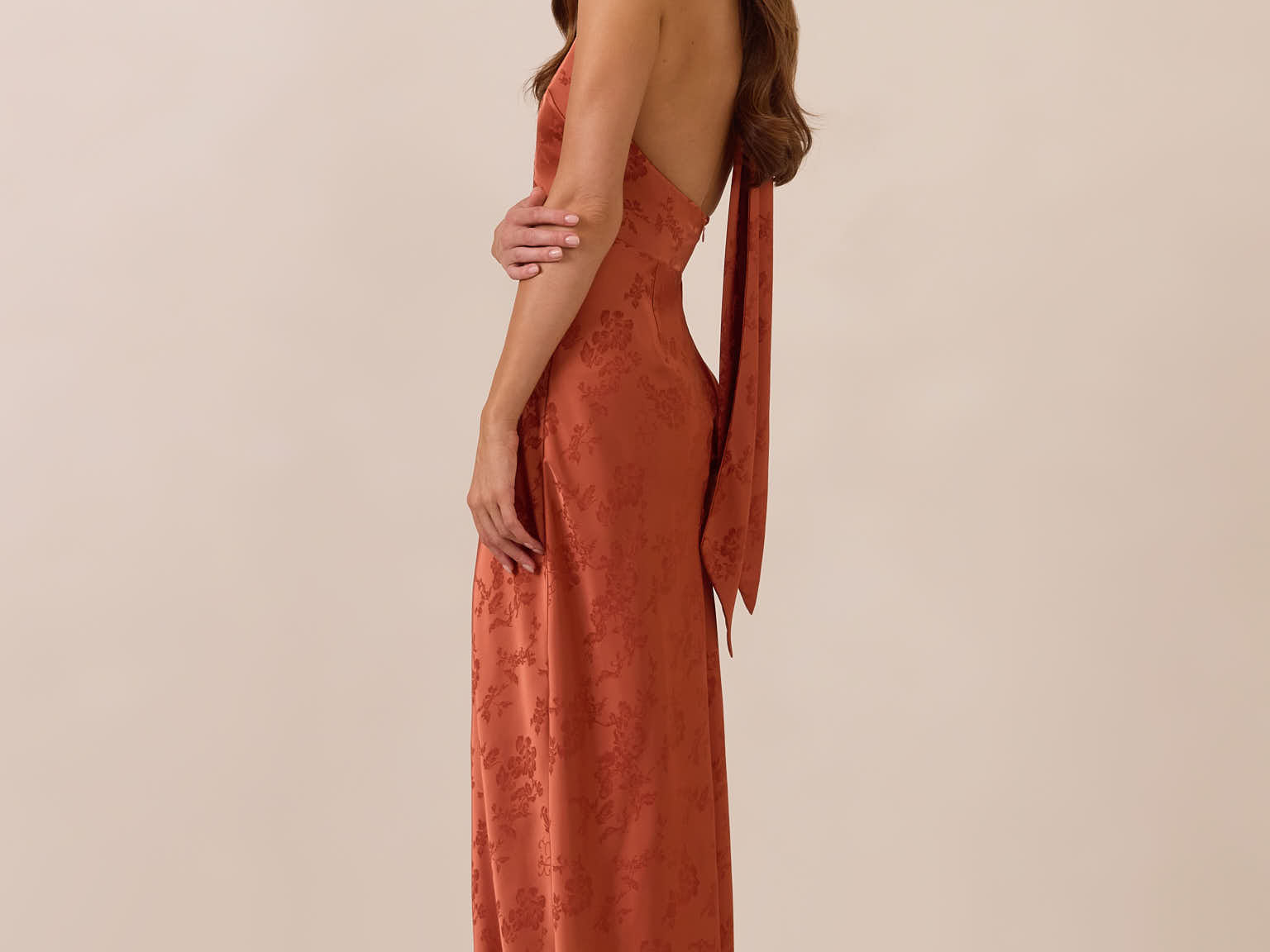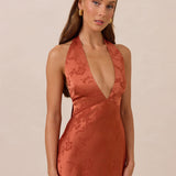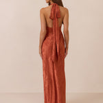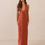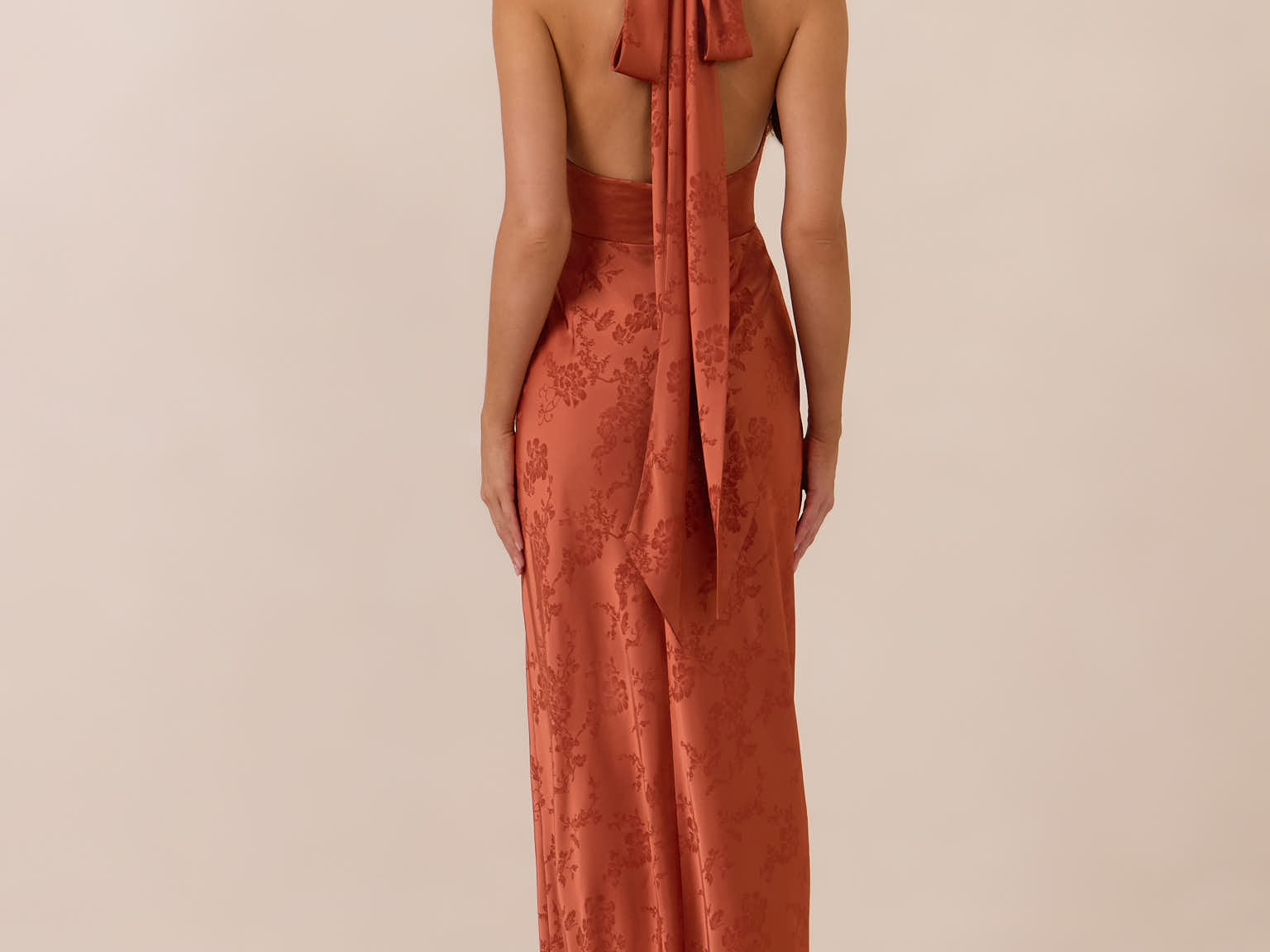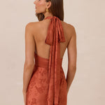 A sleek and versatile silhouette crafted in luxurious Jacquard for a touch of texture and sophistication. Designed for effortless elegance, it features a halter neckline with a dramatic open back and long ties that can be styled as a scarf or knotted for a custom halter look. The bias-cut skirt flows beautifully into a flattering maxi length, creating graceful movement with every step.