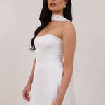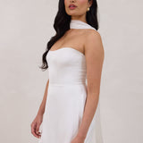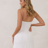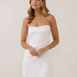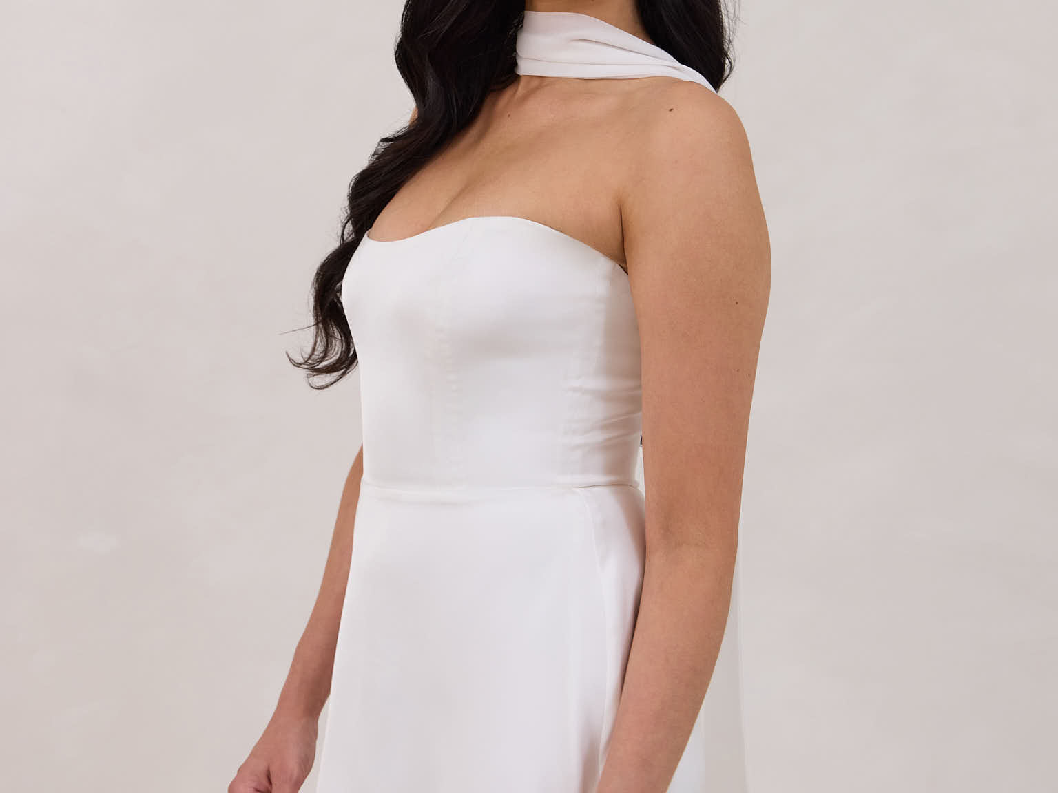 A chic choice, intended to be a versatile base for countless bridal looks. This satin mini features a strapless, boned bodice for a structured fit, with a slim skirt and clean lines for an effortlessly polished finish.