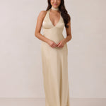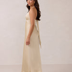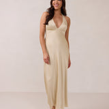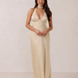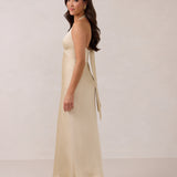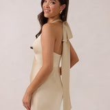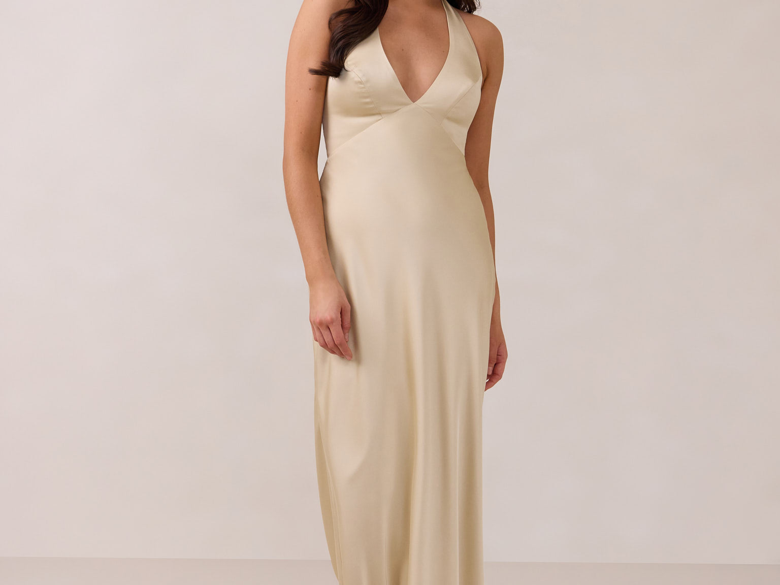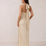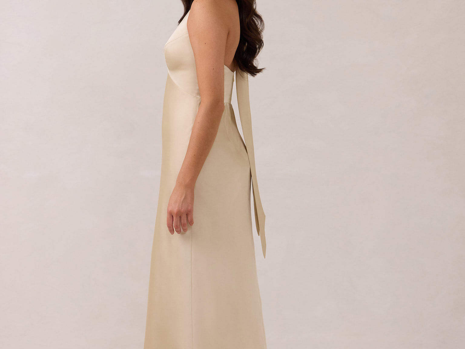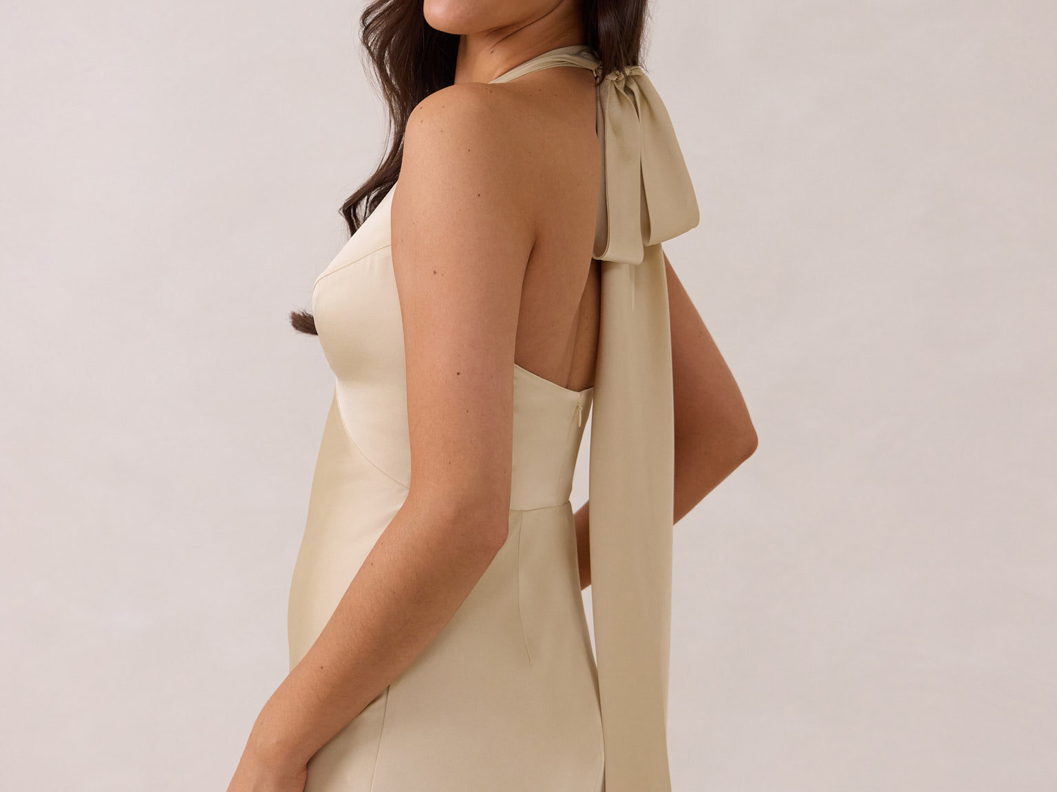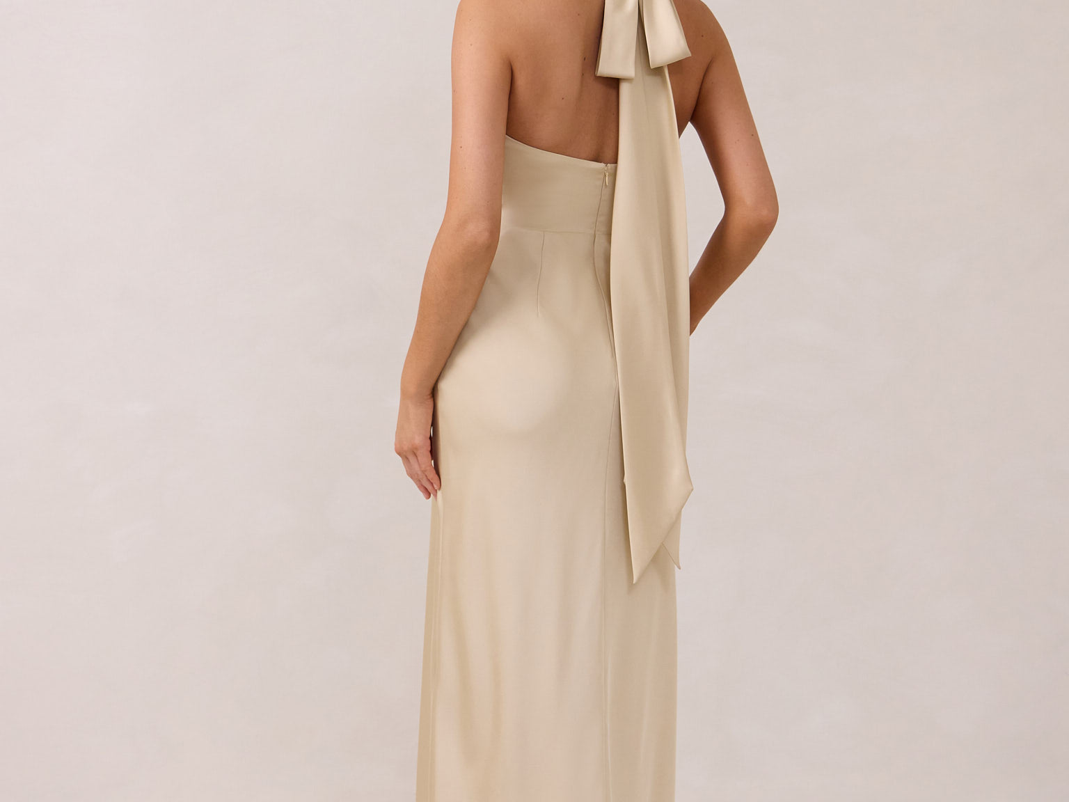 A sleek and versatile silhouette designed for effortless elegance. Featuring a halter neckline with a dramatic open back, it includes long ties that can be styled as a scarf or tied for a custom halter look. The bias-cut skirt flows beautifully for a flattering tea-length fit.