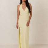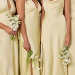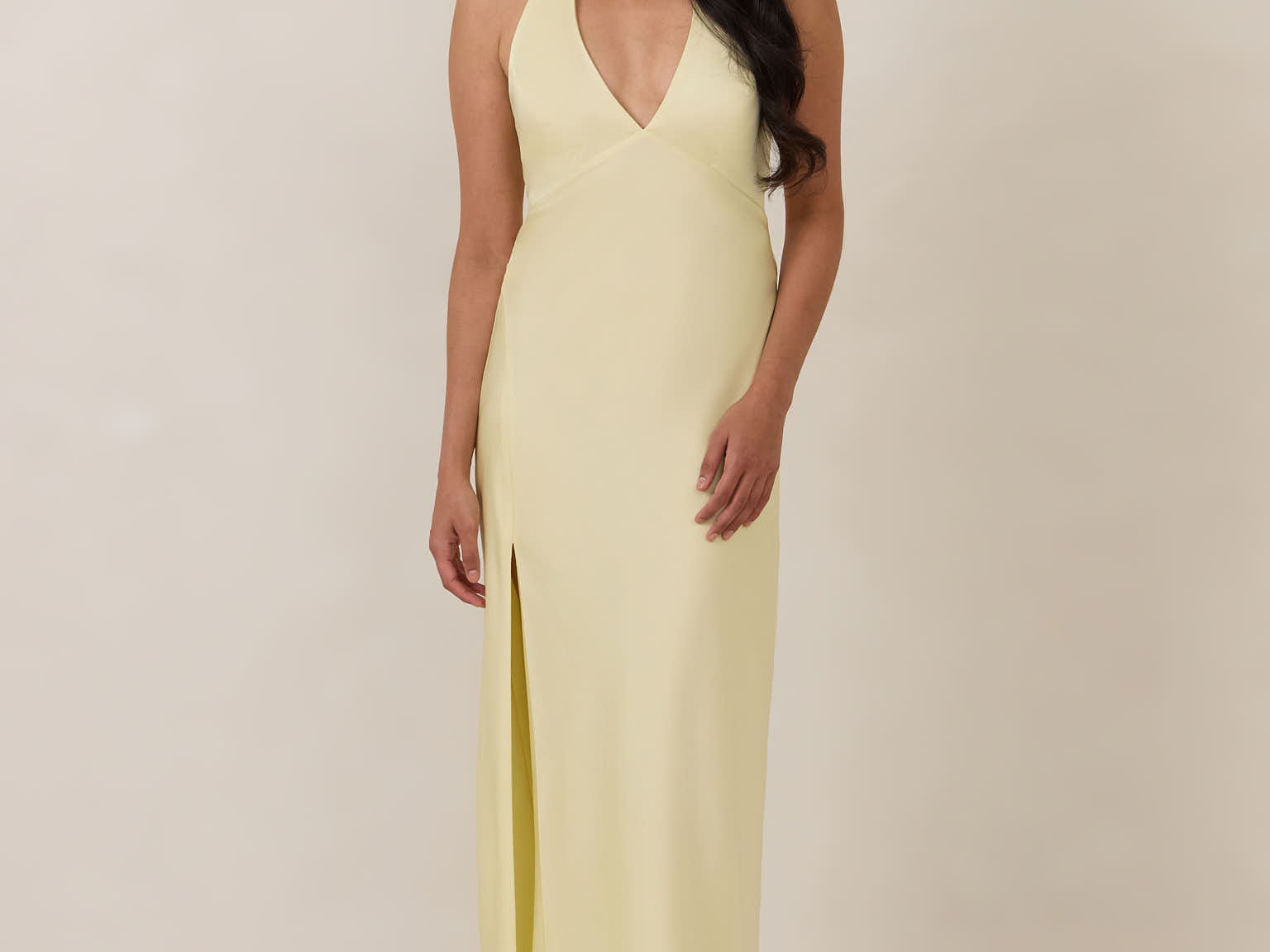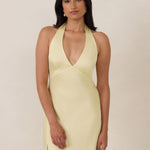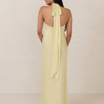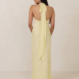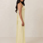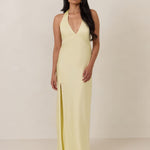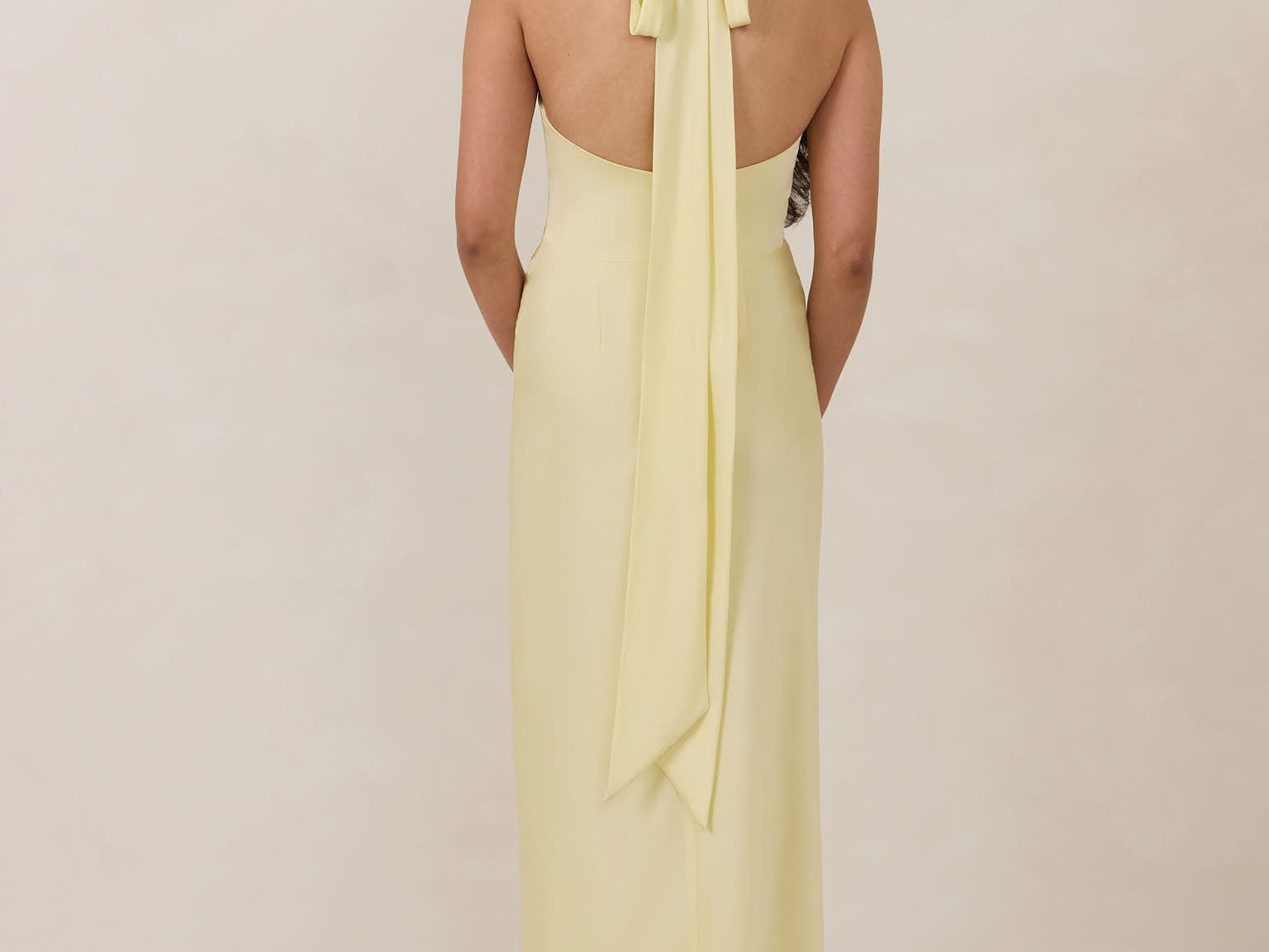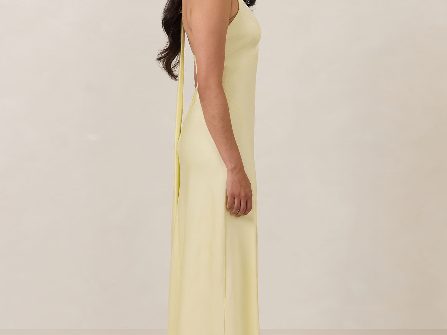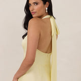 Designed to turn heads. Crafted from our smooth satin, this bust-friendly halter style features long, versatile ties that can be styled in a bow or worn as a neck scarf for a modern touch. Finished with a bias-cut skirt and a subtle slit, this dress effortlessly balances elegance with a bold edge.