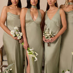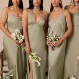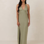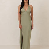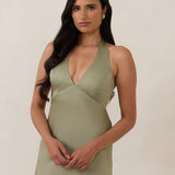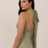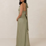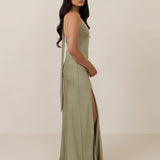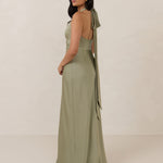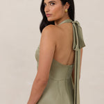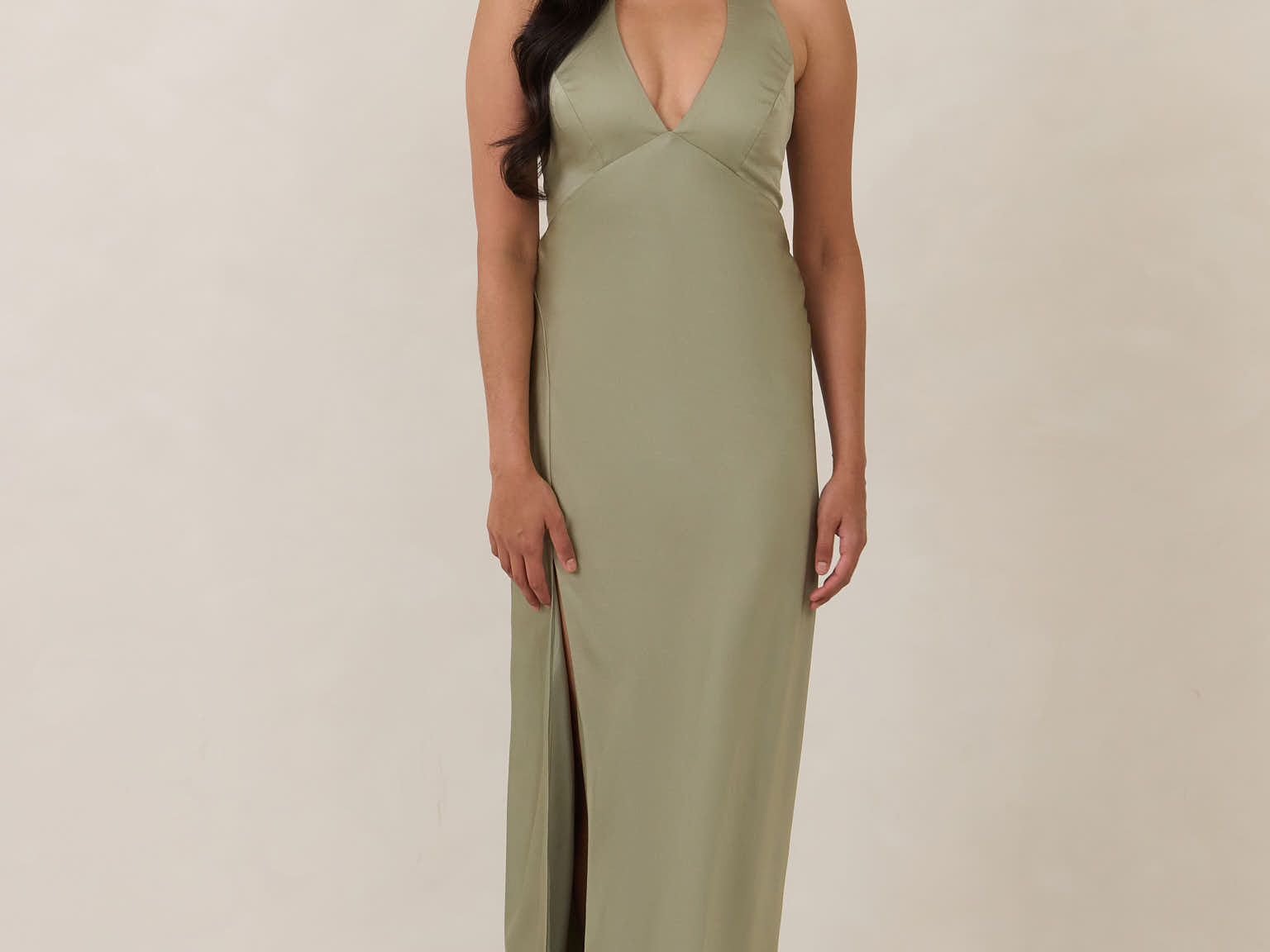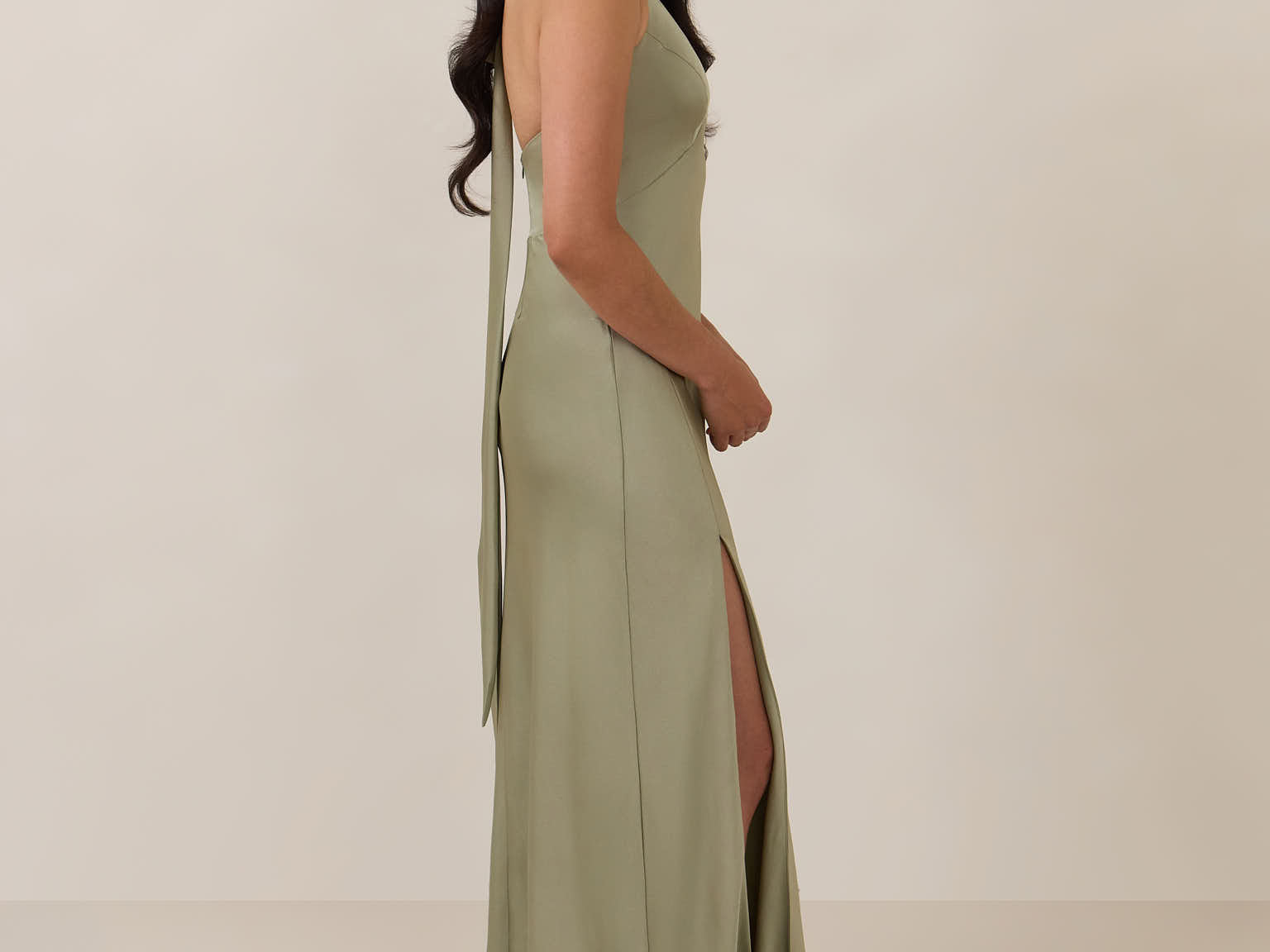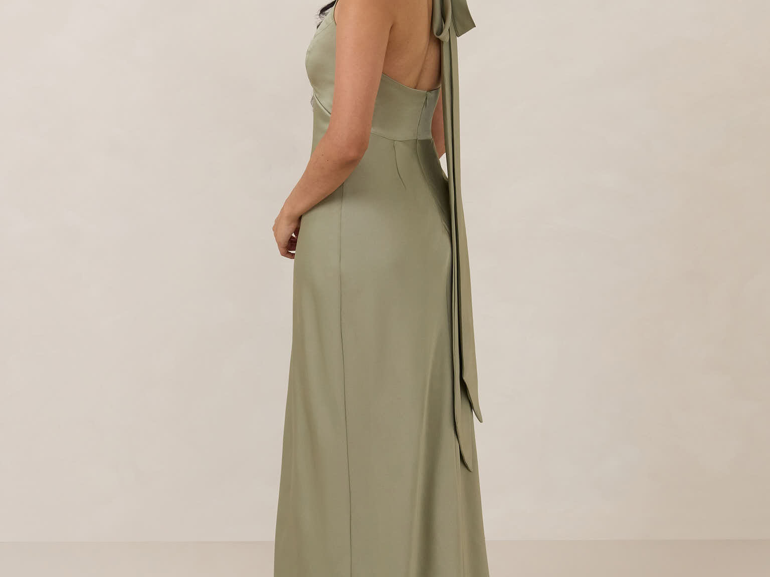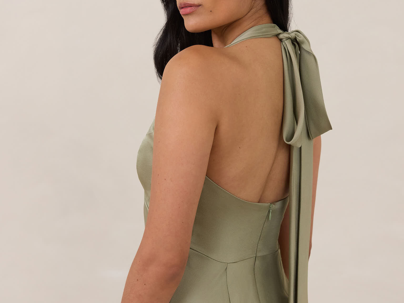 Designed to turn heads. Crafted from our smooth satin, this bust-friendly halter style features long, versatile ties that can be styled in a bow or worn as a neck scarf for a modern touch. Finished with a bias-cut skirt and a subtle slit, this dress effortlessly balances elegance with a bold edge.