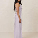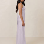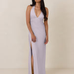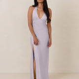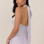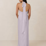 Designed to turn heads. Crafted from our smooth satin, this bust-friendly halter style features long, versatile ties that can be styled in a bow or worn as a neck scarf for a modern touch. Finished with a bias-cut skirt and a subtle slit, this dress effortlessly balances elegance with a bold edge.
