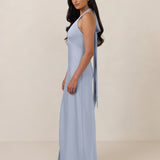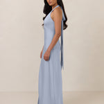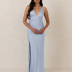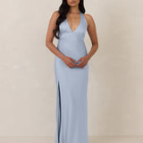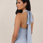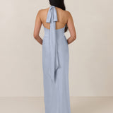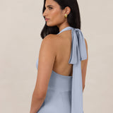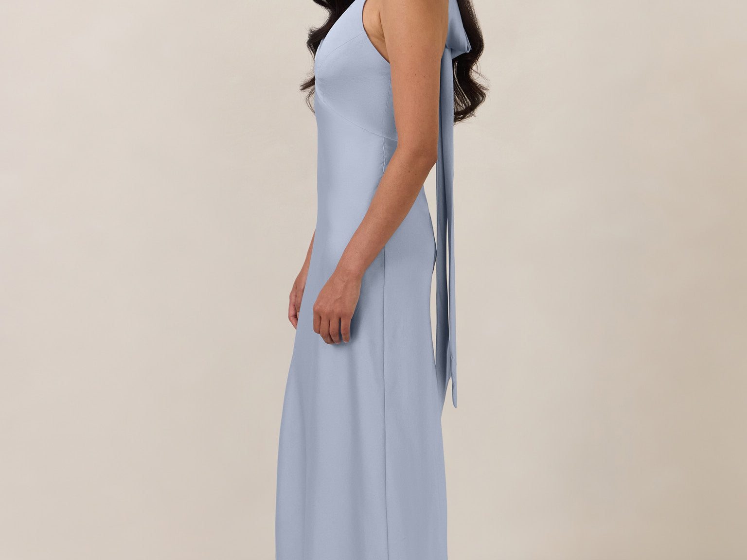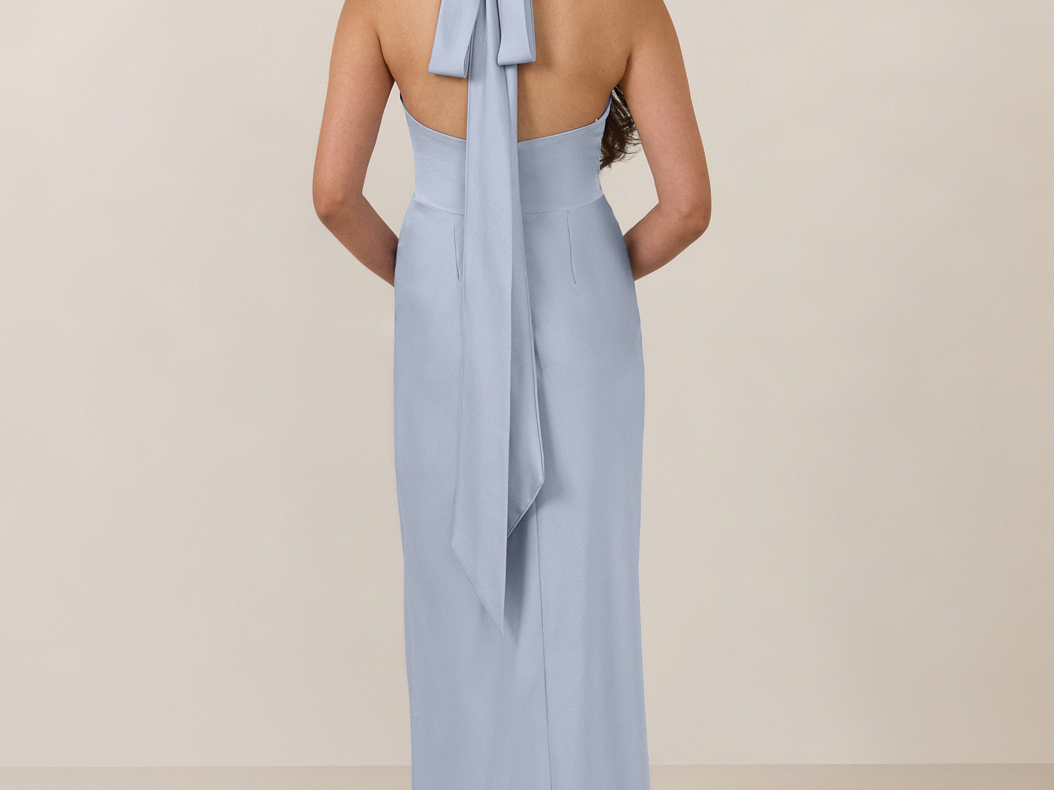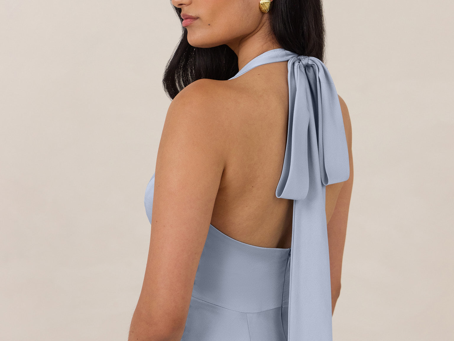 Designed to turn heads. Crafted from our smooth satin, this bust-friendly halter style features long, versatile ties that can be styled in a bow or worn as a neck scarf for a modern touch. Finished with a bias-cut skirt and a subtle slit, this dress effortlessly balances elegance with a bold edge.