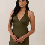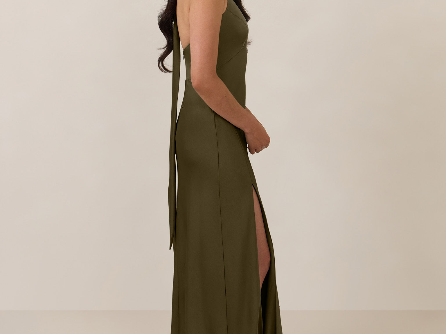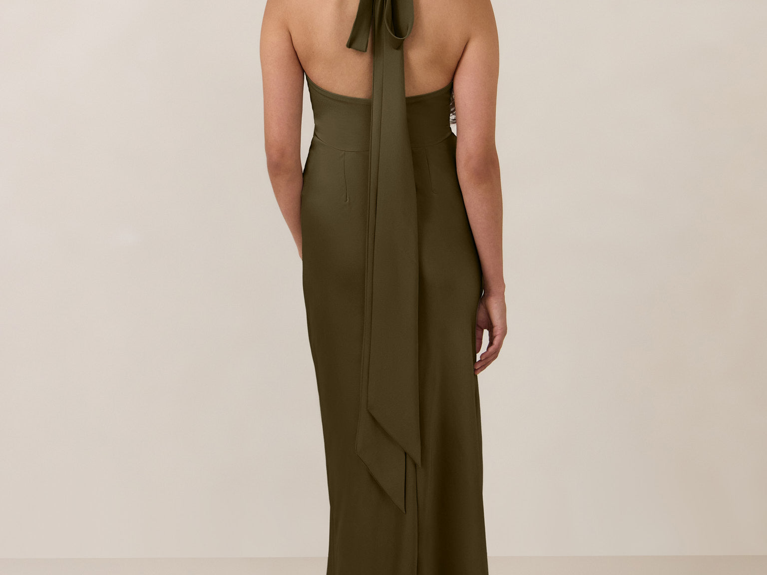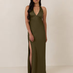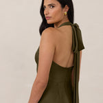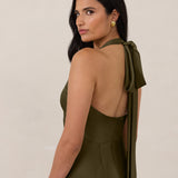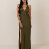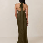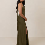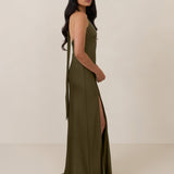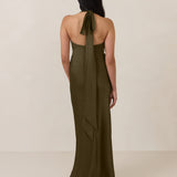 Designed to turn heads. Crafted from our smooth satin, this bust-friendly halter style features long, versatile ties that can be styled in a bow or worn as a neck scarf for a modern touch. Finished with a bias-cut skirt and a subtle slit, this dress effortlessly balances elegance with a bold edge.