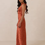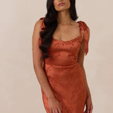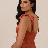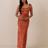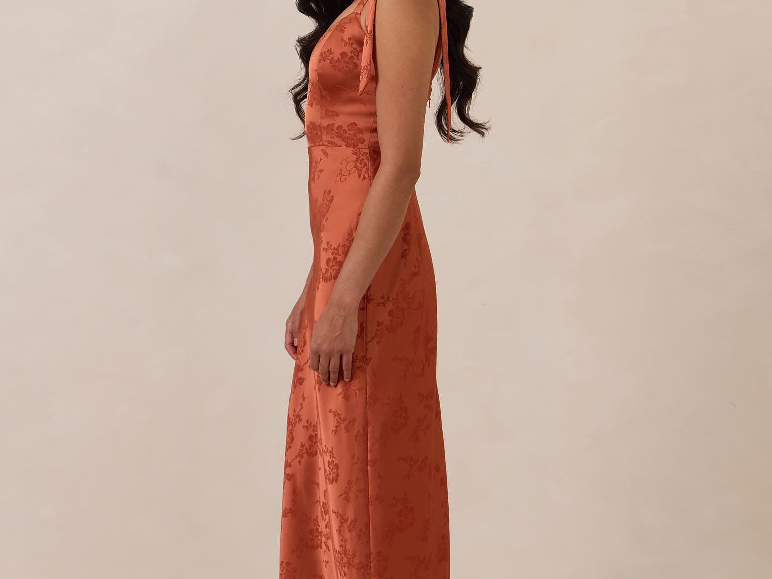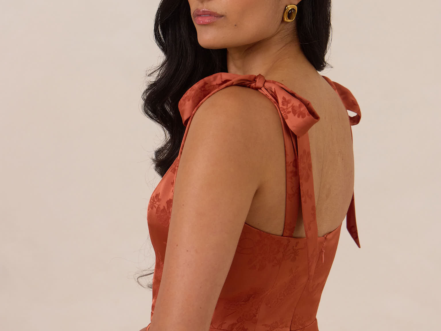 Crafted from luxurious Jacquard satin, this dress features feminine tie straps and a flattering bias-cut skirt, offering a flattering silhouette with timeless appeal.