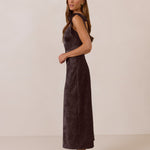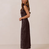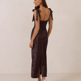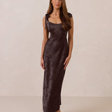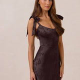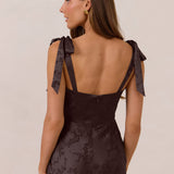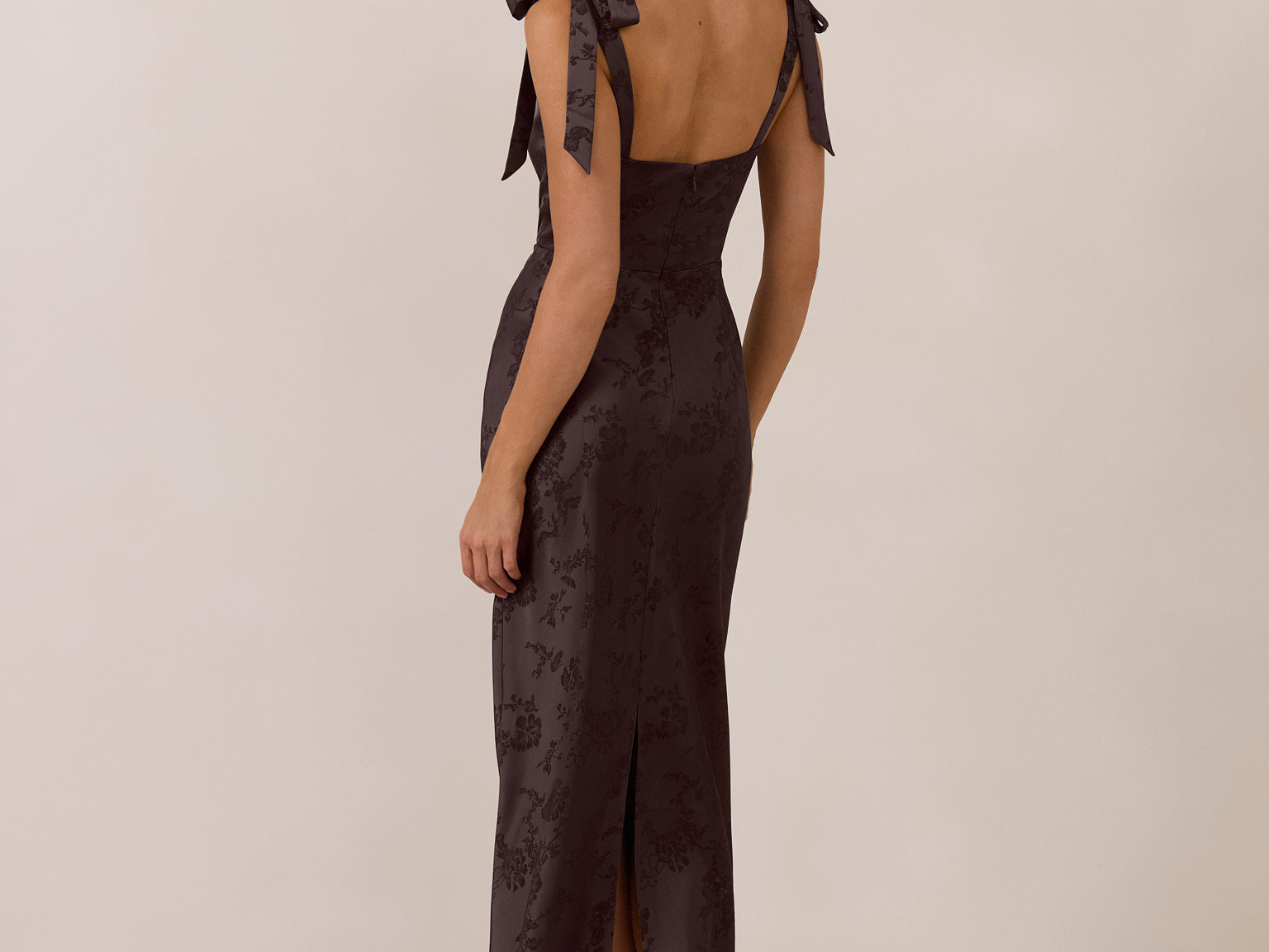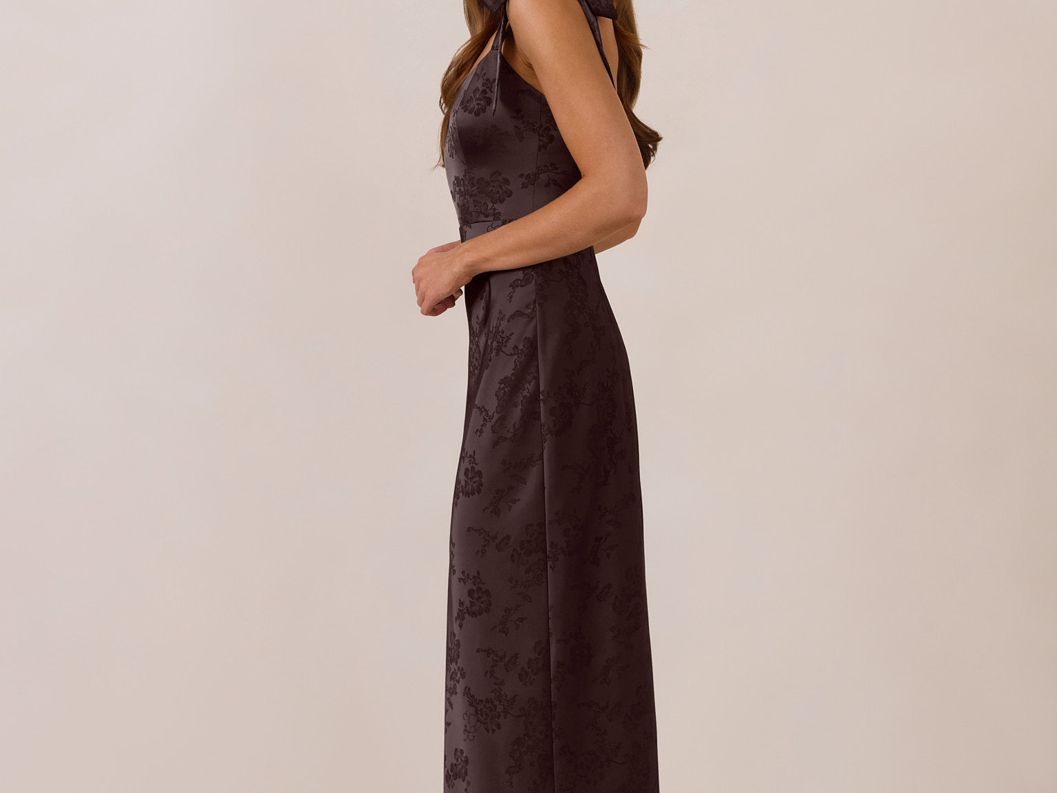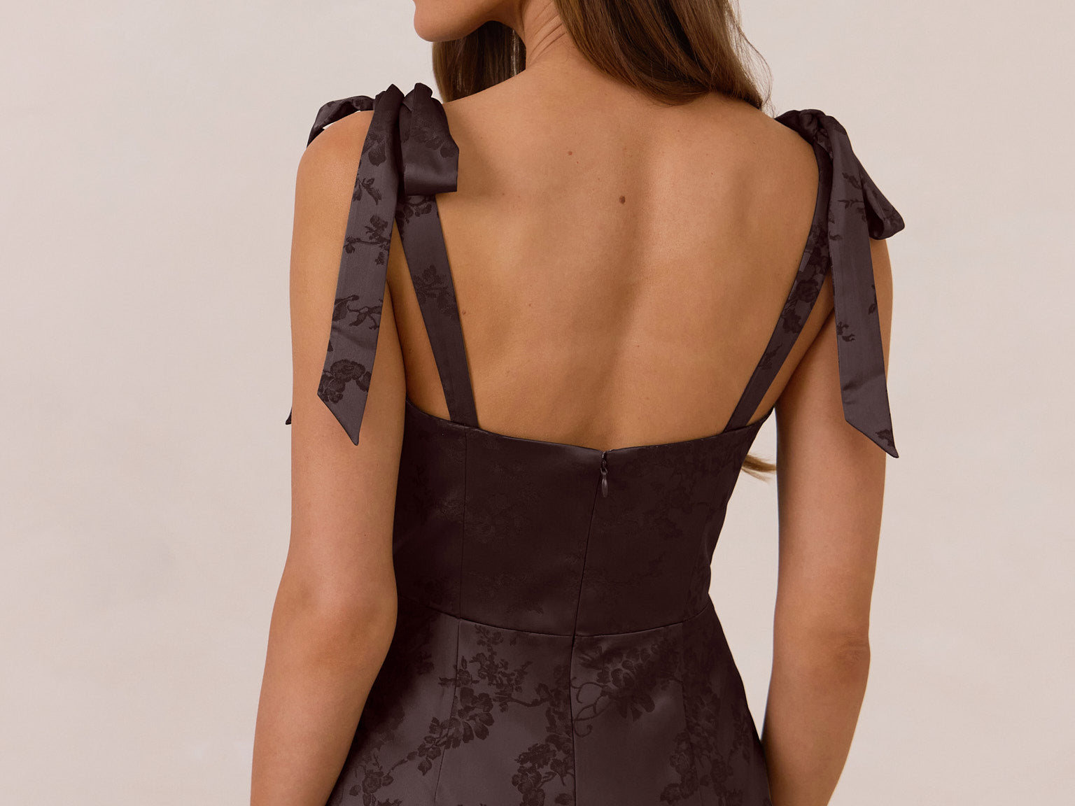 Crafted from luxurious Jacquard satin, this dress features feminine tie straps and a flattering bias-cut skirt, offering a flattering silhouette with timeless appeal.