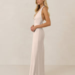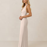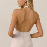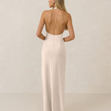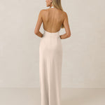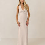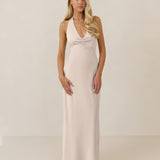 The perfect balance between bold and refined, this satin halter dress is designed to turn heads with quiet confidence. Featuring a plunging halter neckline that highlights the neck and collarbone, it's finished with a cinched detail at the bust to enhance shape and create a beautifully flattering silhouette.