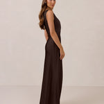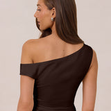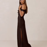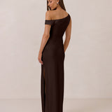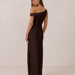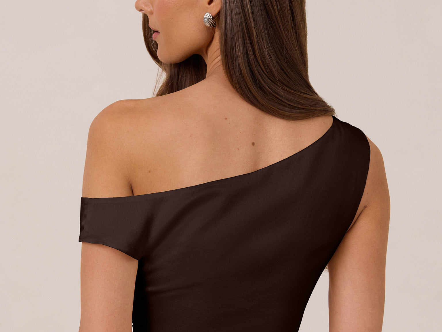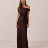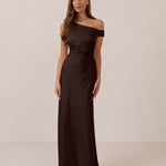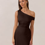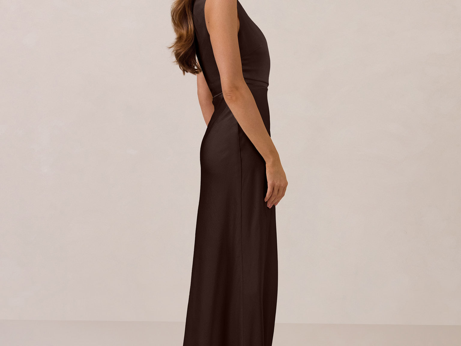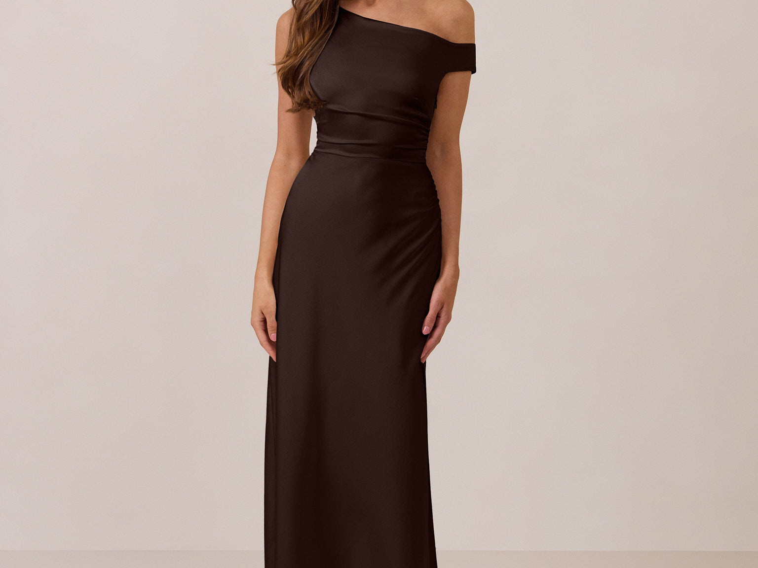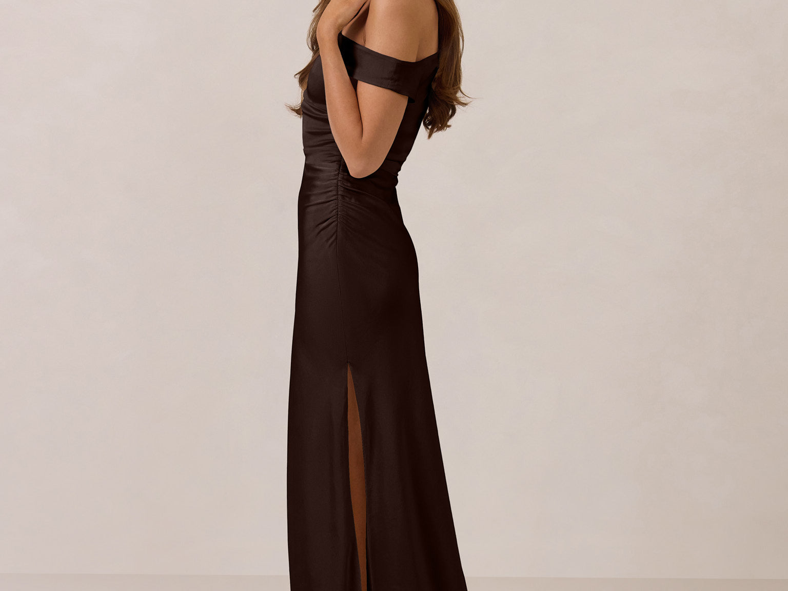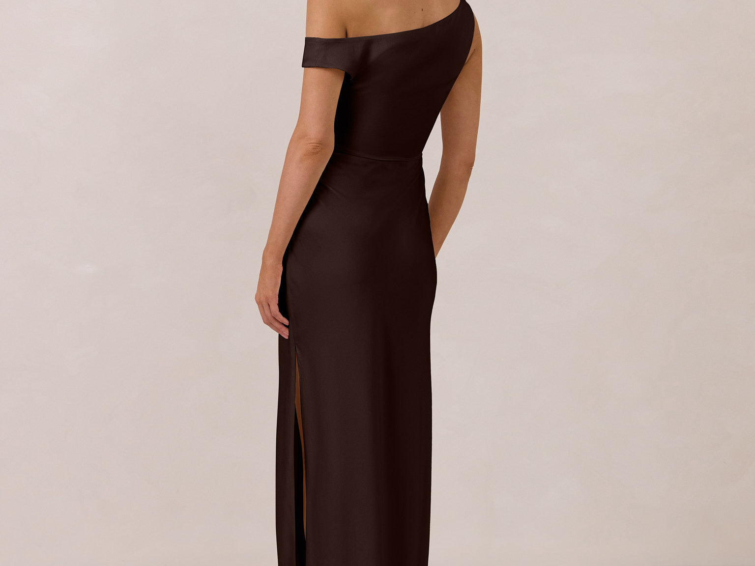 We love an asymmetrical neckline. This full-length dress strikes the perfect balance between modern sophistication and a flattering fit with its elegant silhouette, slightly gathered bodice, and a stylish side slit for a touch of effortless elegance.