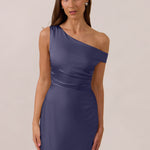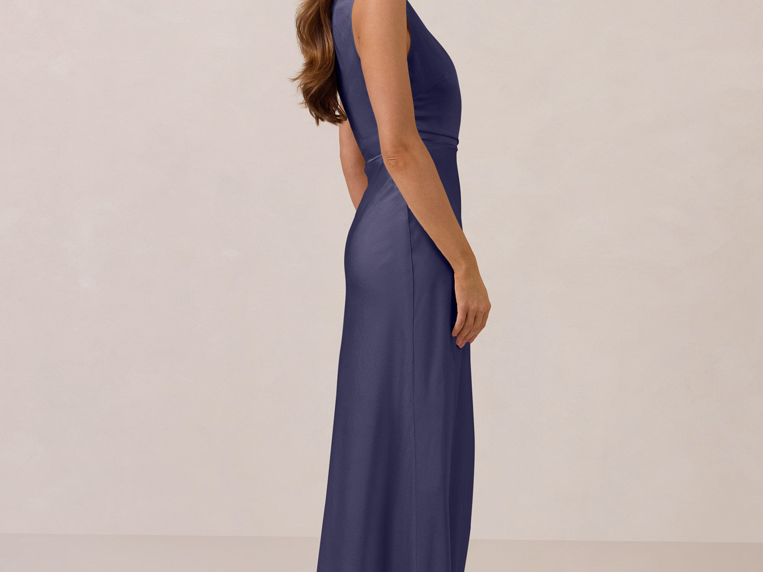 We love an asymmetrical neckline. This full-length dress strikes the perfect balance between modern sophistication and a flattering fit with its elegant silhouette, slightly gathered bodice, and a stylish side slit for a touch of effortless elegance.
