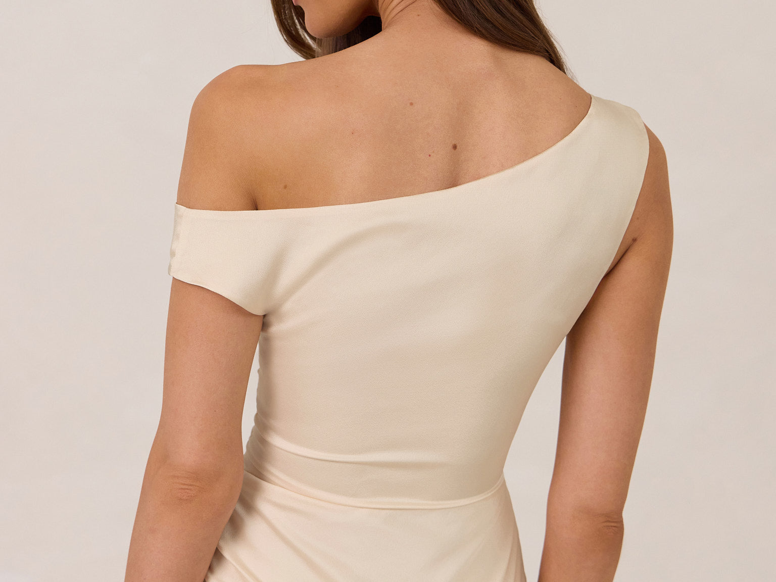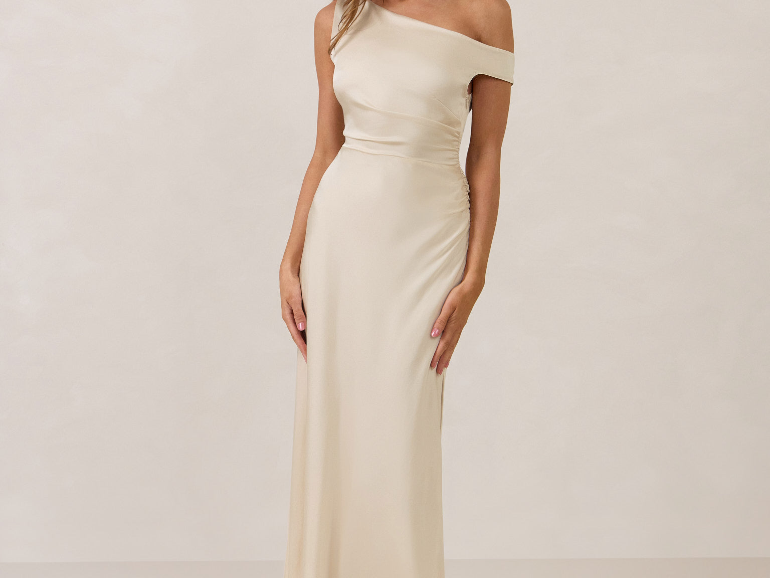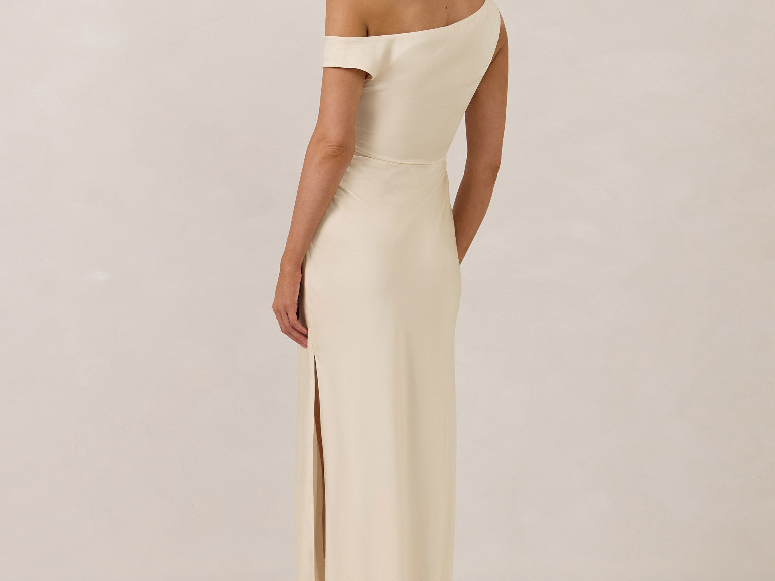 We love an asymmetrical neckline. This full-length dress strikes the perfect balance between modern sophistication and a flattering fit with its elegant silhouette, slightly gathered bodice, and a stylish side slit for a touch of effortless elegance.
