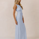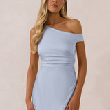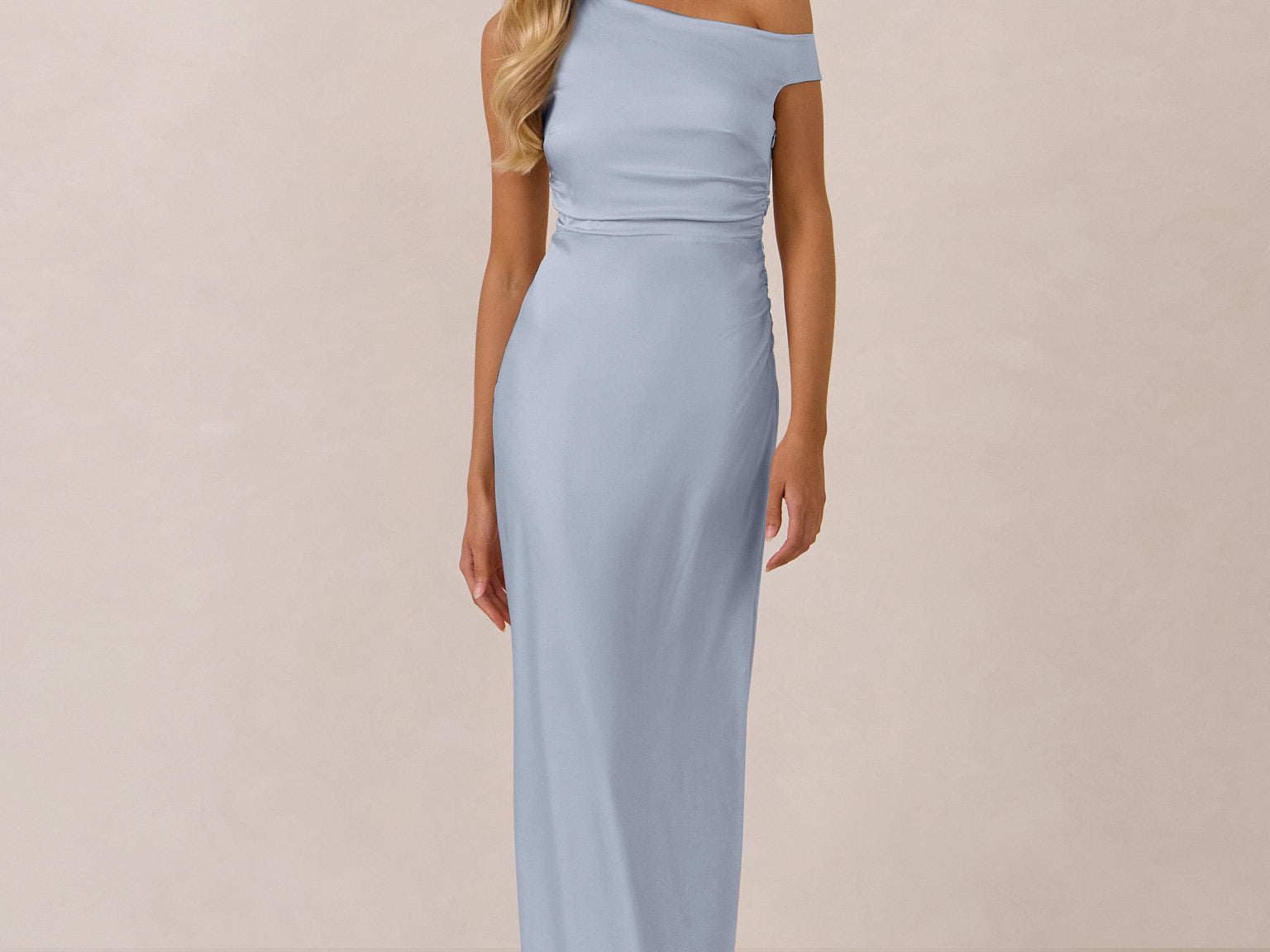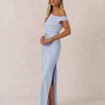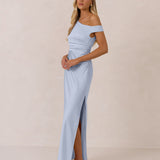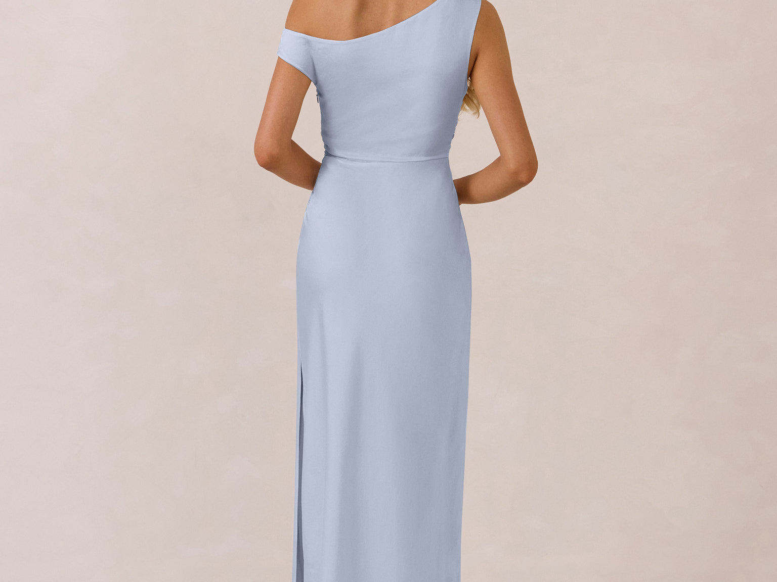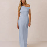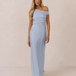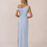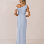 We love an asymmetrical neckline. This full-length dress strikes the perfect balance between modern sophistication and a flattering fit with its elegant silhouette, slightly gathered bodice, and a stylish side slit for a touch of effortless elegance.