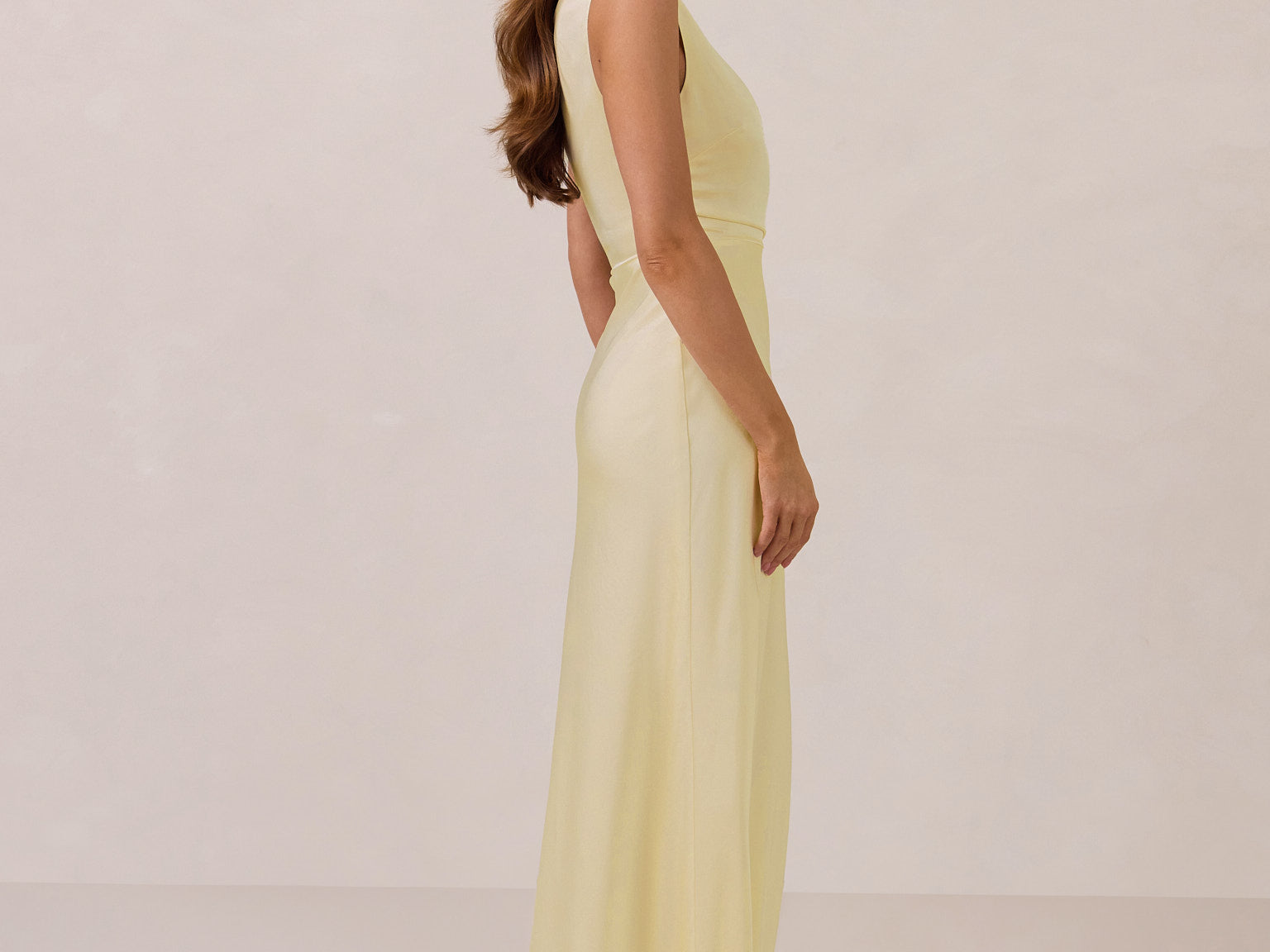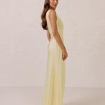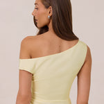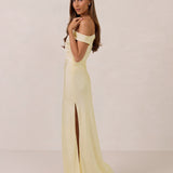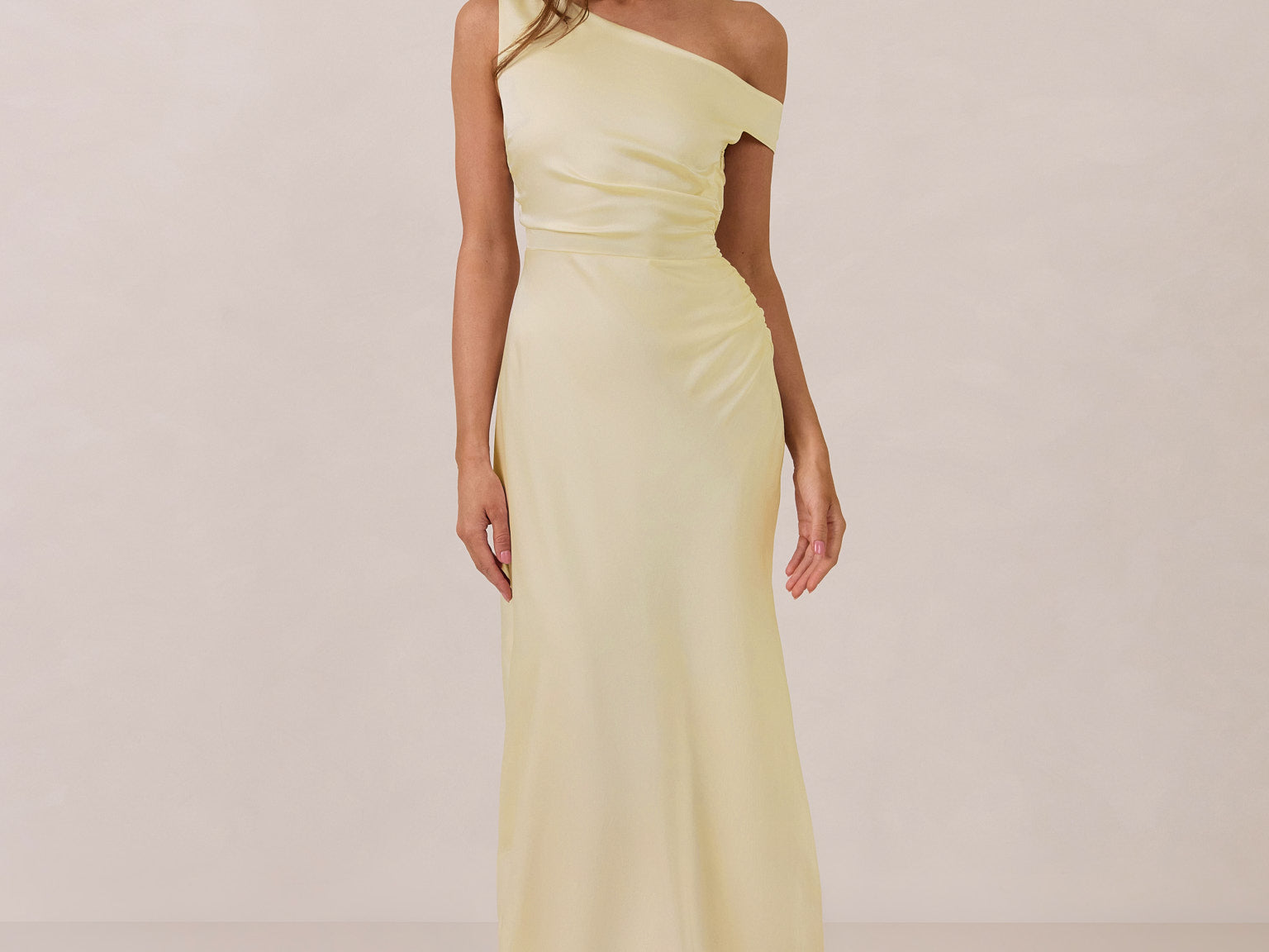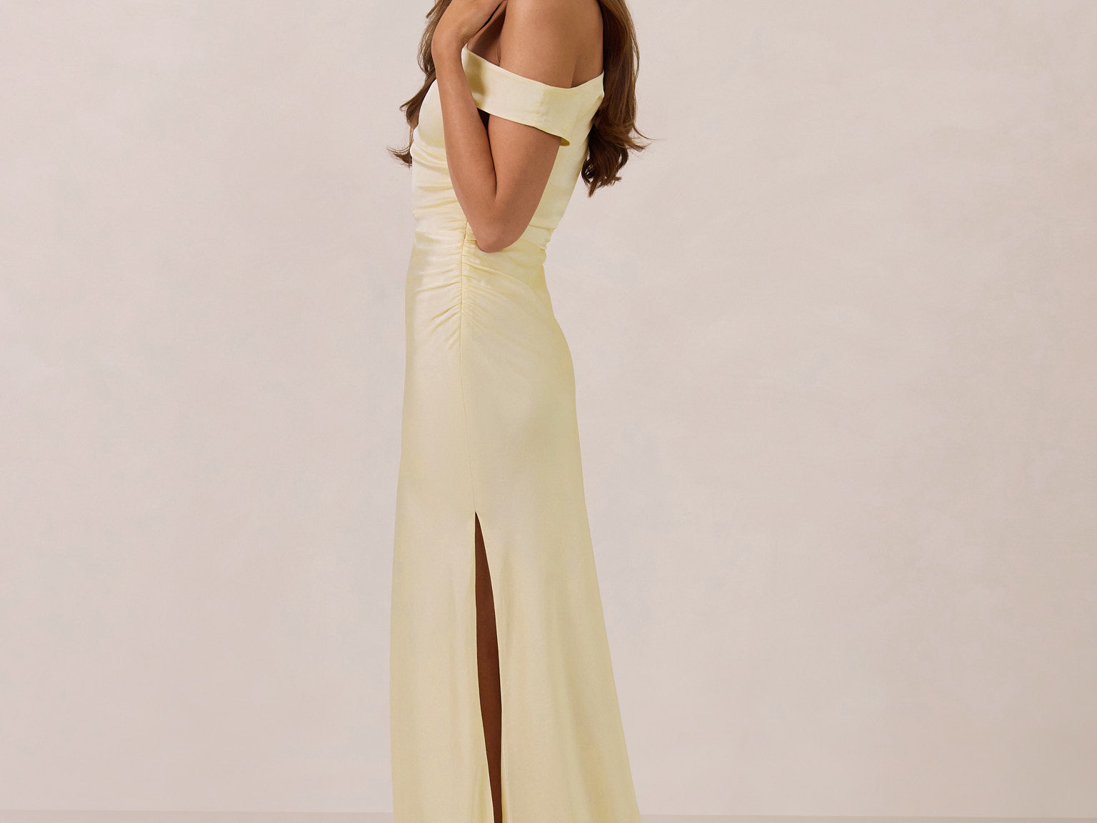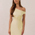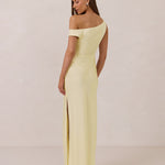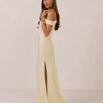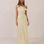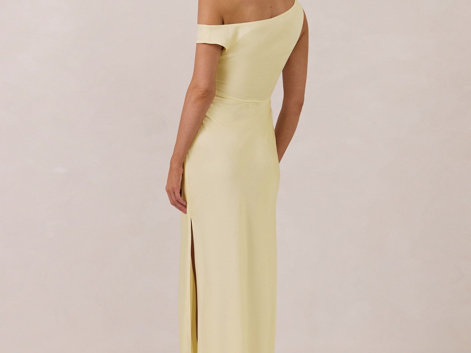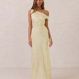 We love an asymmetrical neckline. This full-length dress strikes the perfect balance between modern sophistication and a flattering fit with its elegant silhouette, slightly gathered bodice, and a stylish side slit for a touch of effortless elegance.