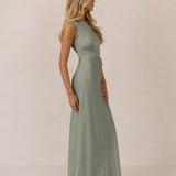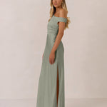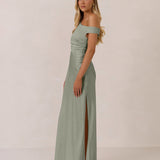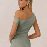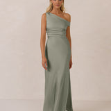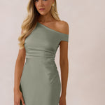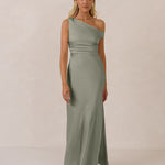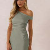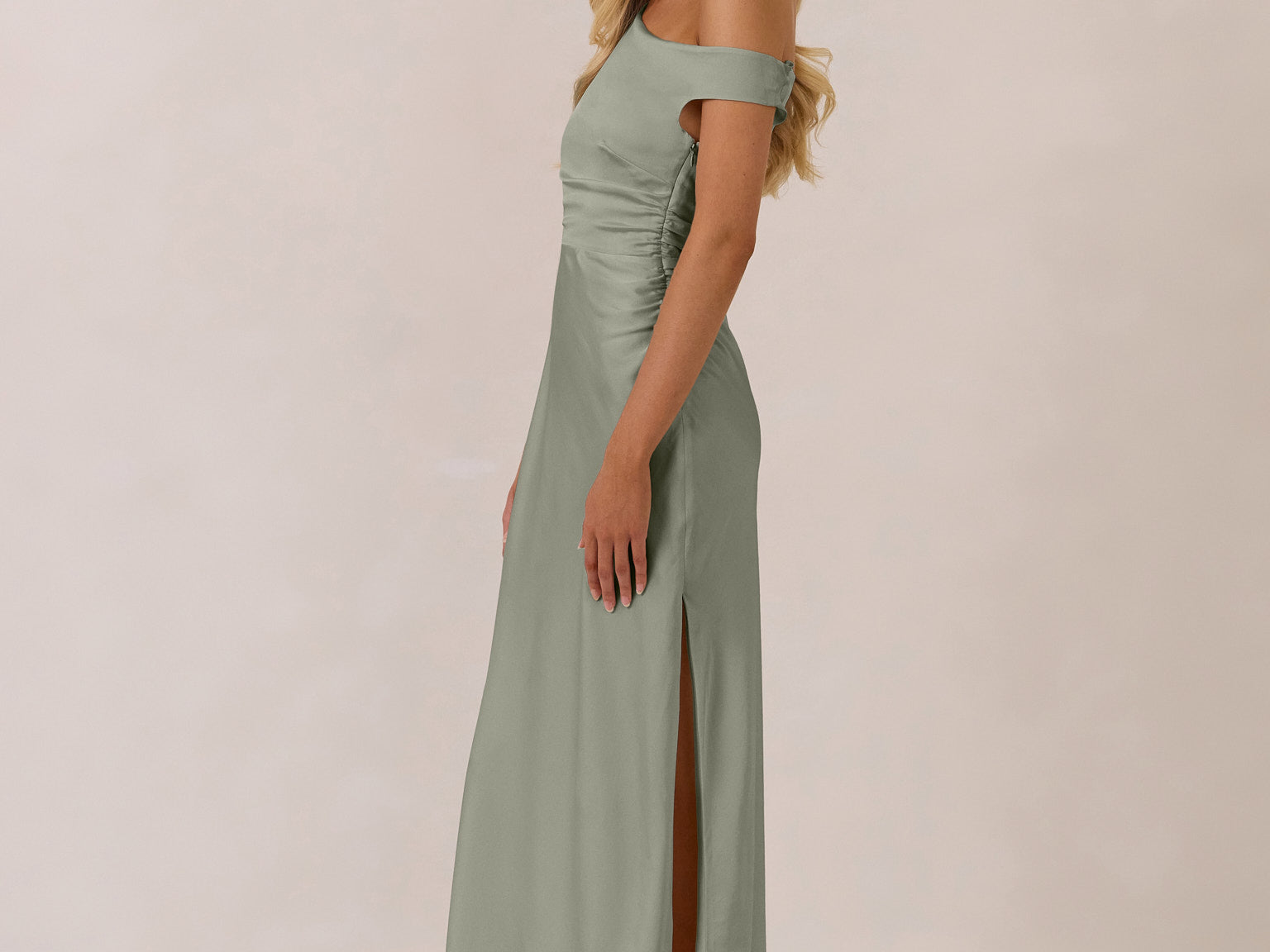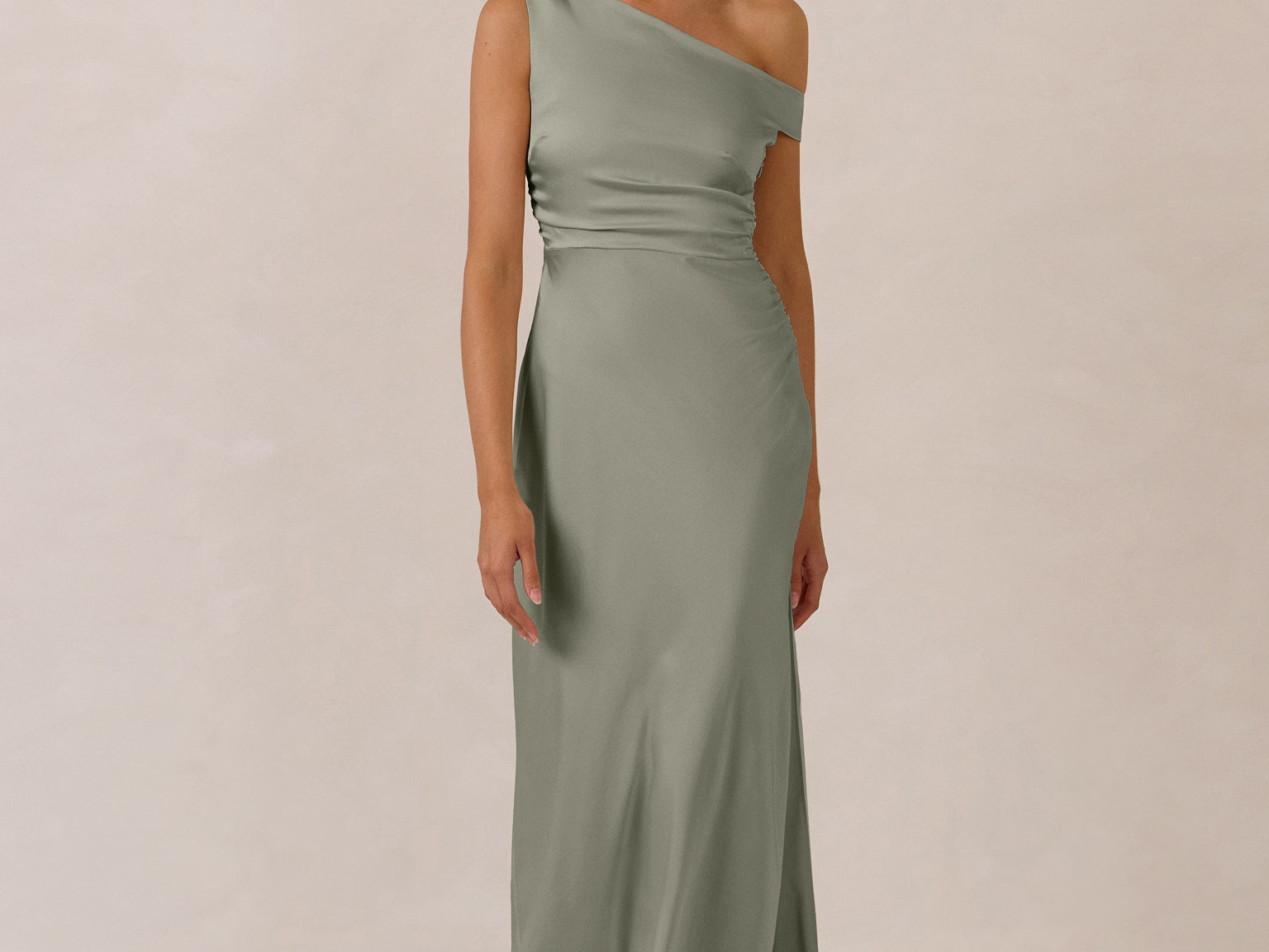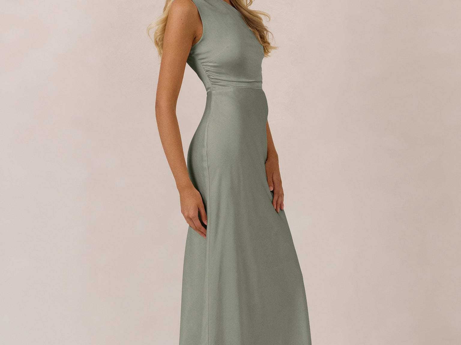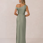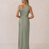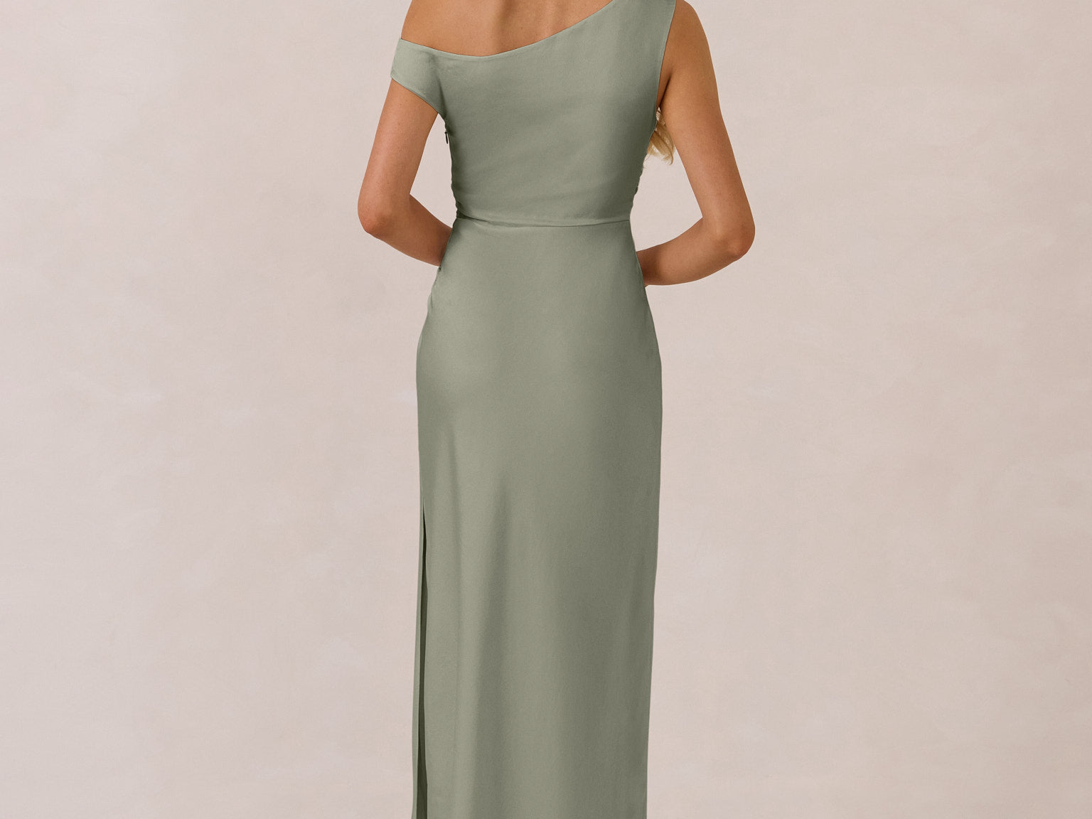 We love an asymmetrical neckline. This full-length dress strikes the perfect balance between modern sophistication and a flattering fit with its elegant silhouette, slightly gathered bodice, and a stylish side slit for a touch of effortless elegance.