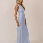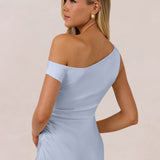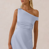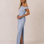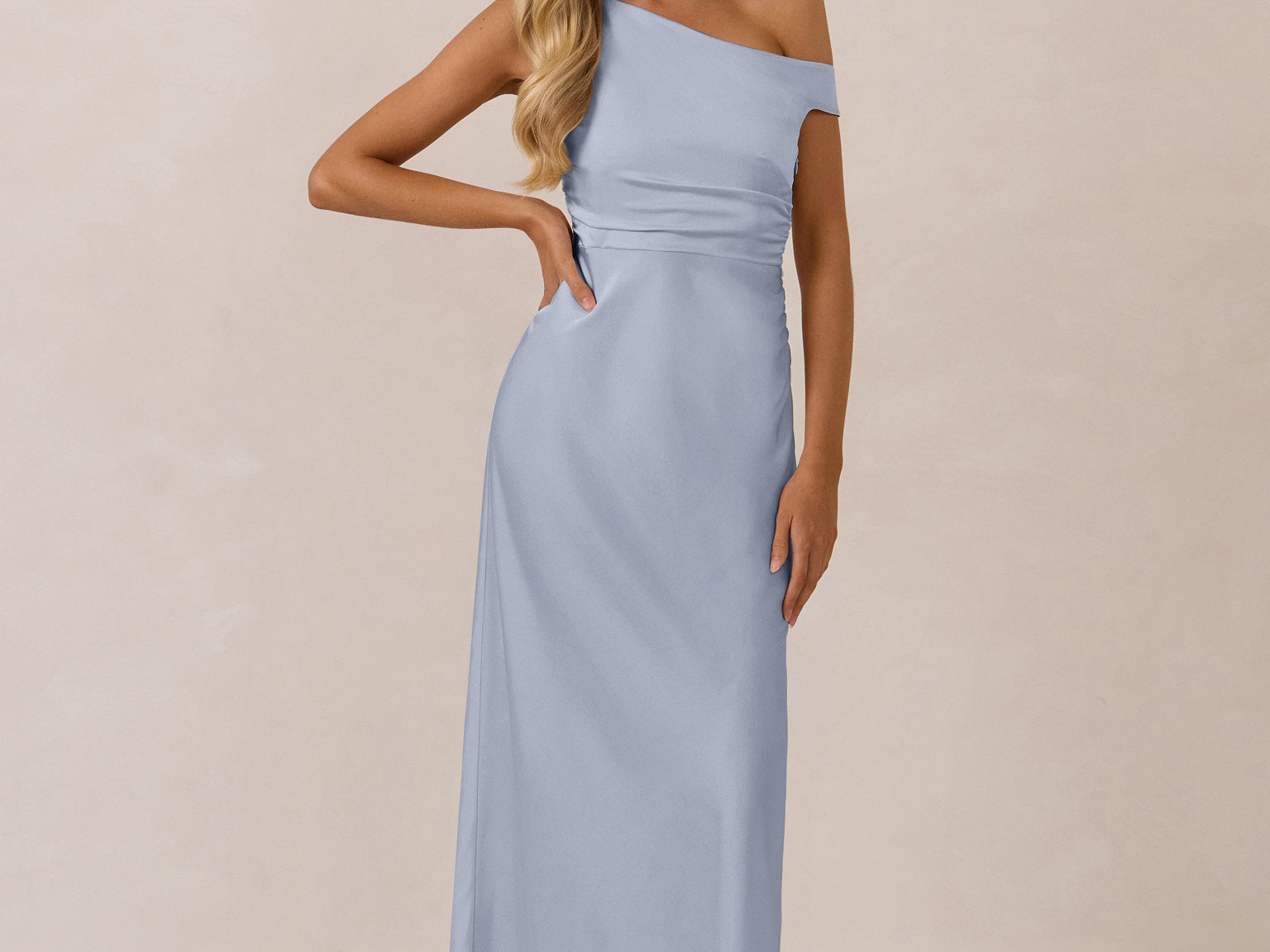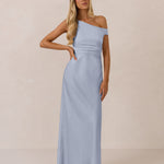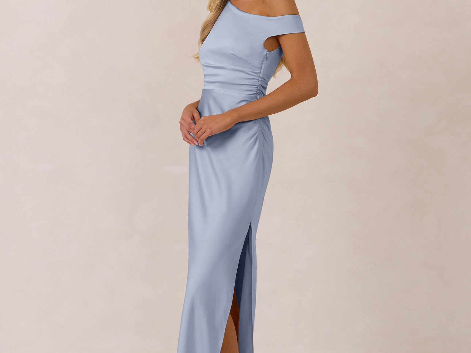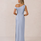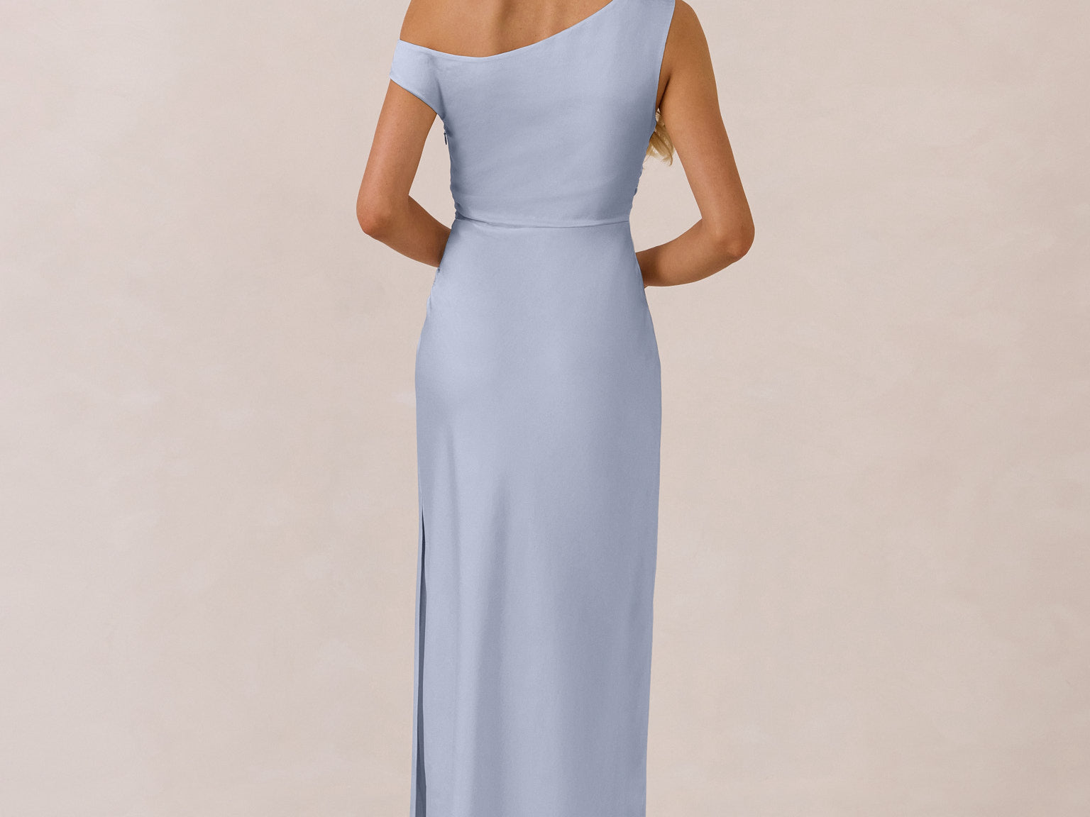 We love an asymmetrical neckline. This full-length dress strikes the perfect balance between modern sophistication and a flattering fit with its elegant silhouette, slightly gathered bodice, and a stylish side slit for a touch of effortless elegance.