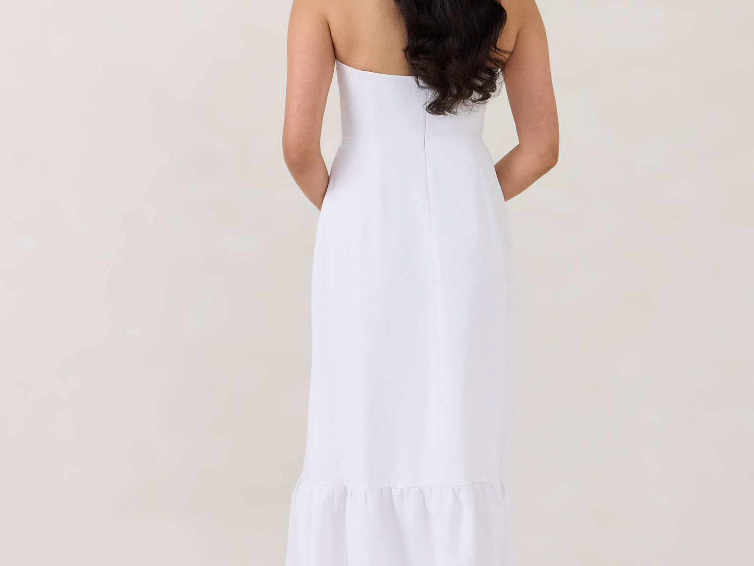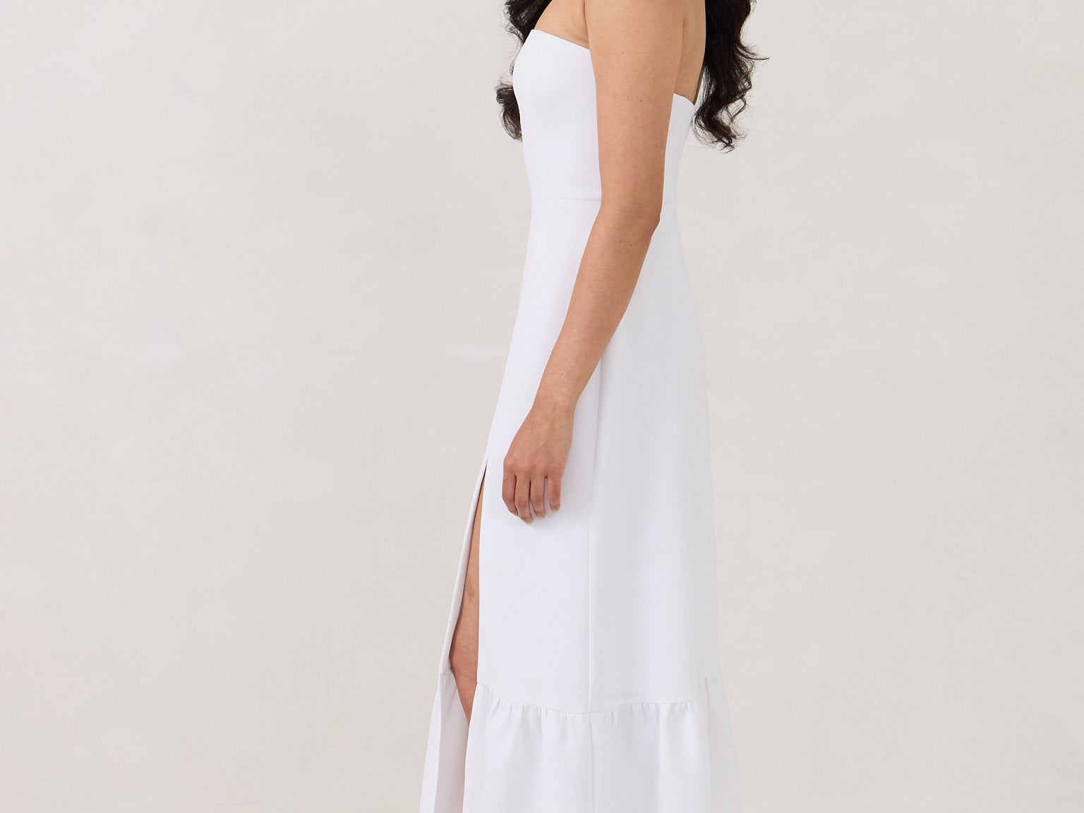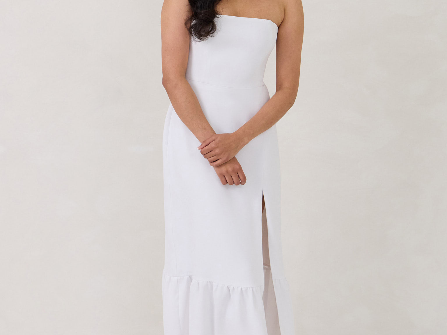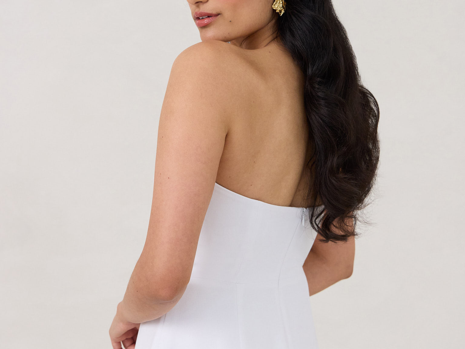 So easy to wear. The clean lines of the bodice, and the flirty skirt make for the perfect addition to your wedding wardrobe.