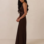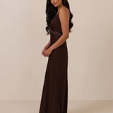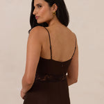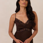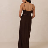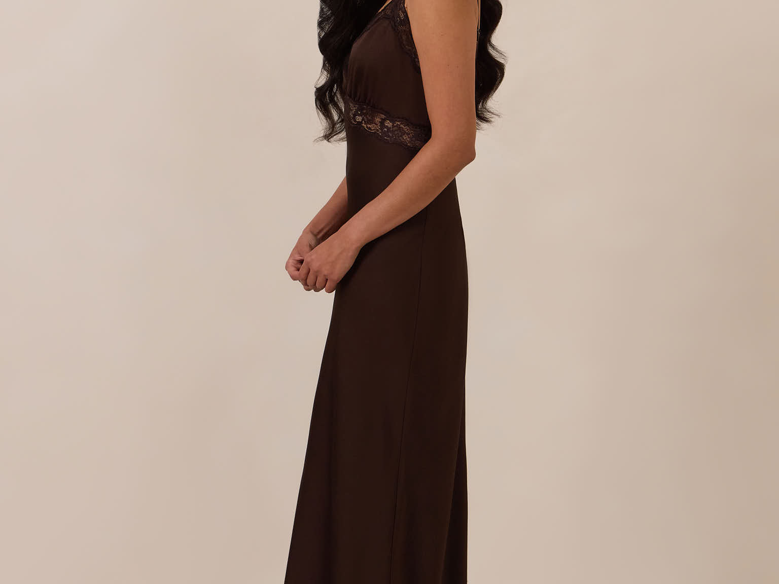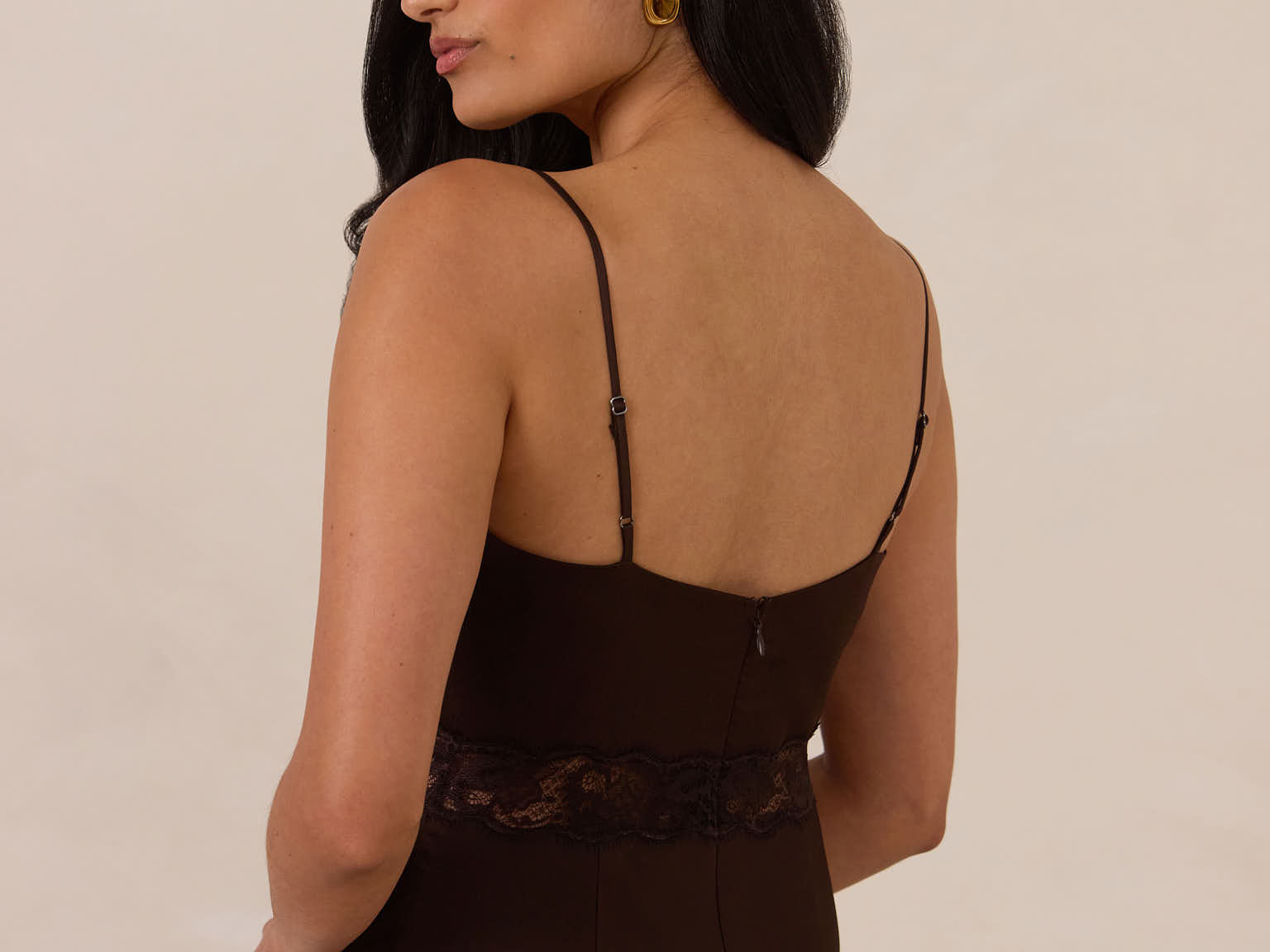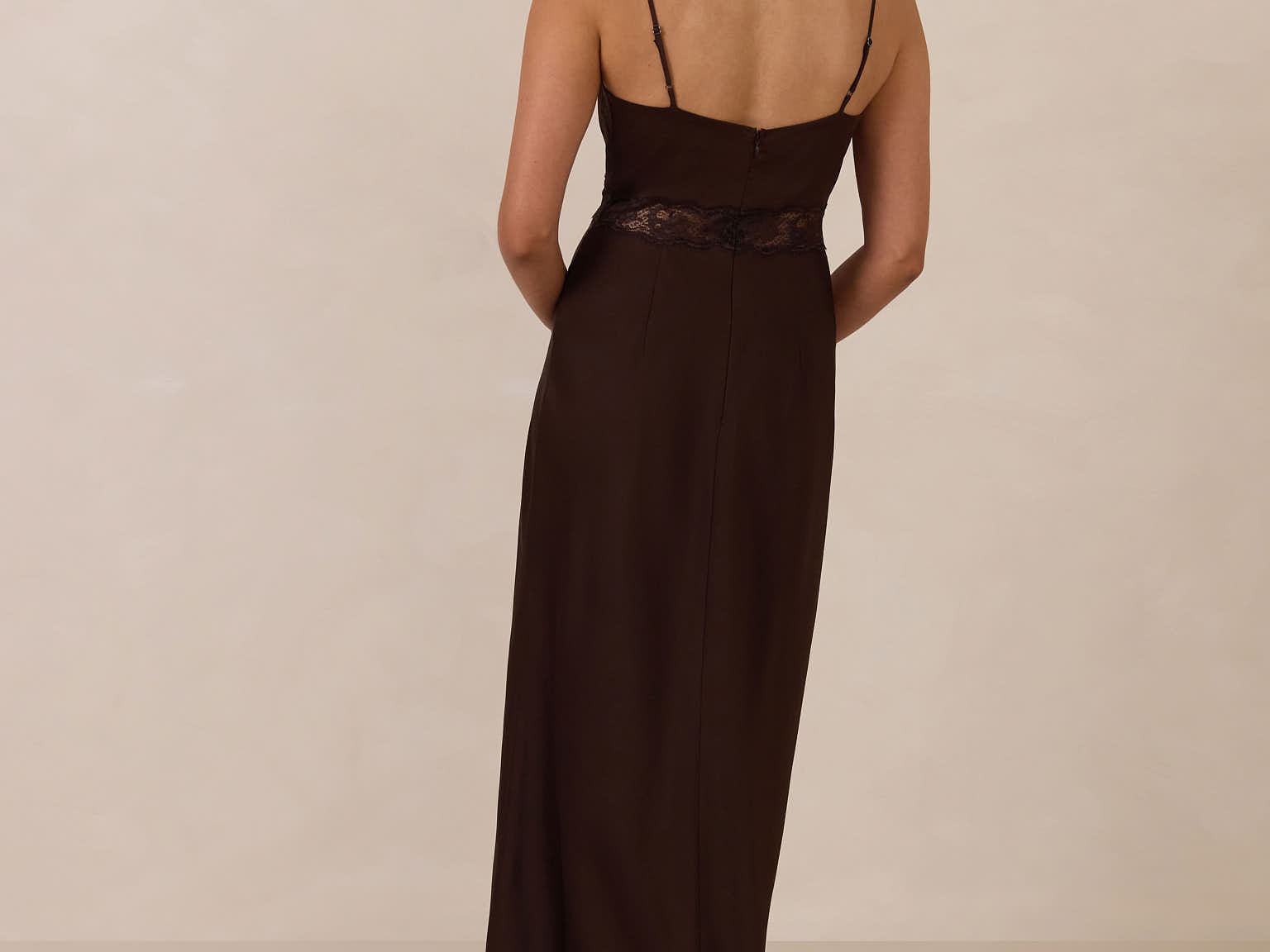 The Theodora is an elevated take on the classic slip dress, made from satin and cut on a bias for an elegant drape. It features a deep lace-trimmed neckline for a romantic touch. This full-length dress offers a fitted silhouette with adjustable straps and a discreet side zip, creating an effortlessly impactful look.