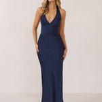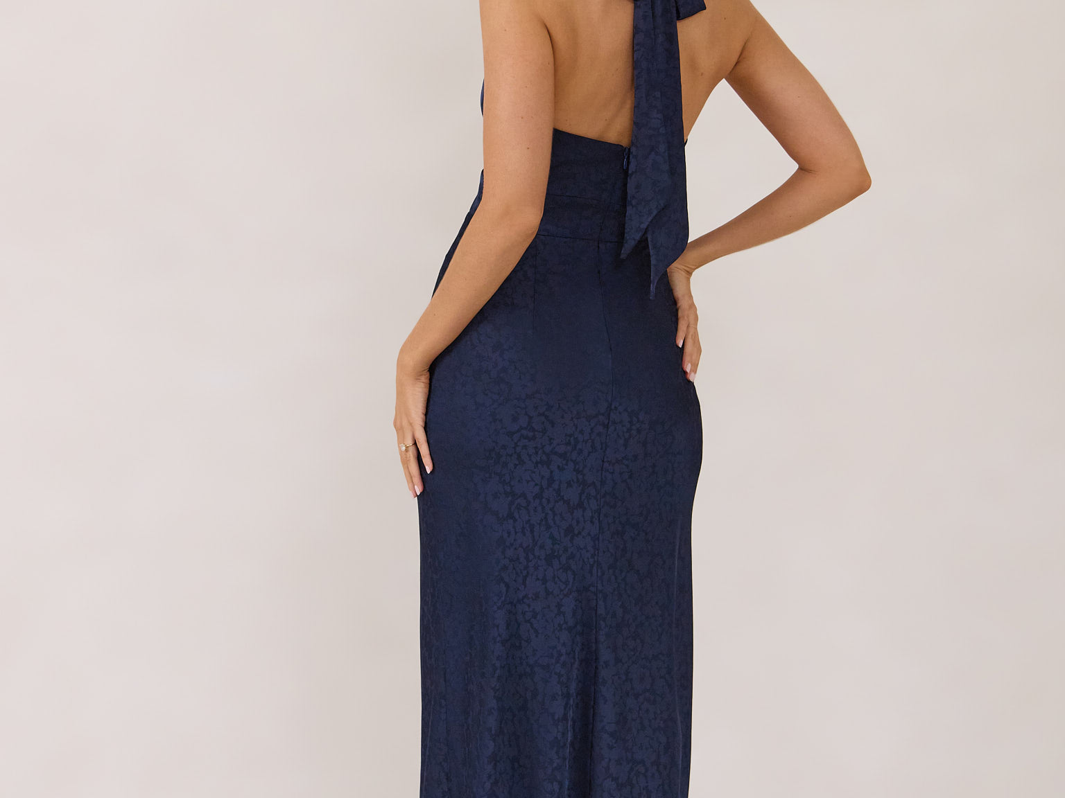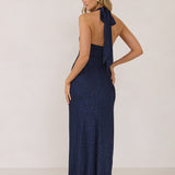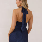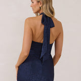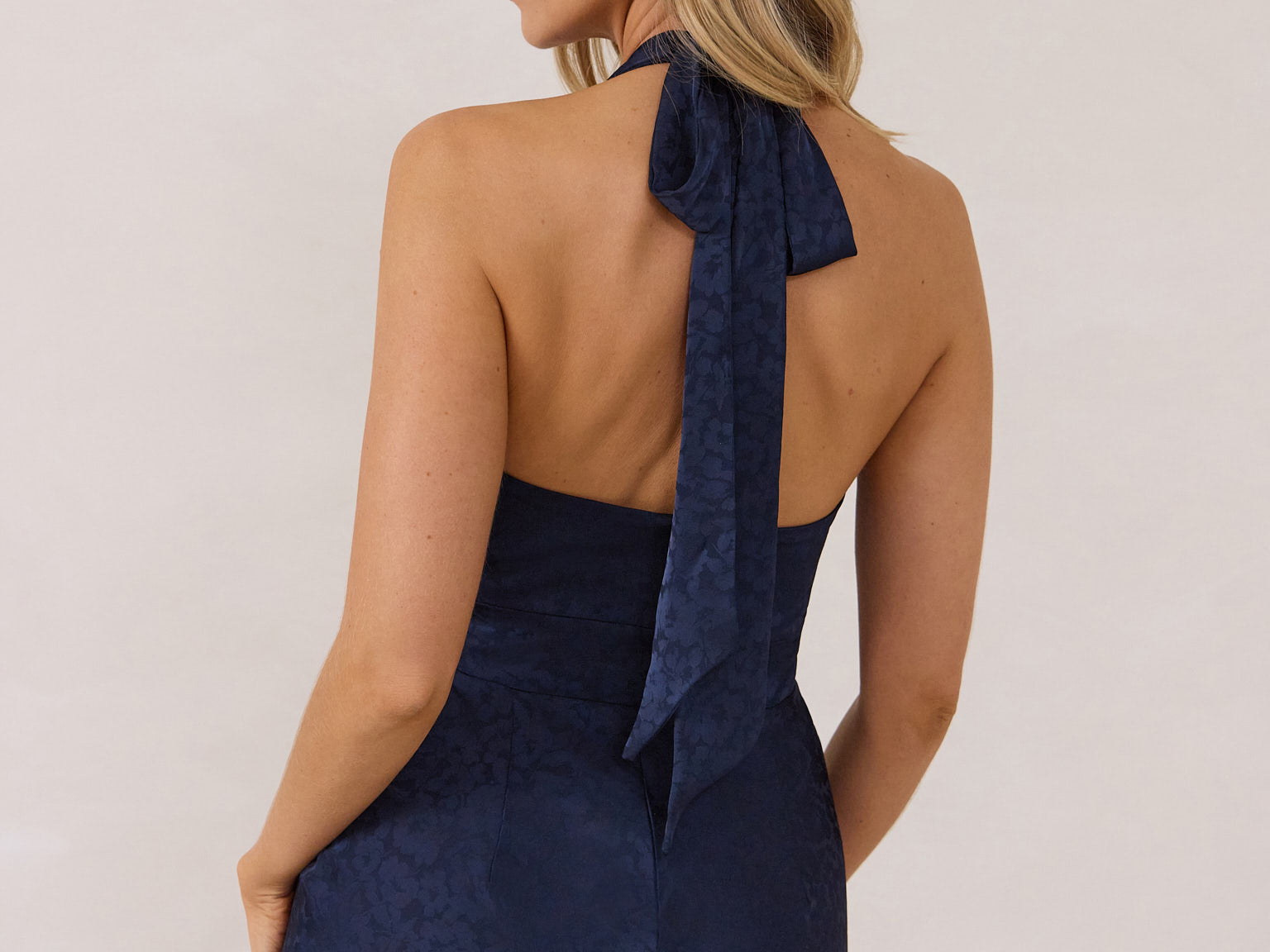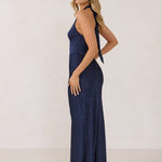 A refined silhouette with a modern edge. Featuring a sleek halter neckline, this style offers a sophisticated balance of structure and movement. The fitted bodice transitions into a bias-cut skirt, creating a smooth, elongating shape.