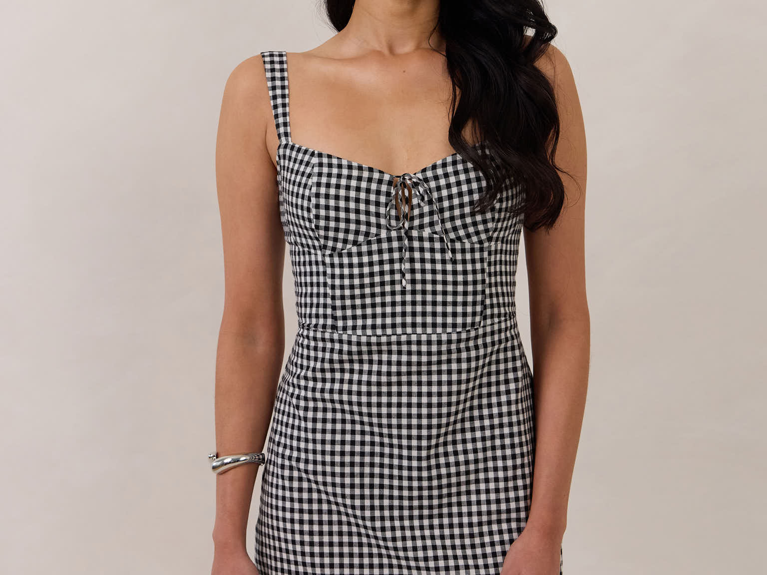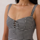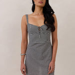 For patio season. The Aria Mini Dress blends playful charm with a flattering, structured fit. Crafted from breathable cotton, it features a sweetheart neckline, wide straps, and a delicate tie detail at the bust.