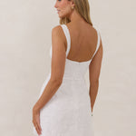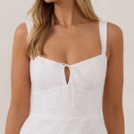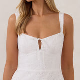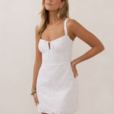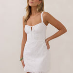 For patio season. The Aria Mini Dress blends playful charm with a flattering, structured fit. Crafted from breathable cotton, it features a sweetheart neckline, wide straps, and a delicate tie detail at the bust.