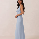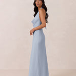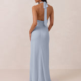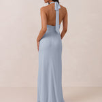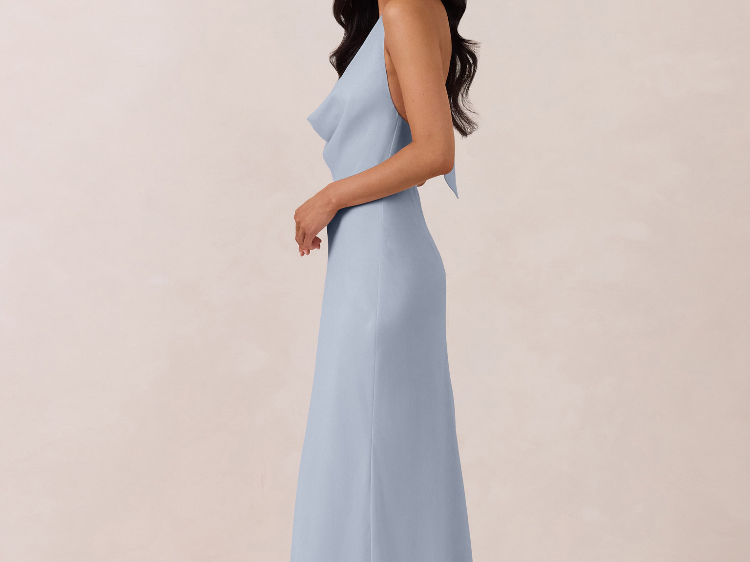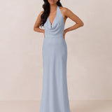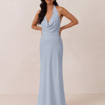 This elegant, full-length chiffon dress is designed to move gracefully, with a lustrous finish that highlights the delicate halter back and the softly draped cowl neckline. An unforgettable, timeless piece perfect for any special occasion.