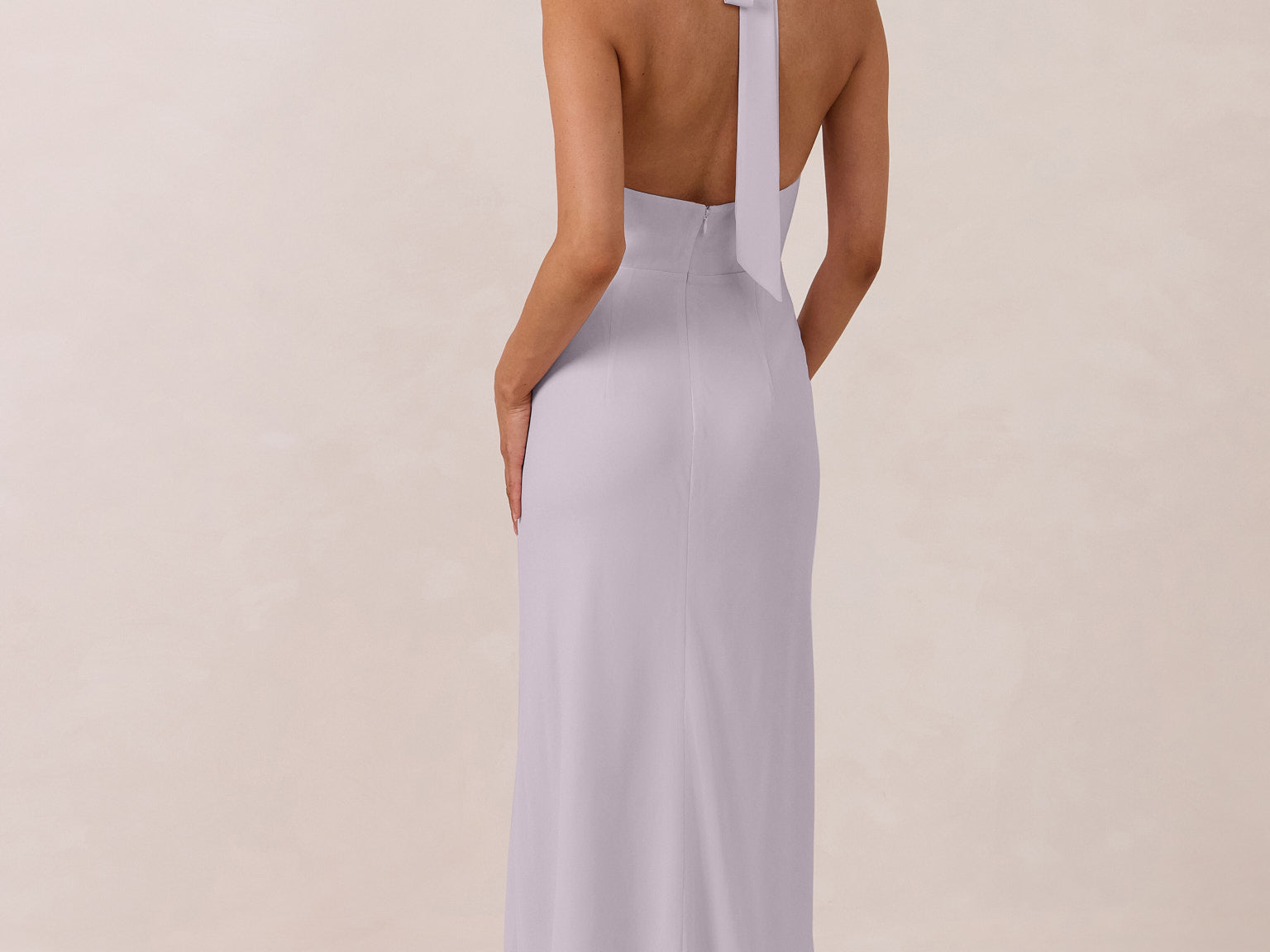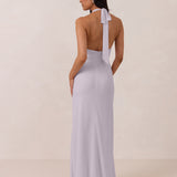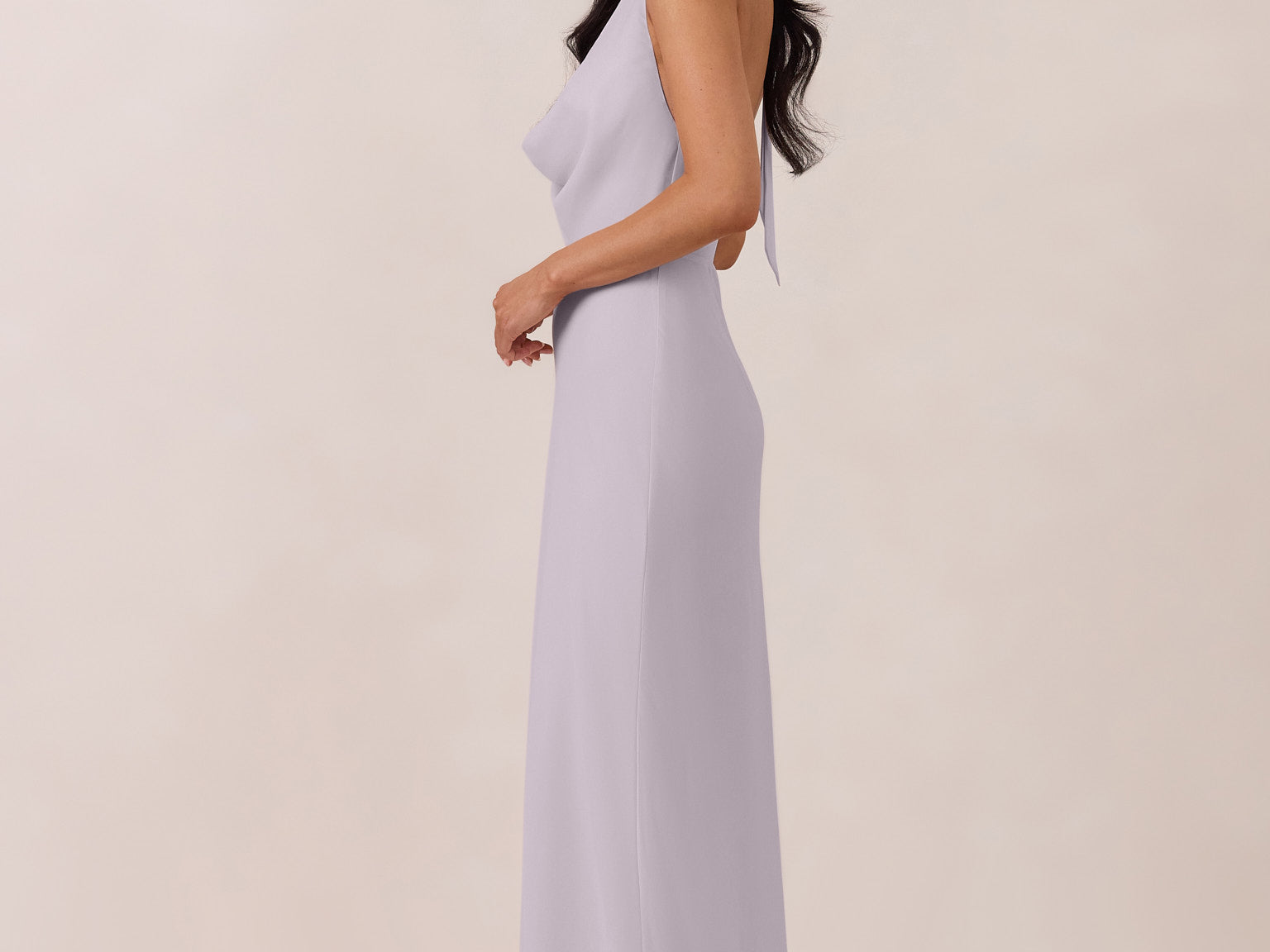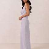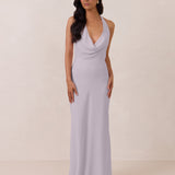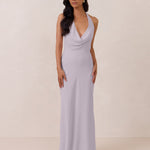This elegant, full-length chiffon dress is designed to move gracefully, with a lustrous finish that highlights the delicate halter back and the softly draped cowl neckline. An unforgettable, timeless piece perfect for any special occasion.