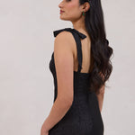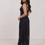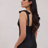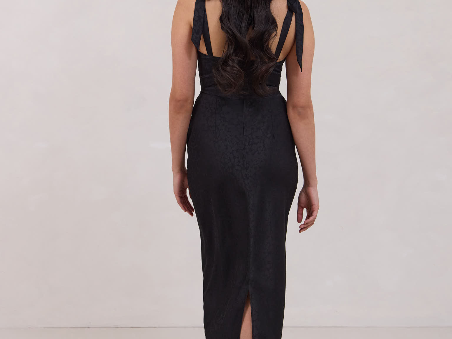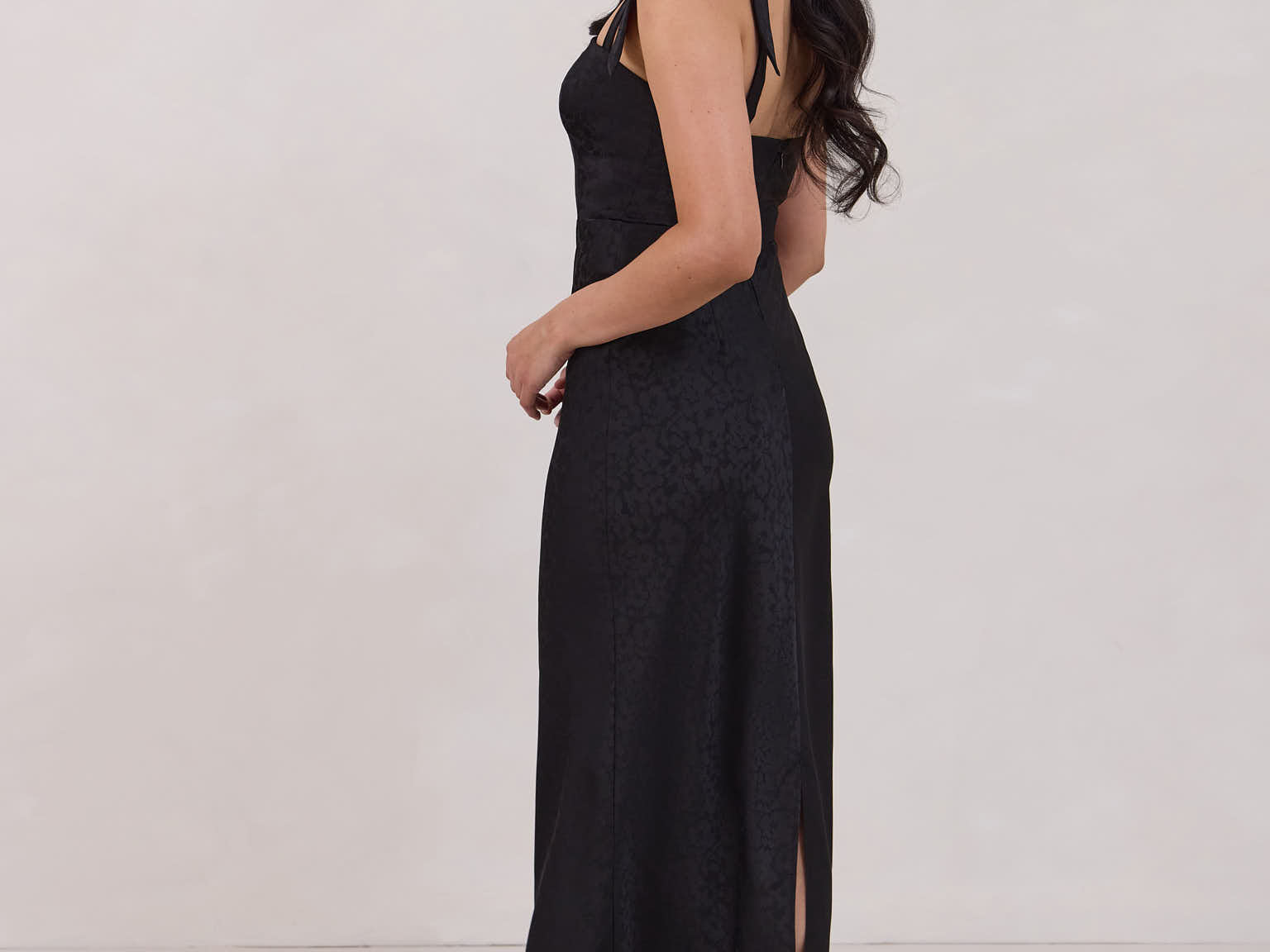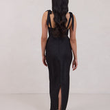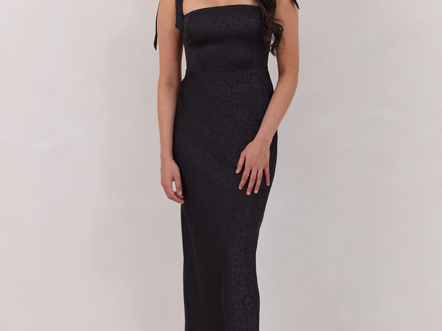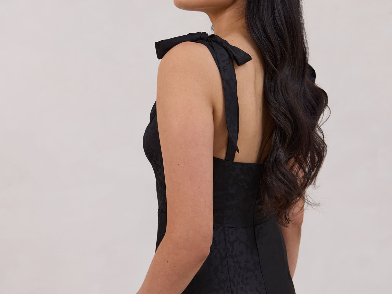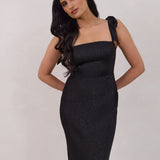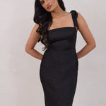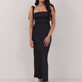 Featuring a sleek square neckline and thick tie straps, this style provides an effortless yet structured fit. The slim-fit skirt skims the body for a smooth, elongated silhouette, while an invisible back zipper ensures a seamless finish. Perfect for elevated evenings.