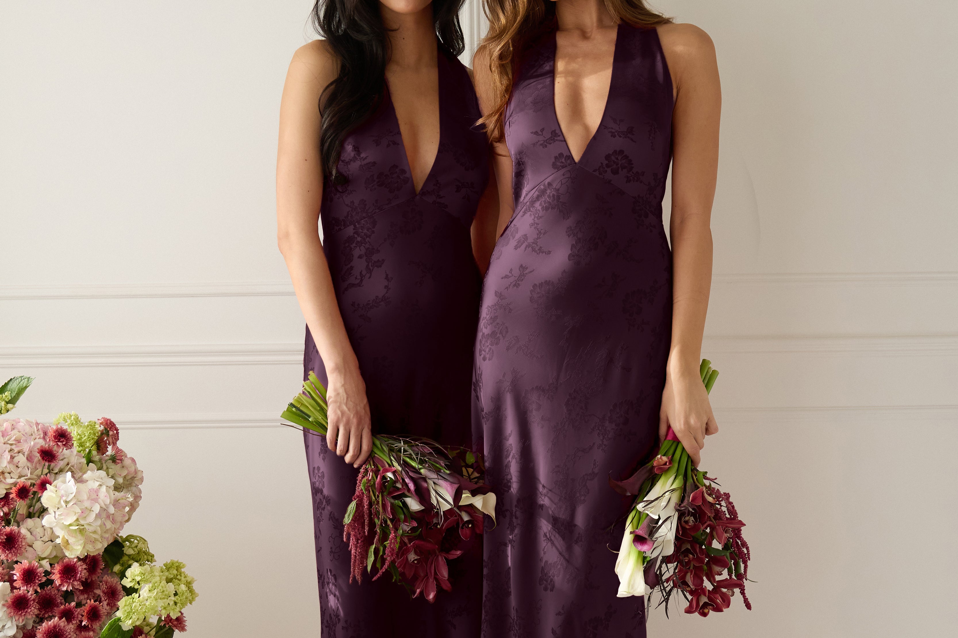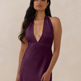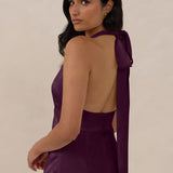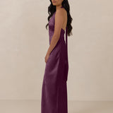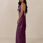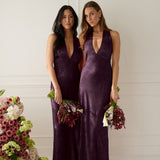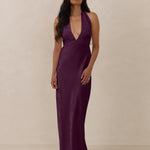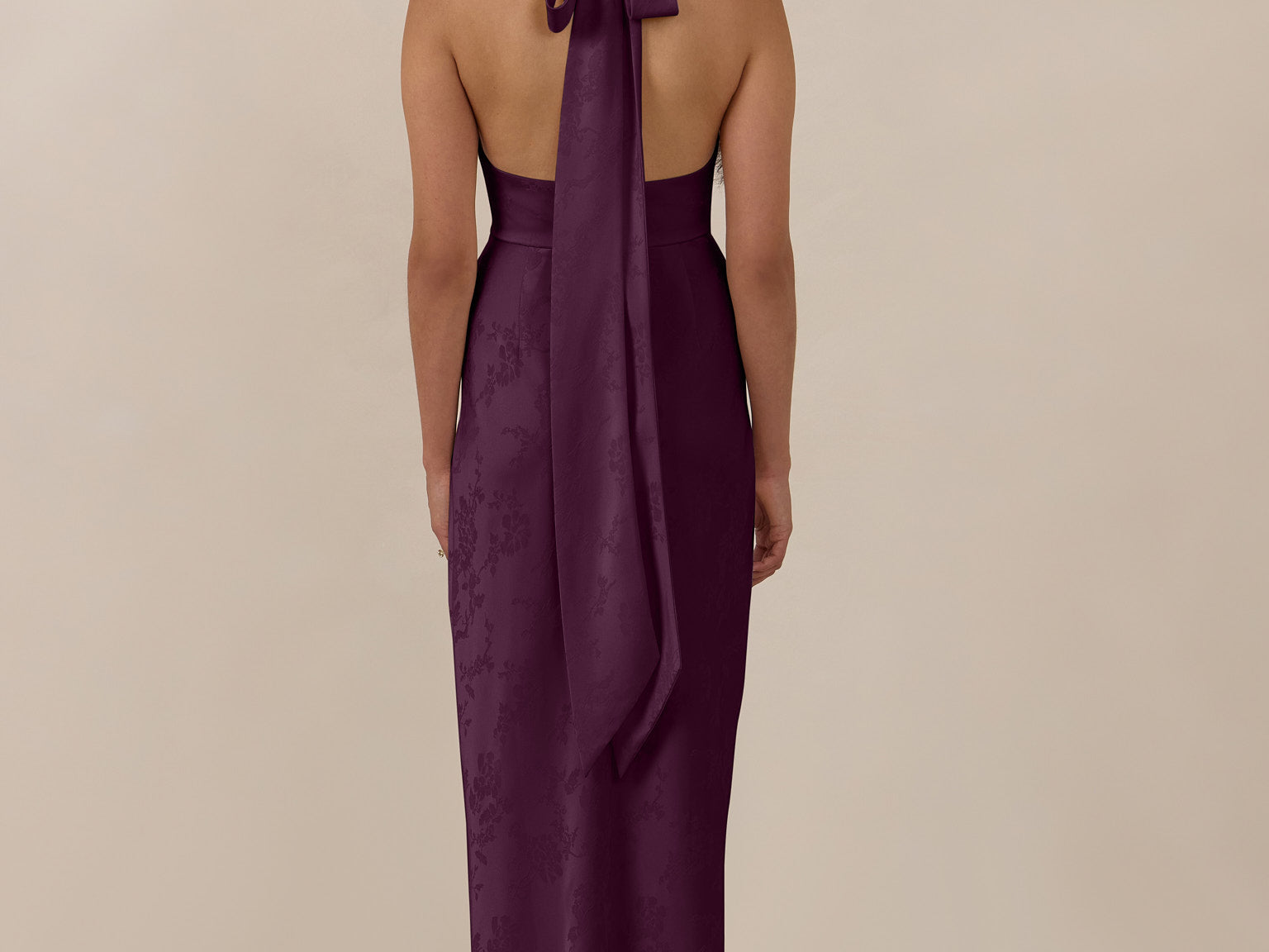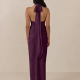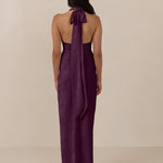 A sleek and versatile silhouette crafted in luxurious Jacquard for a touch of texture and sophistication. Designed for effortless elegance, it features a halter neckline with a dramatic open back and long ties that can be styled as a scarf or knotted for a custom halter look. The bias-cut skirt flows beautifully into a flattering maxi length, creating graceful movement with every step.