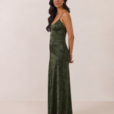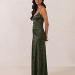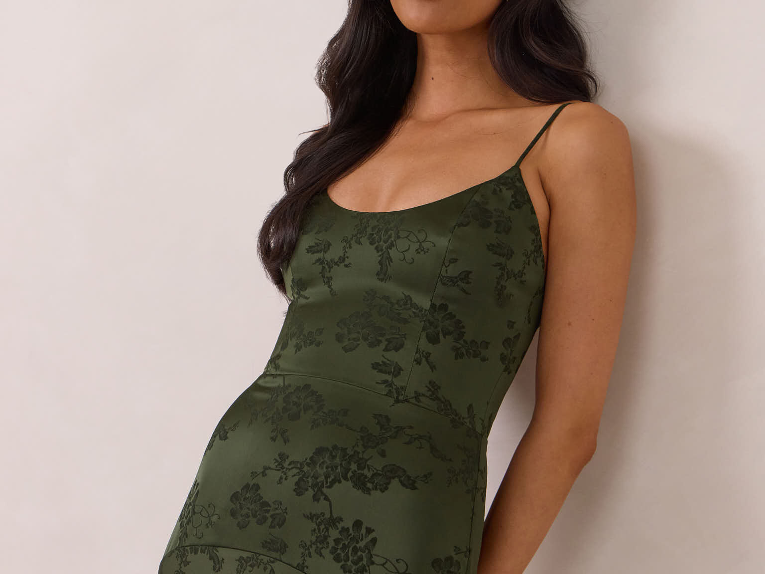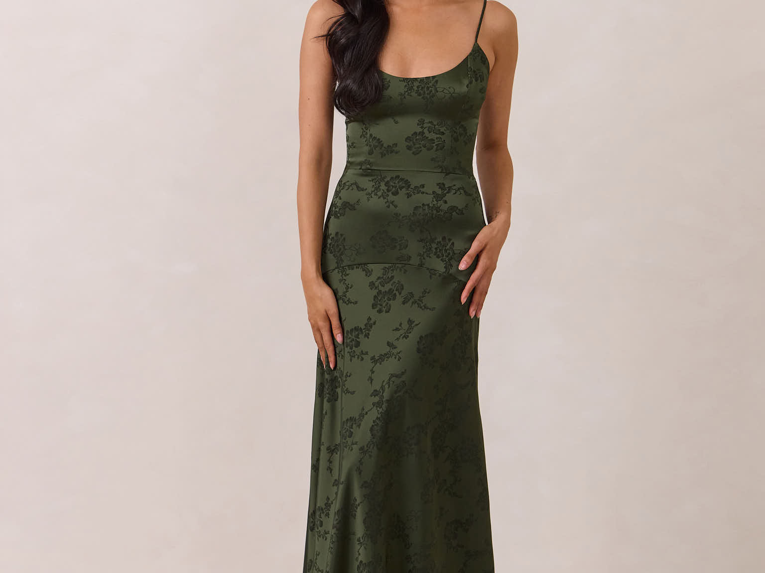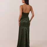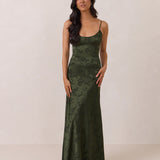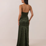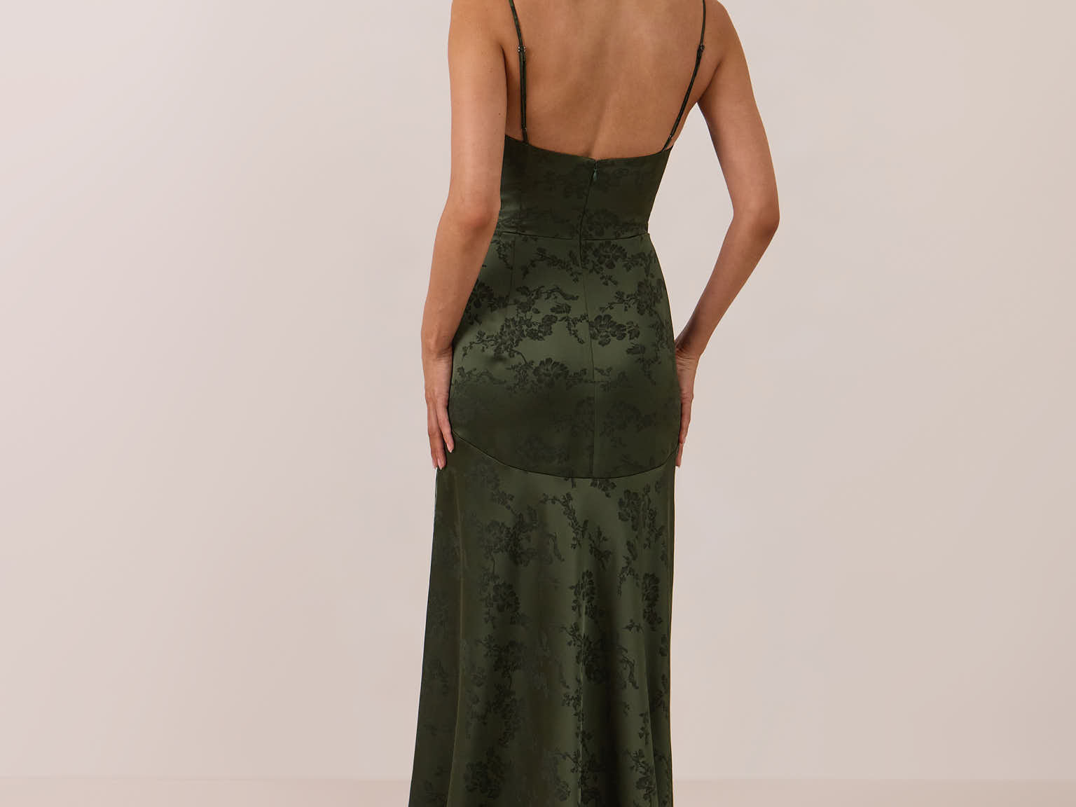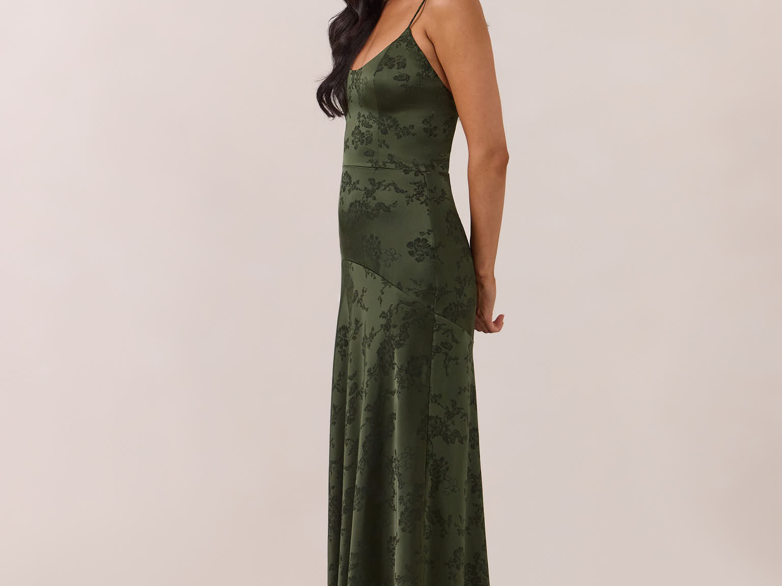 Crafted from luxurious Jacquard satin, this full-length dress features adjustable straps and a flattering drop waist, creating an elegant silhouette with timeless appeal. The scoop neckline and back add a delicate, feminine touch, while the bias-cut skirt flows gracefully to the floor, combining sophistication and comfort for a truly captivating look.