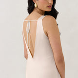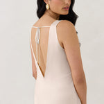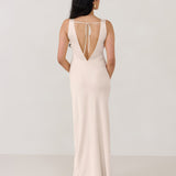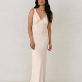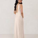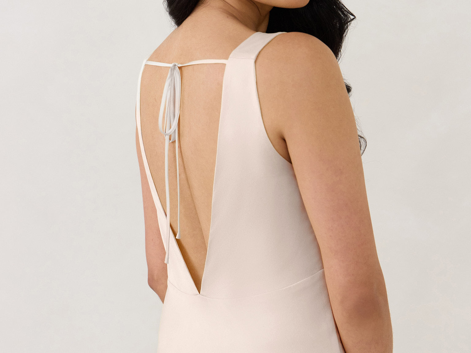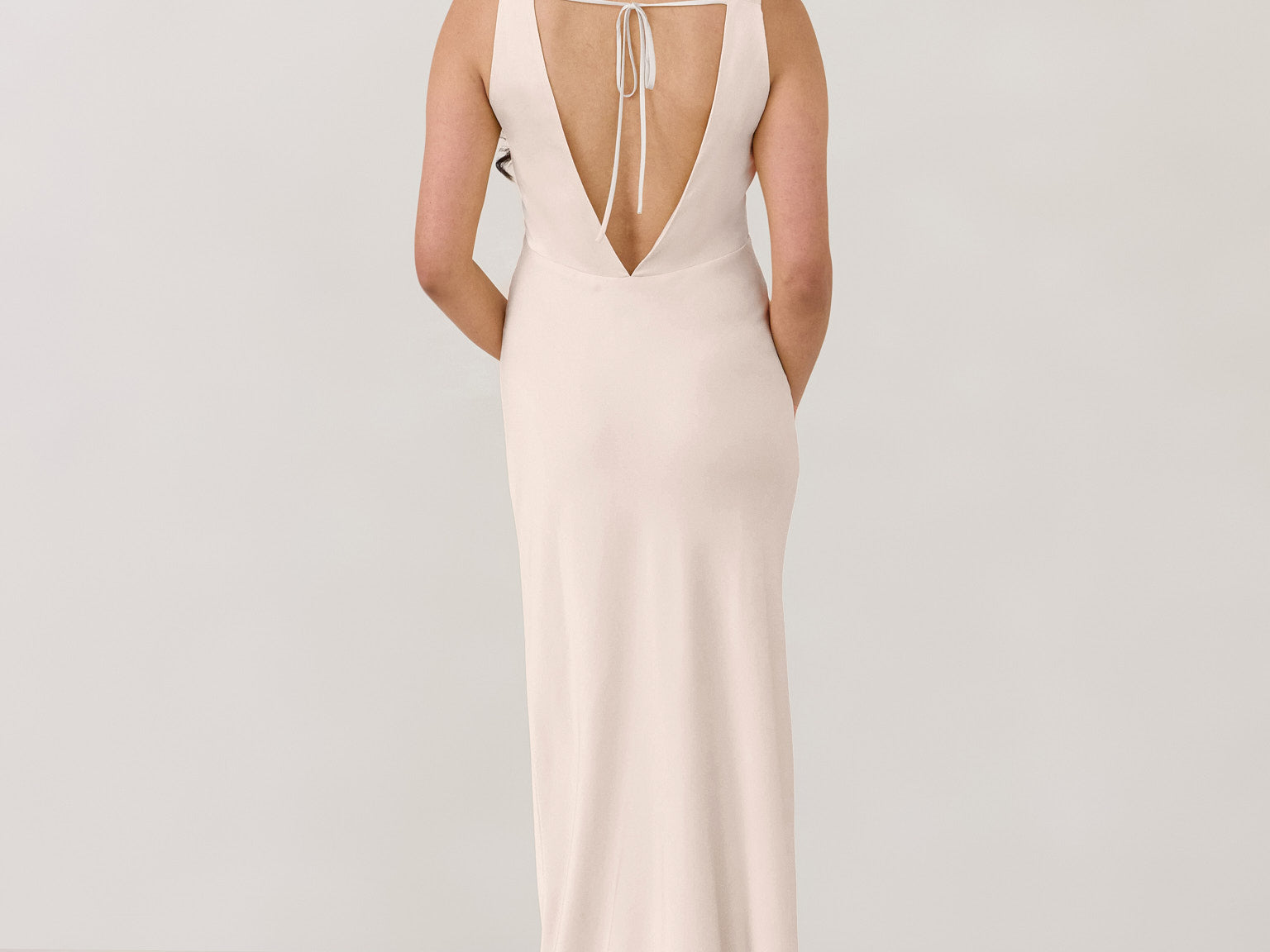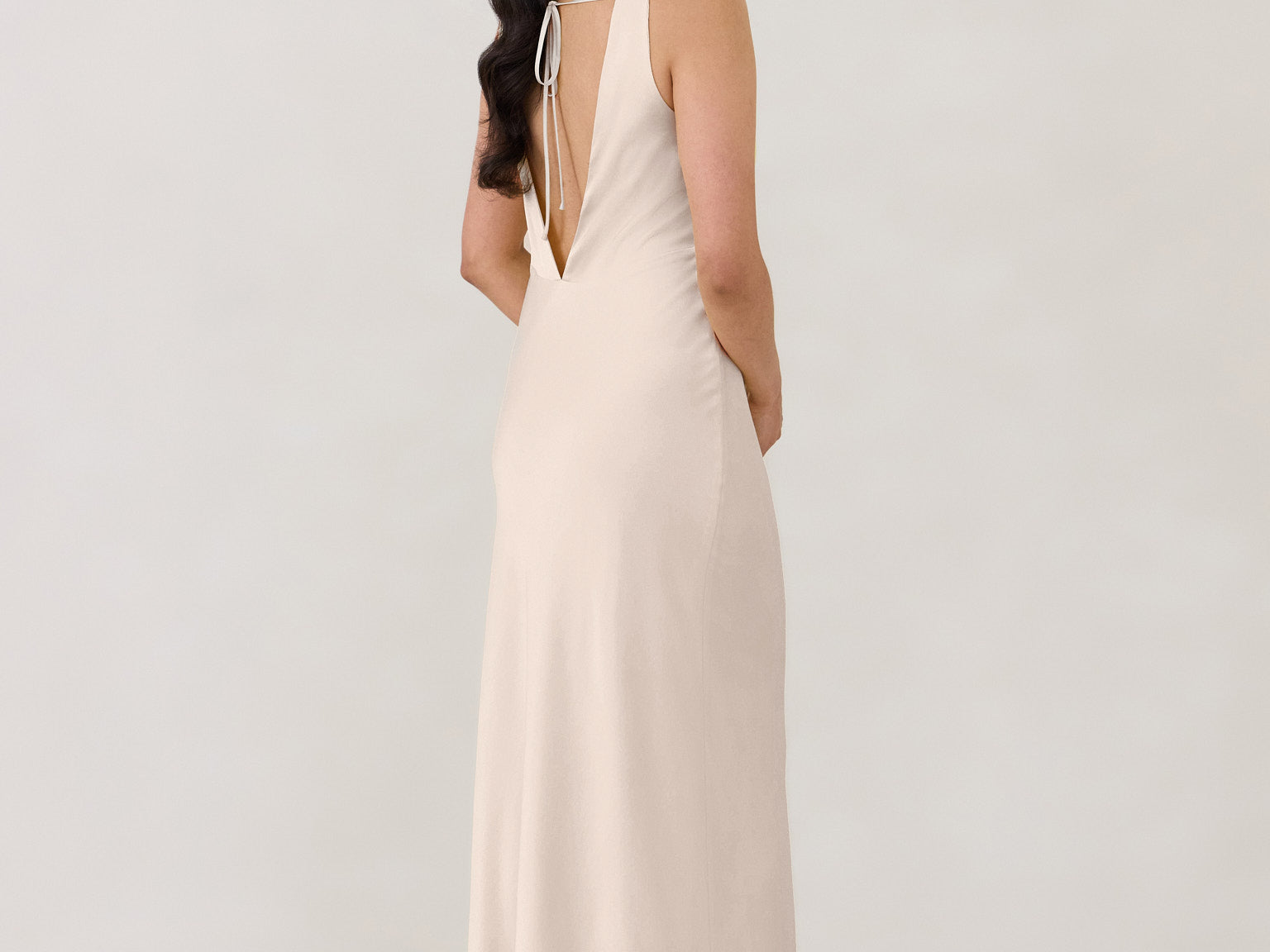 Featuring a flattering V-neckline, gathering at the bust, and an open back, this bias-cut dress offers a sleek, elongating silhouette. The clean lines and minimalist design make it the perfect choice for any special occasion.
