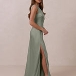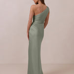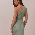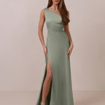 The Hartley dress offers modern minimalism and effortless charm. Made from soft, silky satin, this full-length silhouette drapes beautifully. Delicate ruching on the one-shoulder strap and right side seam adds subtle texture and enhances the figure-hugging fit. A sleek side slit completes the look, offering just the right amount of movement and allure.