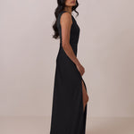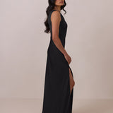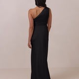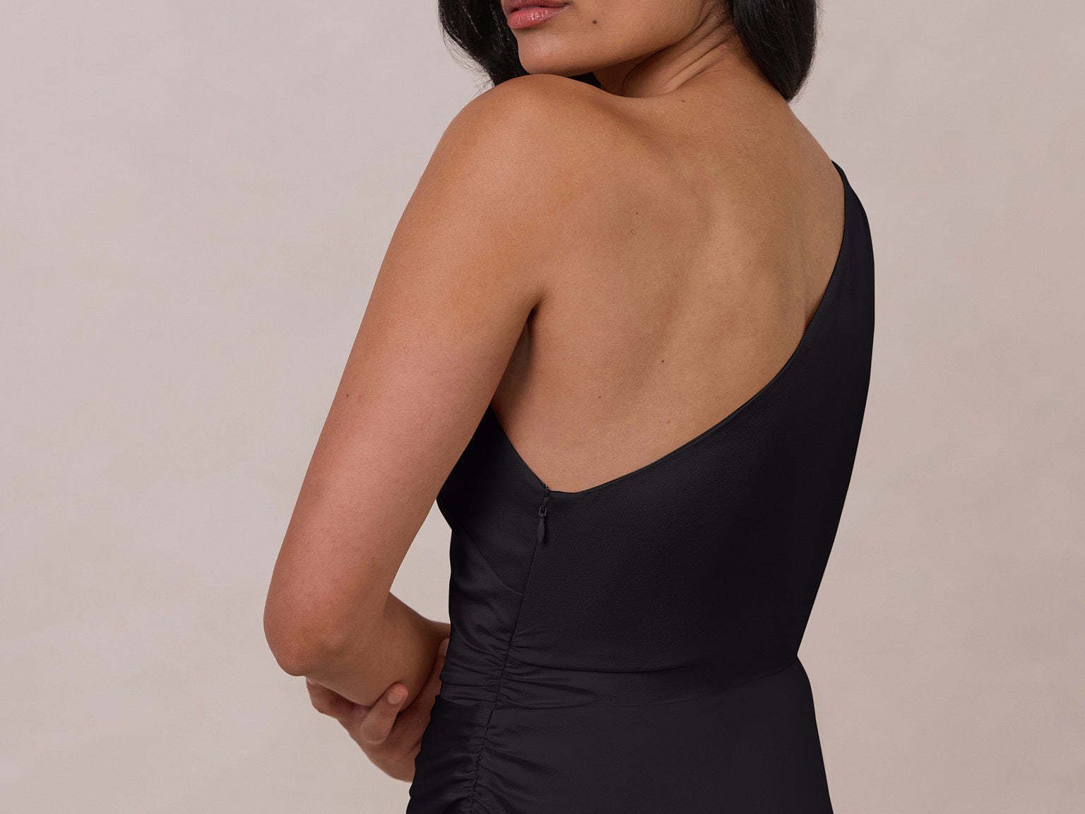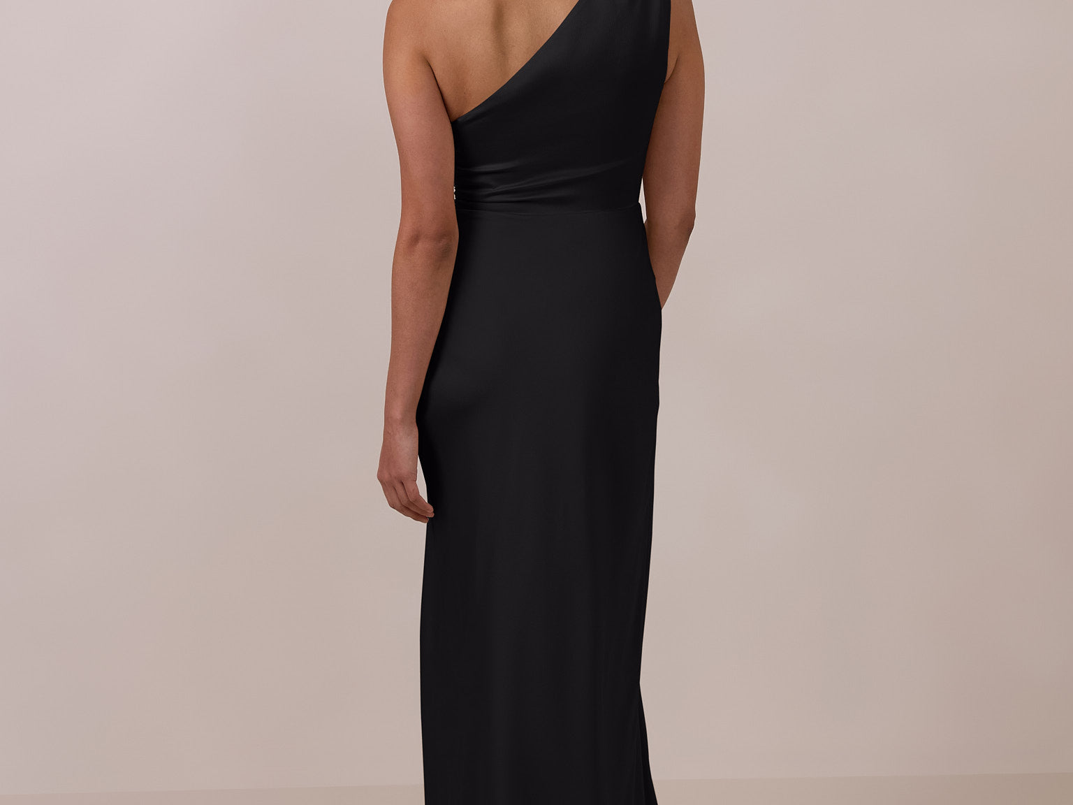 The Hartley dress offers modern minimalism and effortless charm. Made from soft, silky satin, this full-length silhouette drapes beautifully. Delicate ruching on the one-shoulder strap and right side seam adds subtle texture and enhances the figure-hugging fit. A sleek side slit completes the look, offering just the right amount of movement and allure.