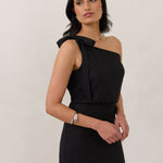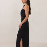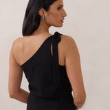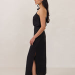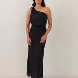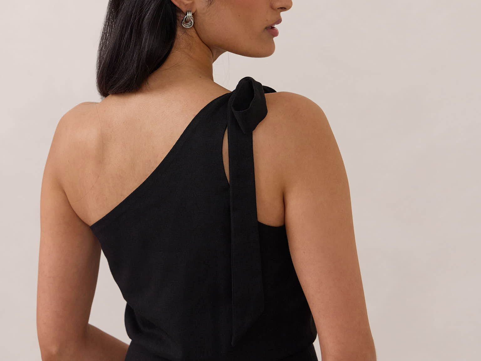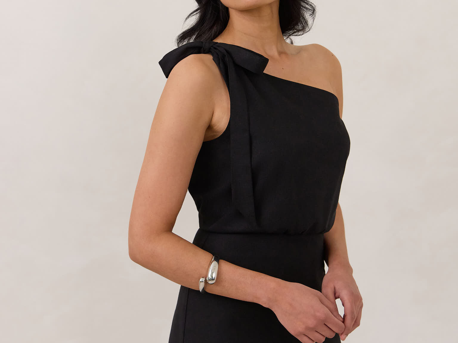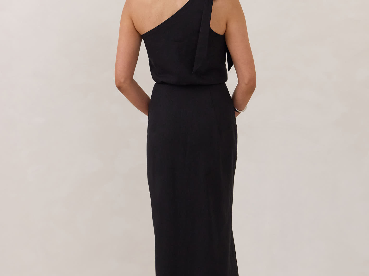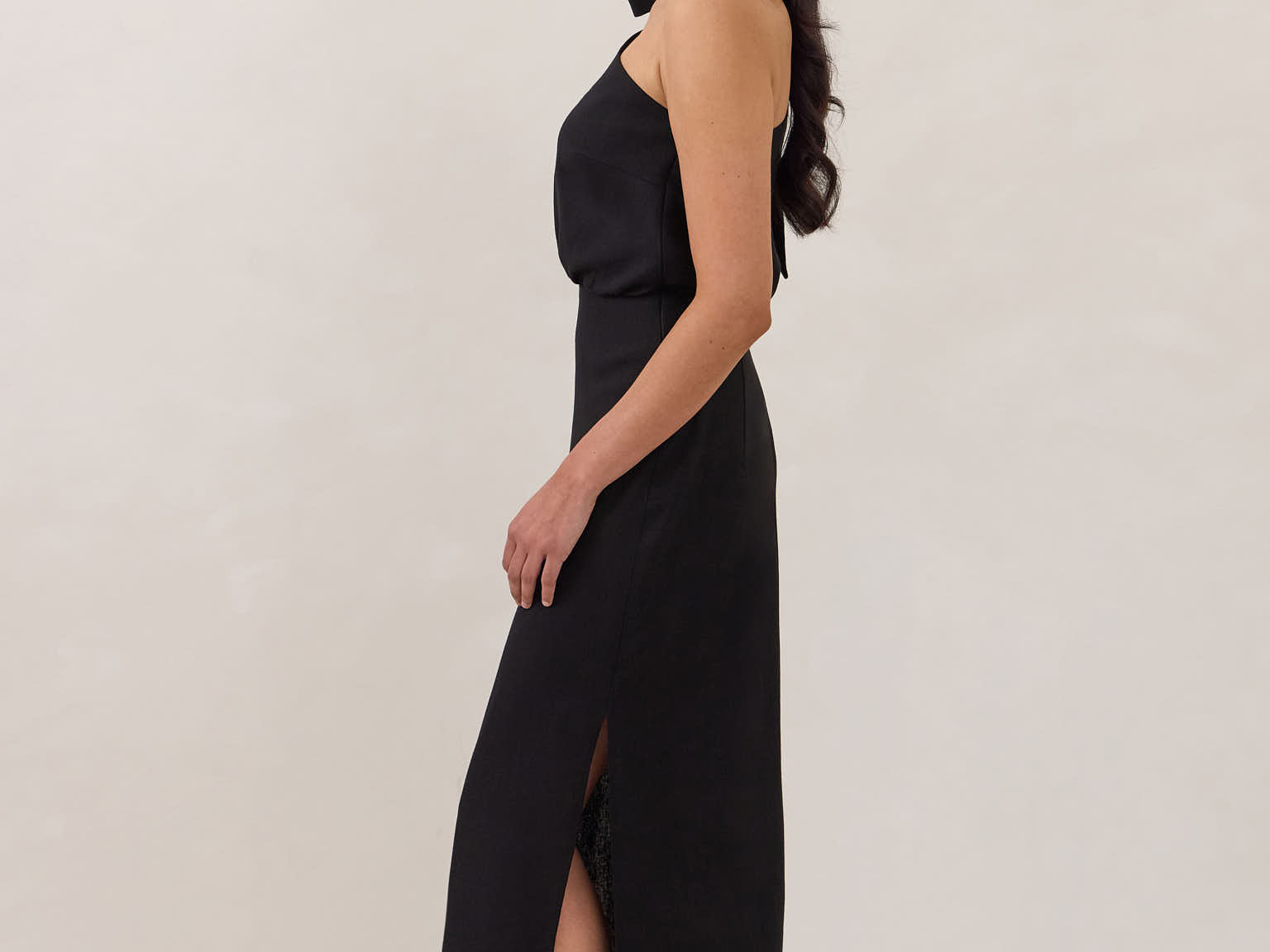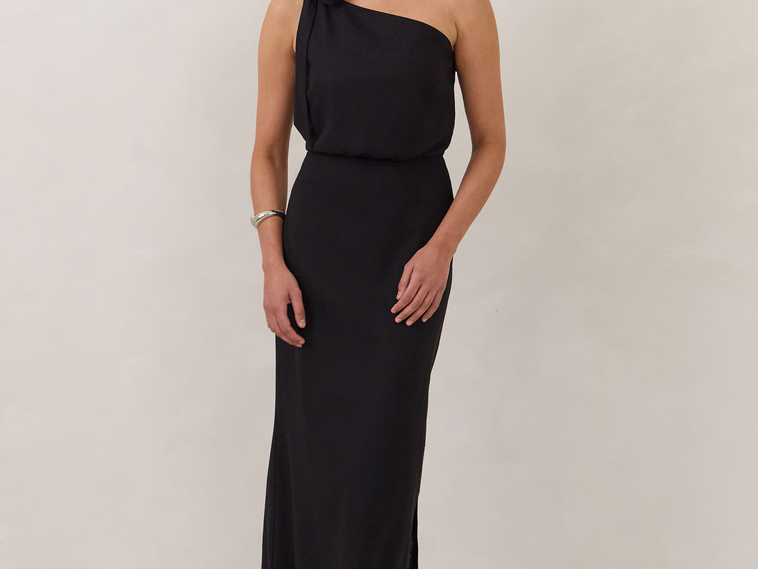 Understated, but far from simple. The Hudson Dress features a one-shoulder neckline with a soft tie detail and a slim-fitting skirt with a subtle side slit.  A polished option for warm-weather events.