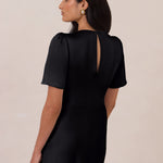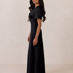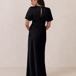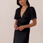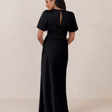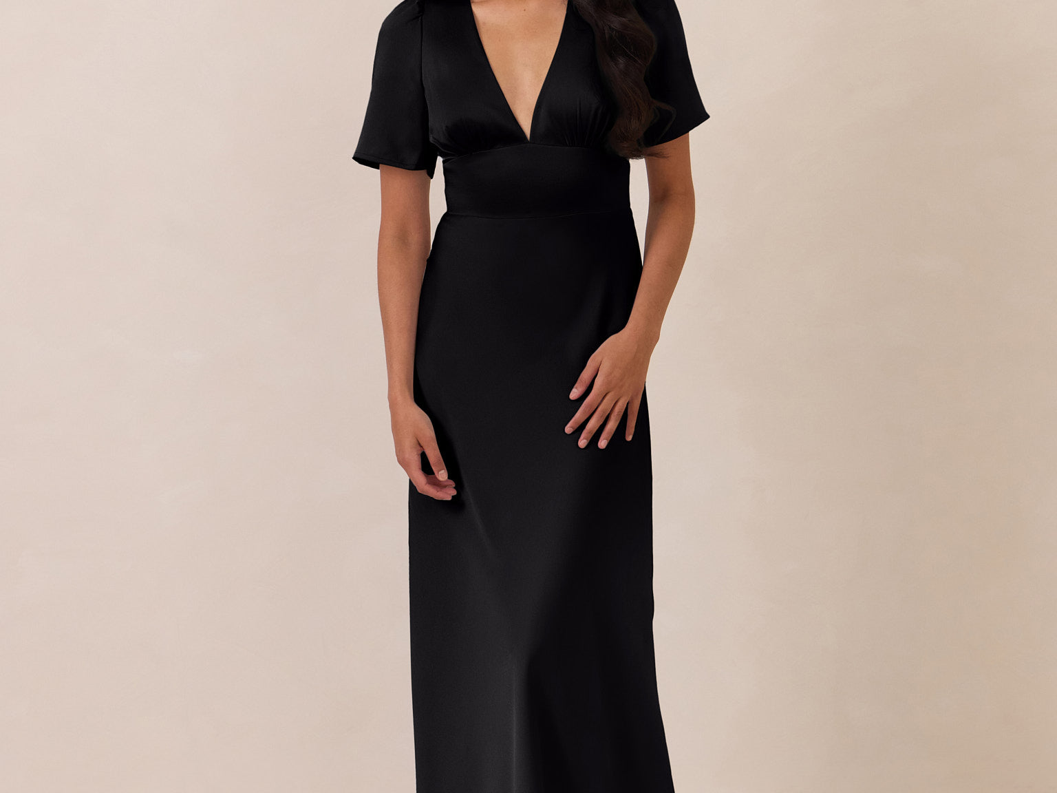 This full-length satin dress features a romantic V neckline, short sleeves, and a bias-cut skirt for an effortlessly feminine silhouette. A subtle keyhole back and delicate button closure add unexpected detail. Finished in silky satin with a soft, light-catching sheen.