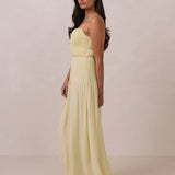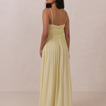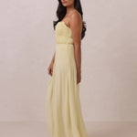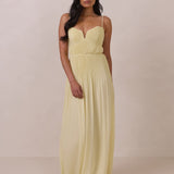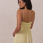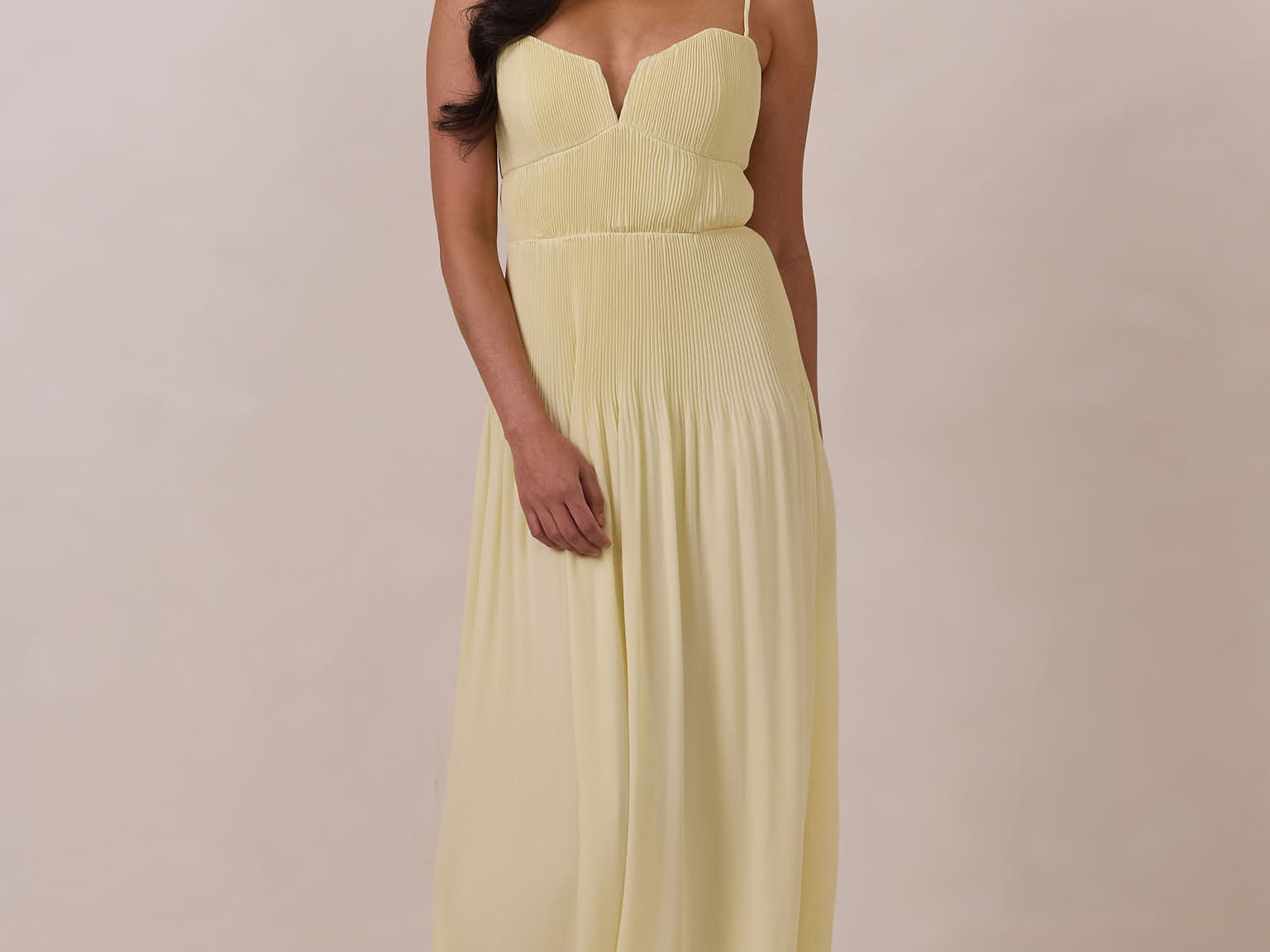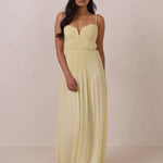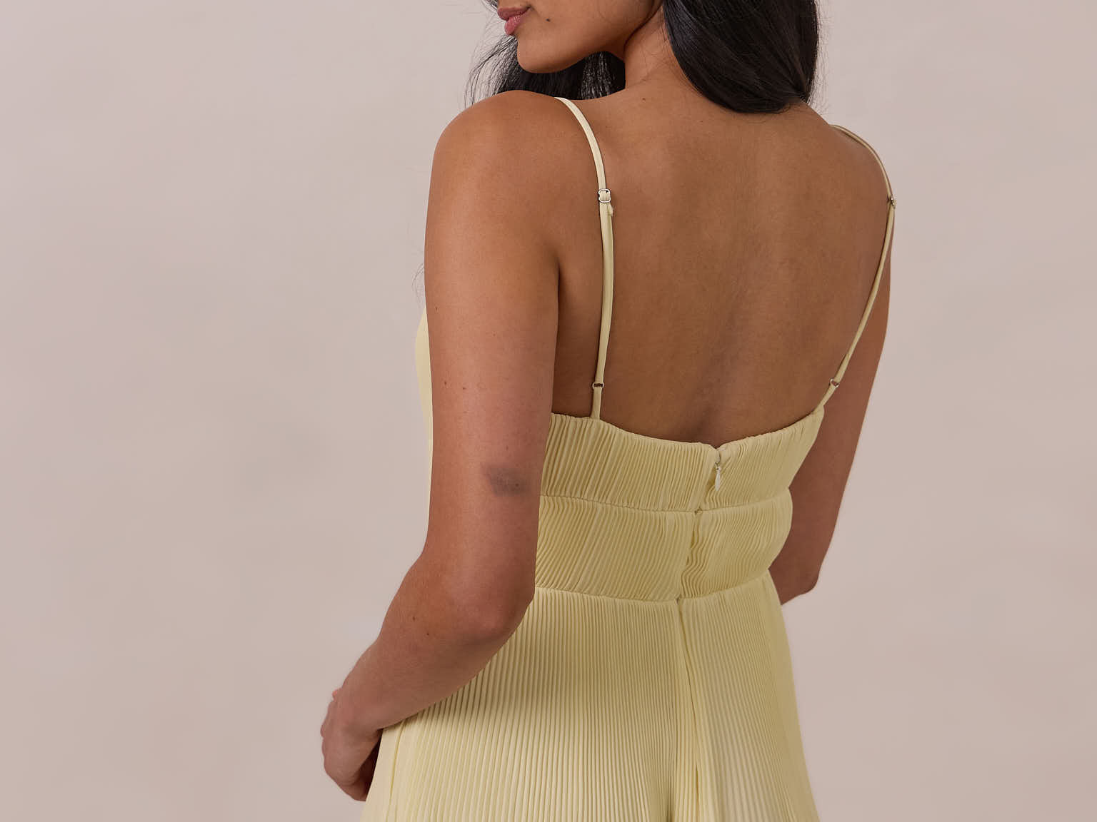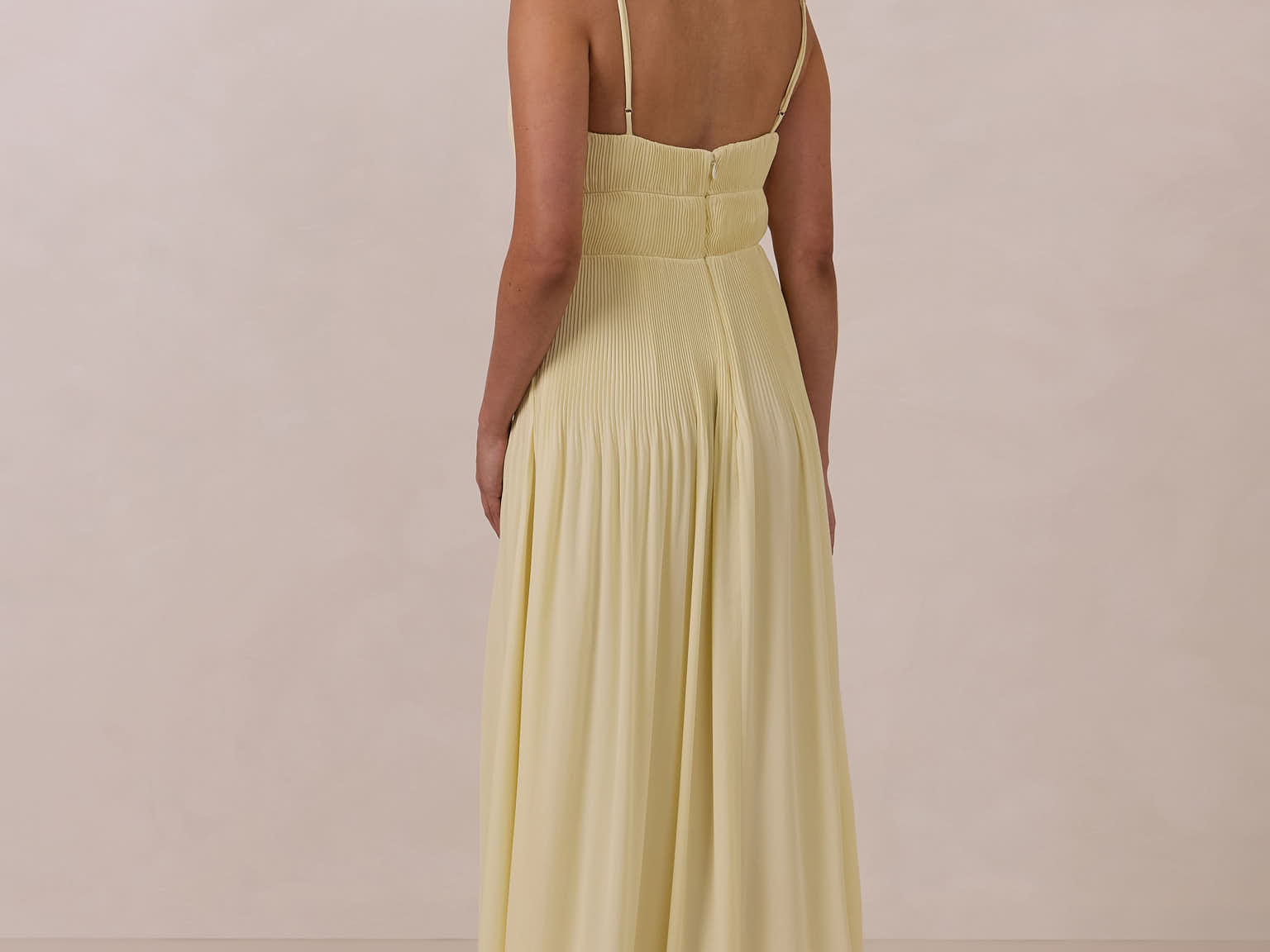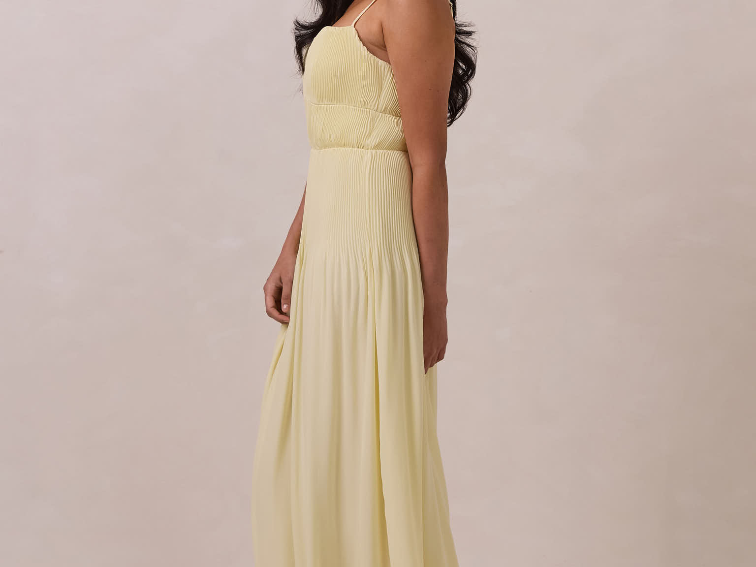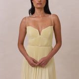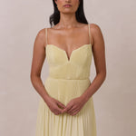 The Lena dress, crafted from airy chiffon, is a harmonious blend of elegance and movement. Its softly pleated skirt drapes gracefully, creating an ethereal flow with every stride. A modern touch is added by the structured V-wire neckline, which not only provides support but also subtly enhances the romantic silhouette.