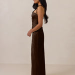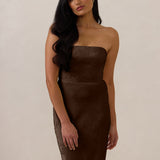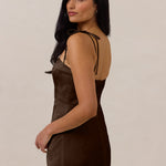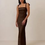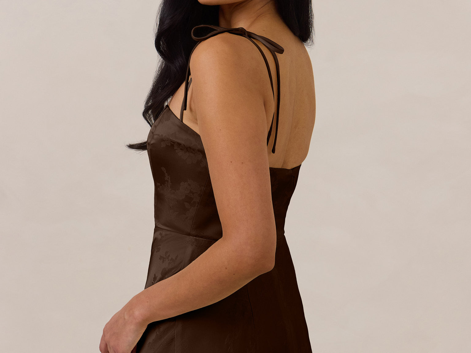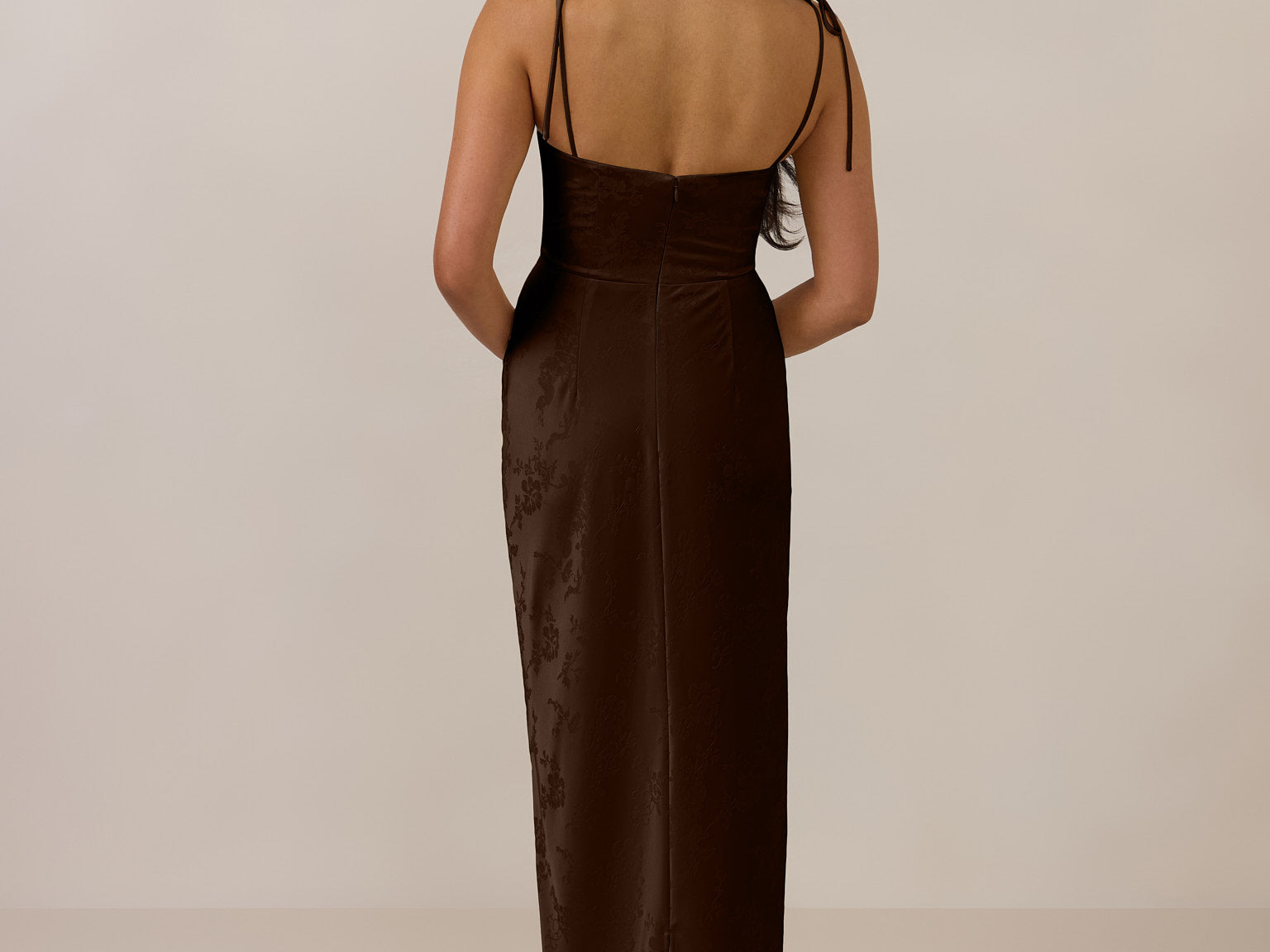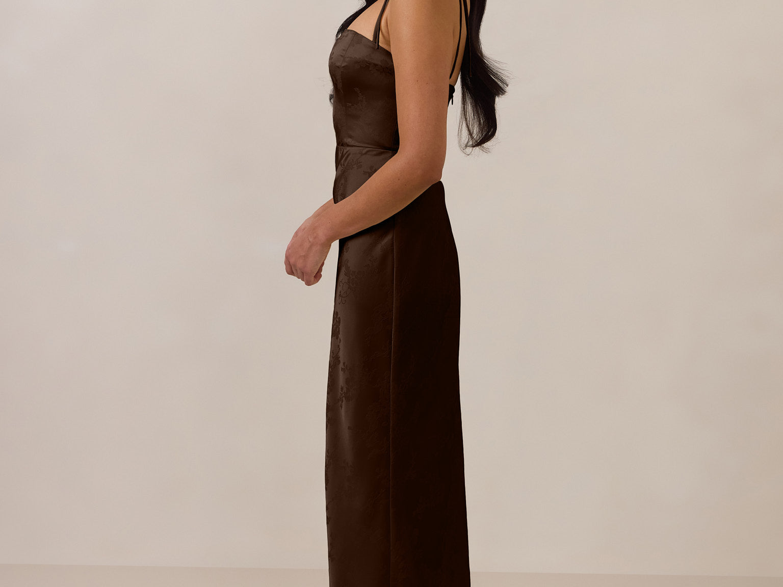 The convertible Meridian dress offers understated sophistication with a floor-grazing silhouette and a back slit for graceful movement. Featuring a structured bodice for a sculpted fit, the design includes interchangeable straps that can be styled thin, thick, or strapless. This versatile and elegant piece is designed to provide quiet confidence for any occasion.
