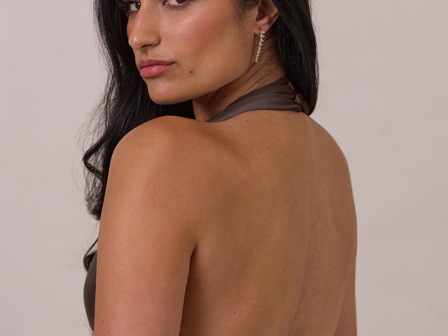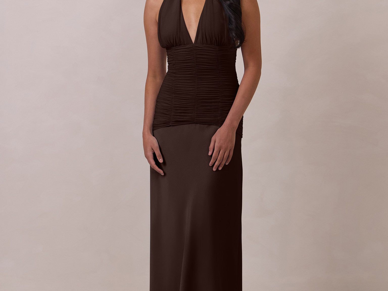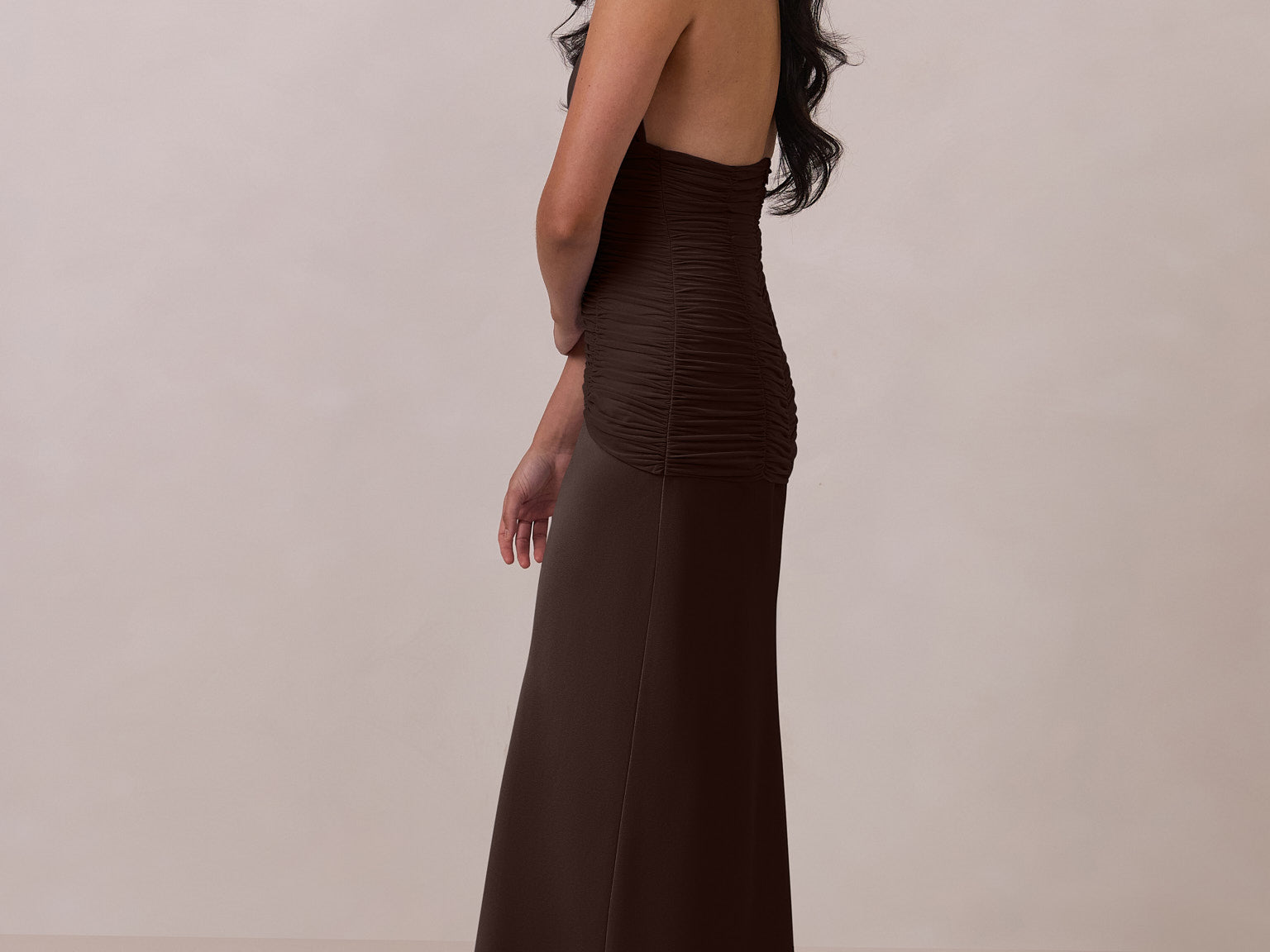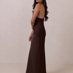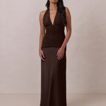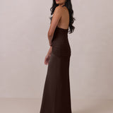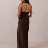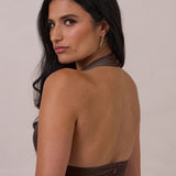 The Monroe is a modern halter dress cut in stretch chiffon and bubble satin for a balance of texture and structure. The bodice features a gathered chiffon overlay that contours the waist, while a bias-cut satin skirt drapes effortlessly for a smooth, flattering fit. Finished with a halter neckline secured by two buttons at the back and a discreet center-back zipper, this piece is designed for ease and movement while maintaining a polished silhouette.