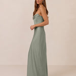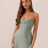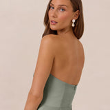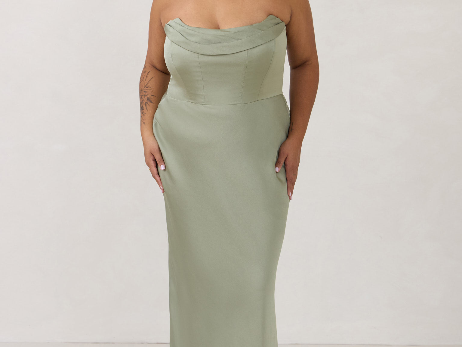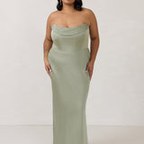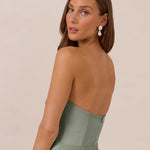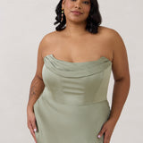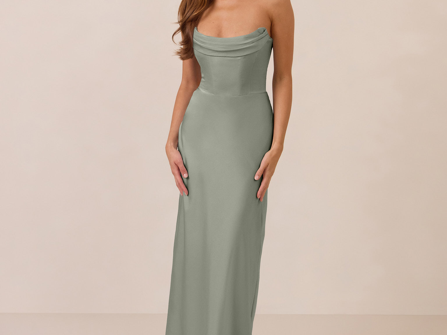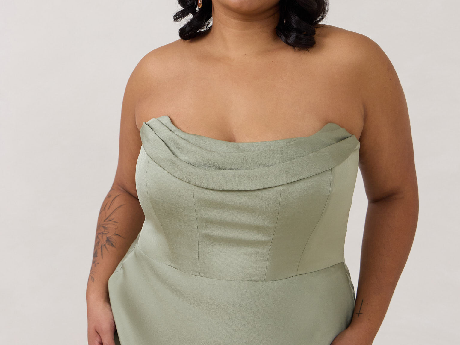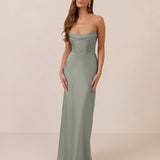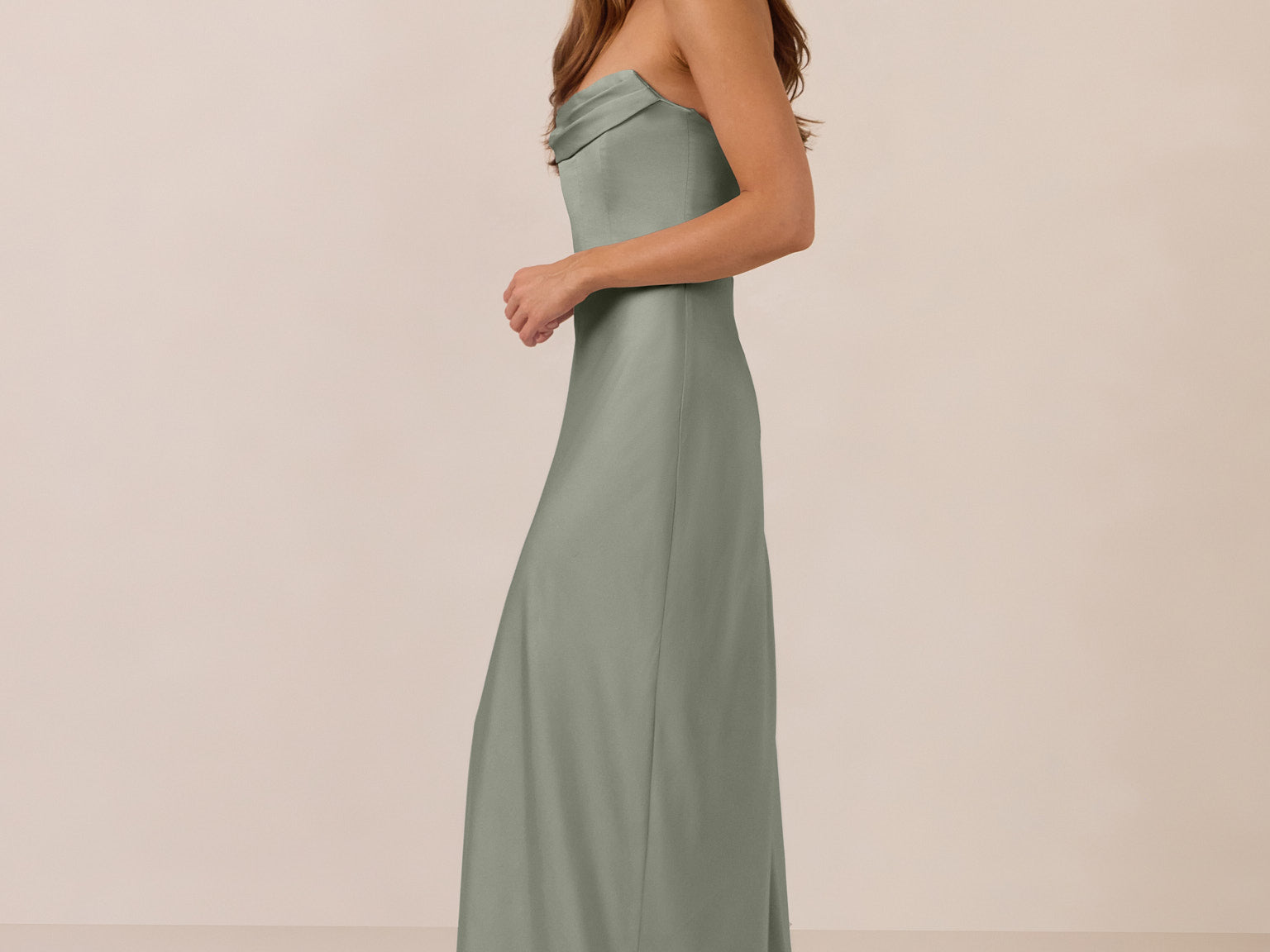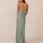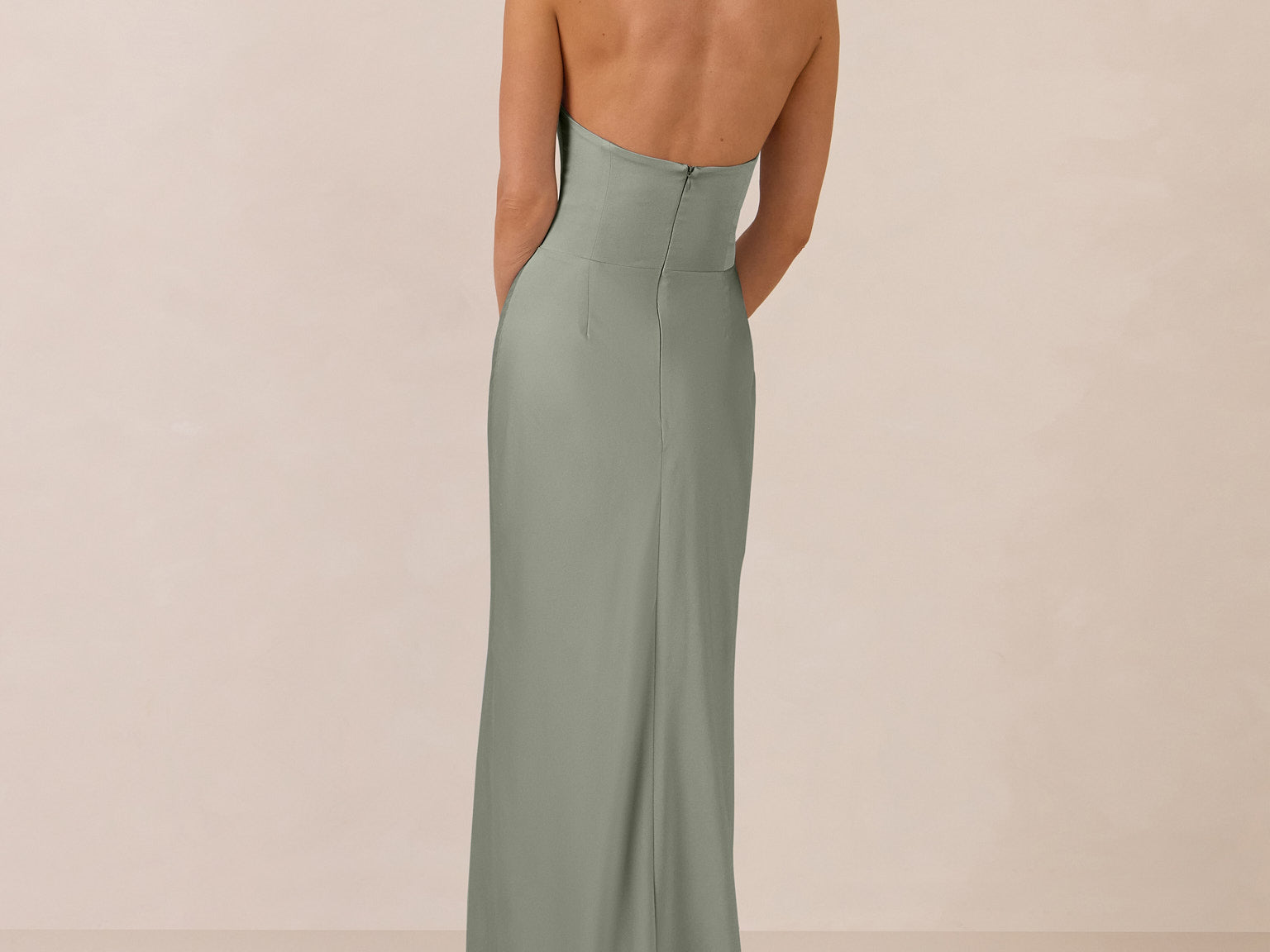 An elegant strapless design with a modern edge, this dress features an exaggerated pointed neckline and a boned bodice for a structured, flattering fit. The bias-cut skirt creates a smooth, elongating silhouette, while the full-length design makes it perfect for galas and formal occasions.