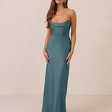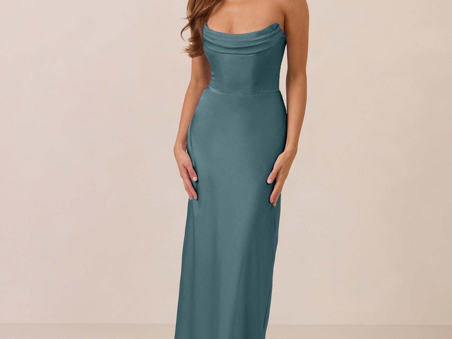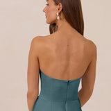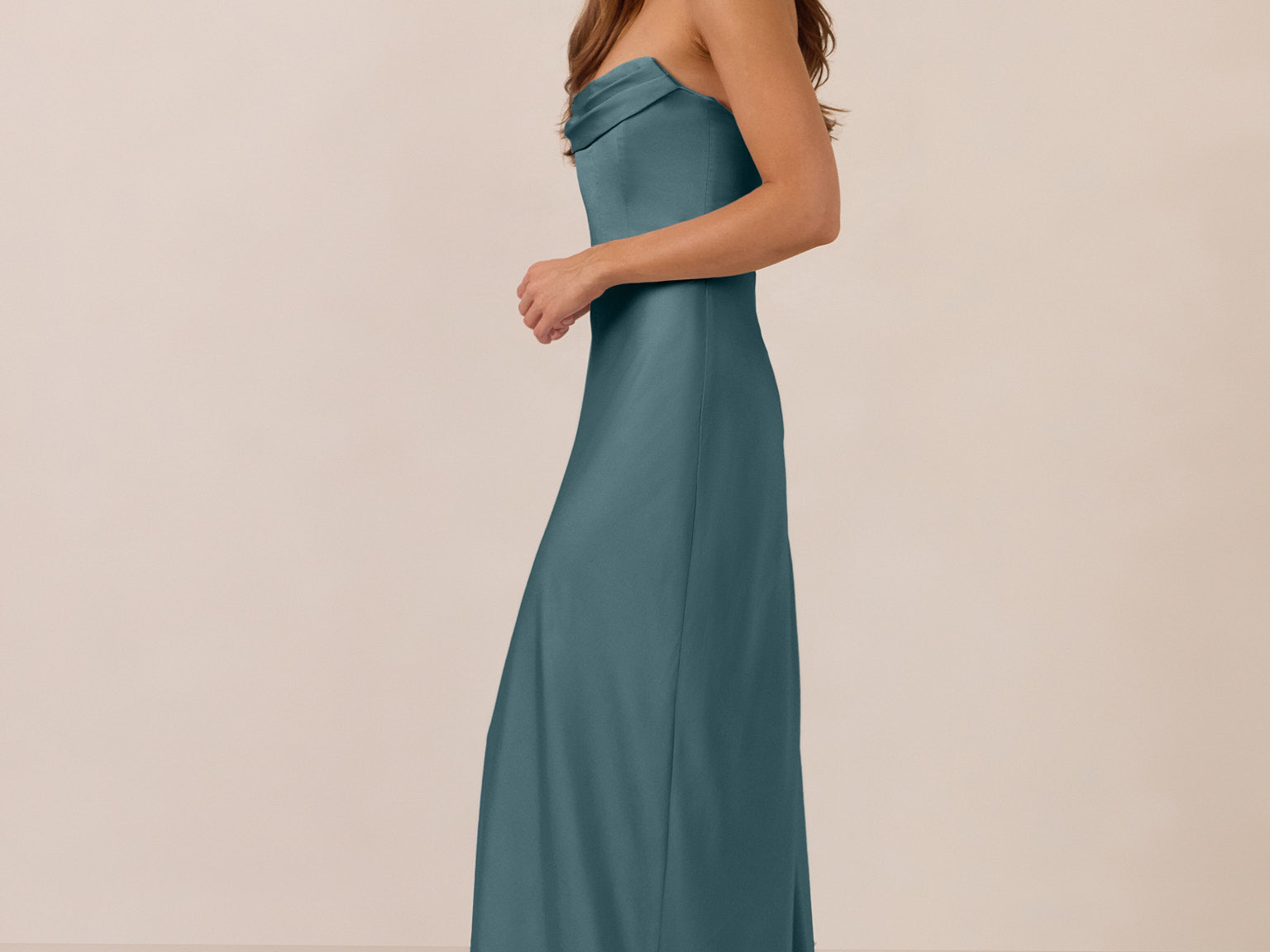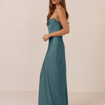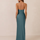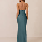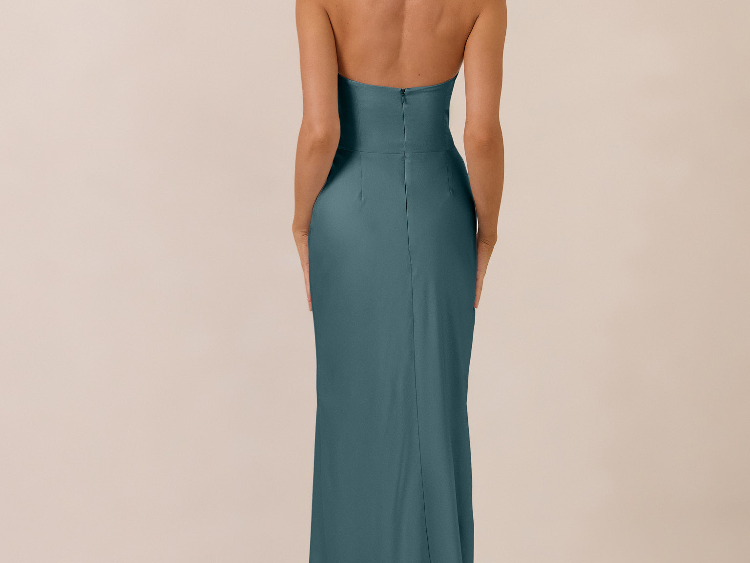 An elegant strapless design with a modern edge, this dress features an exaggerated pointed neckline and a boned bodice for a structured, flattering fit. The bias-cut skirt creates a smooth, elongating silhouette, while the full-length design makes it perfect for galas and formal occasions.