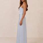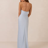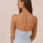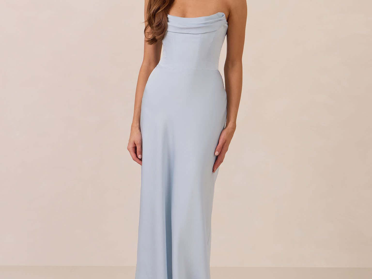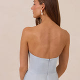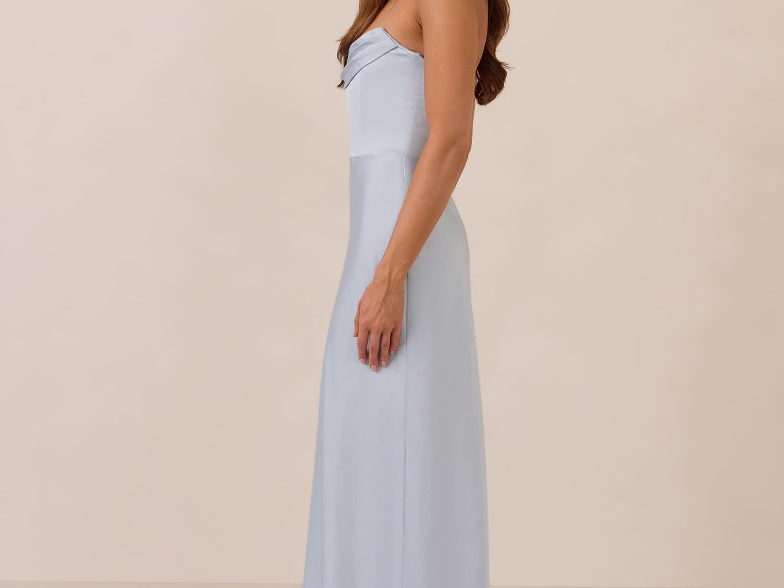 An elegant strapless design with a modern edge, this dress features an exaggerated pointed neckline and a boned bodice for a structured, flattering fit. The bias-cut skirt creates a smooth, elongating silhouette, while the full-length design makes it perfect for galas and formal occasions.