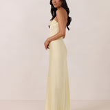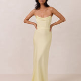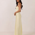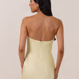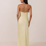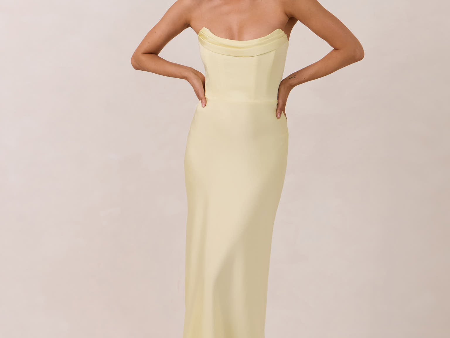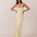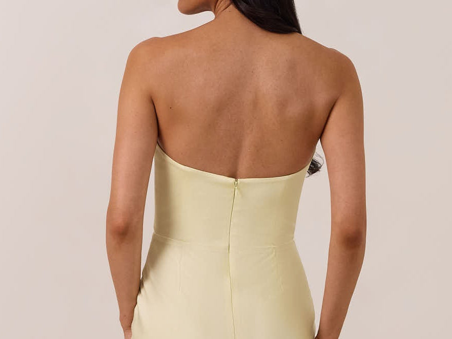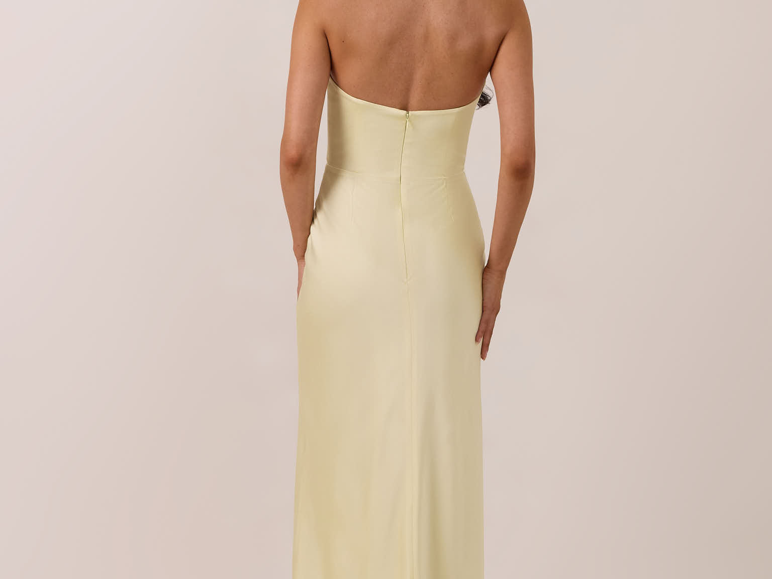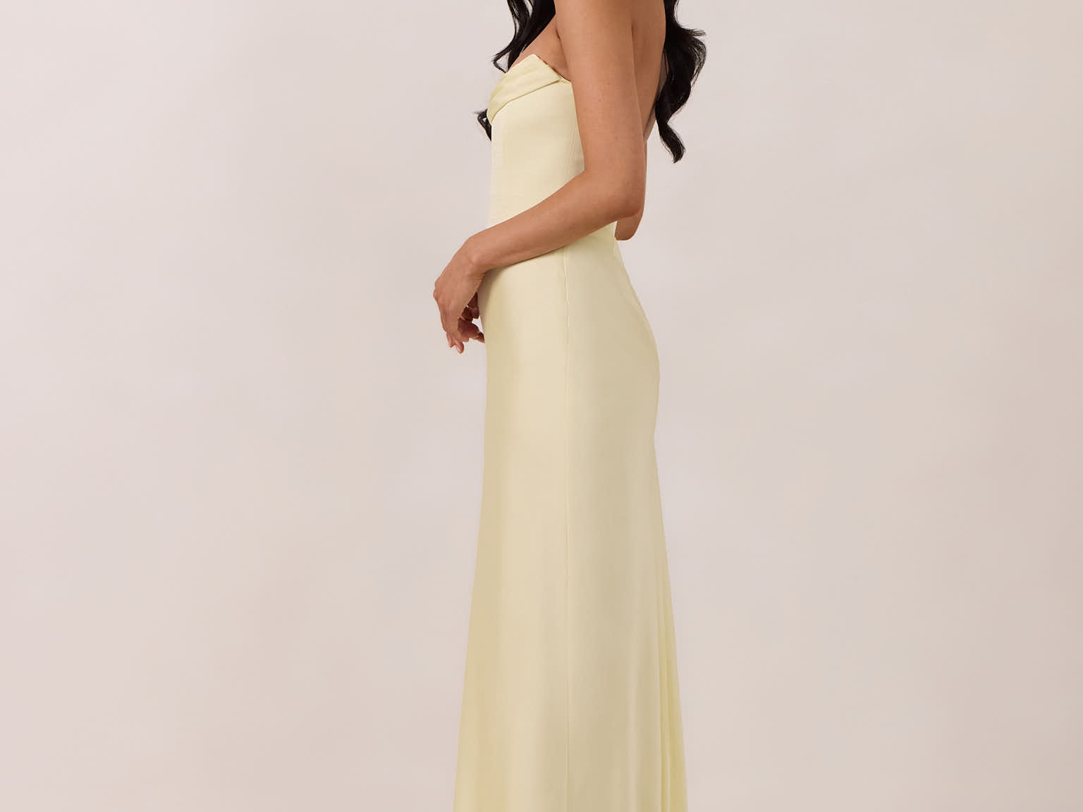 An elegant strapless design with a modern edge, this dress features an exaggerated pointed neckline and a boned bodice for a structured, flattering fit. The bias-cut skirt creates a smooth, elongating silhouette, while the full-length design makes it perfect for galas and formal occasions.