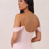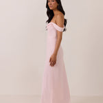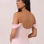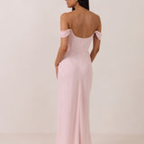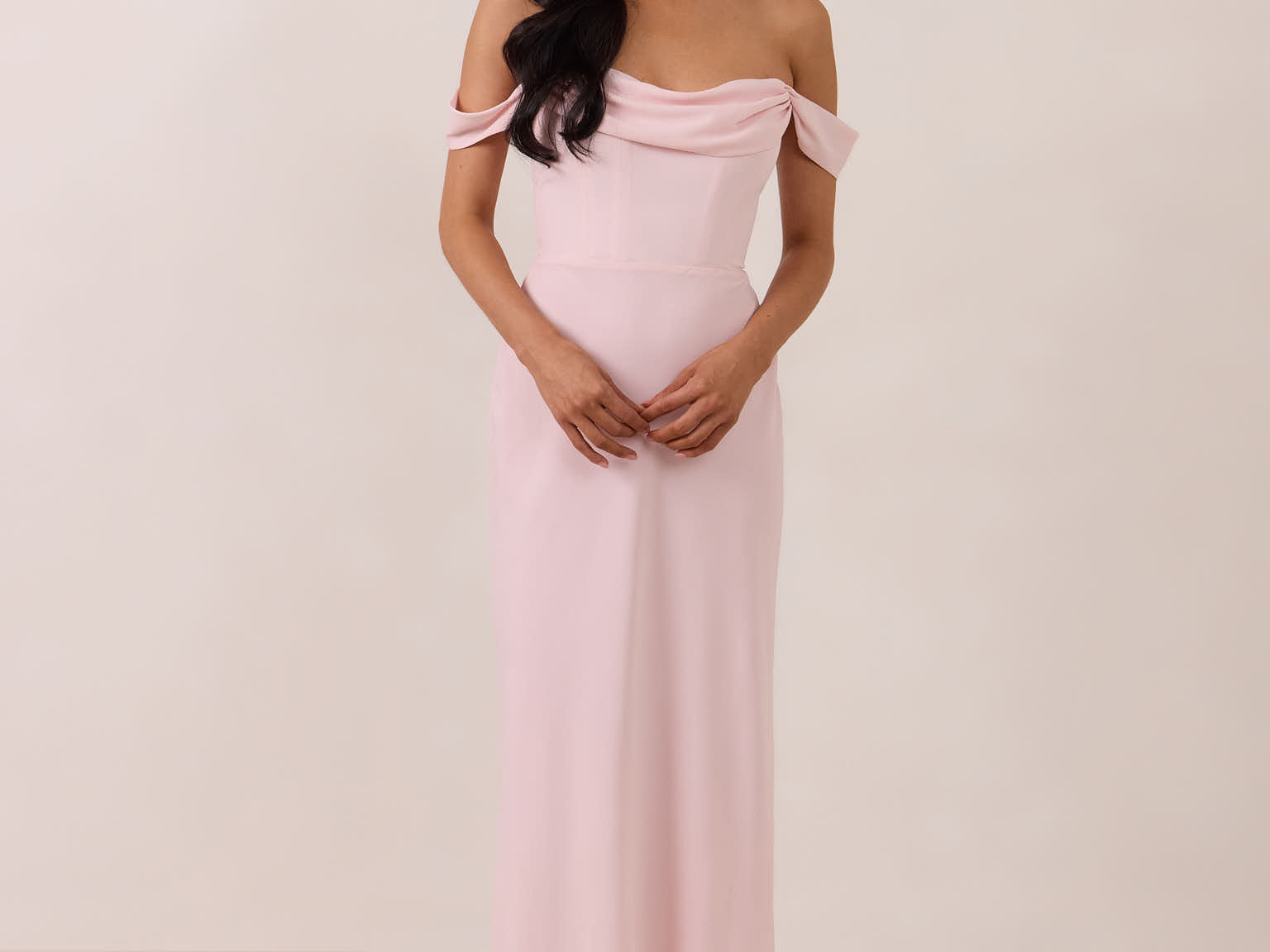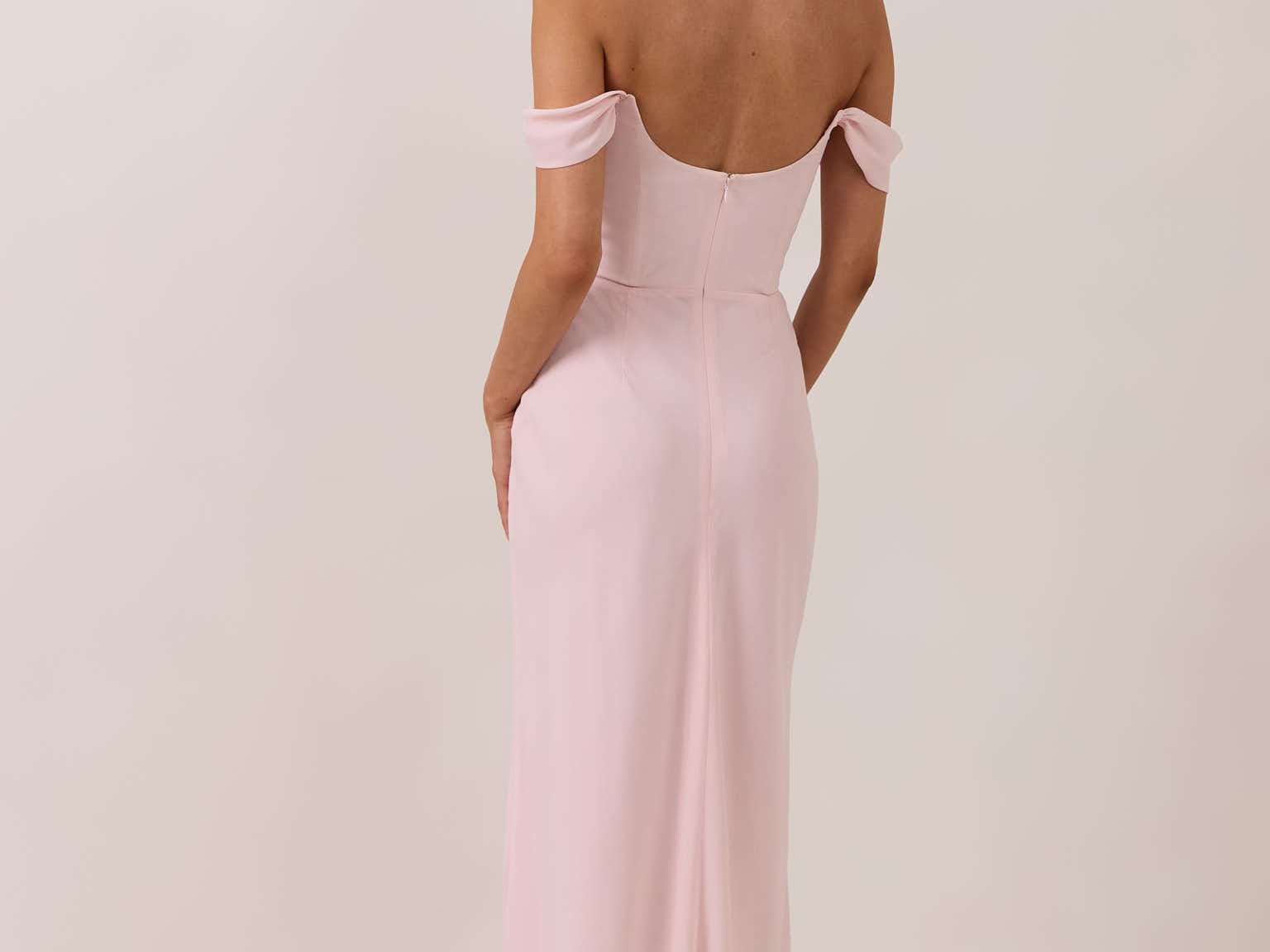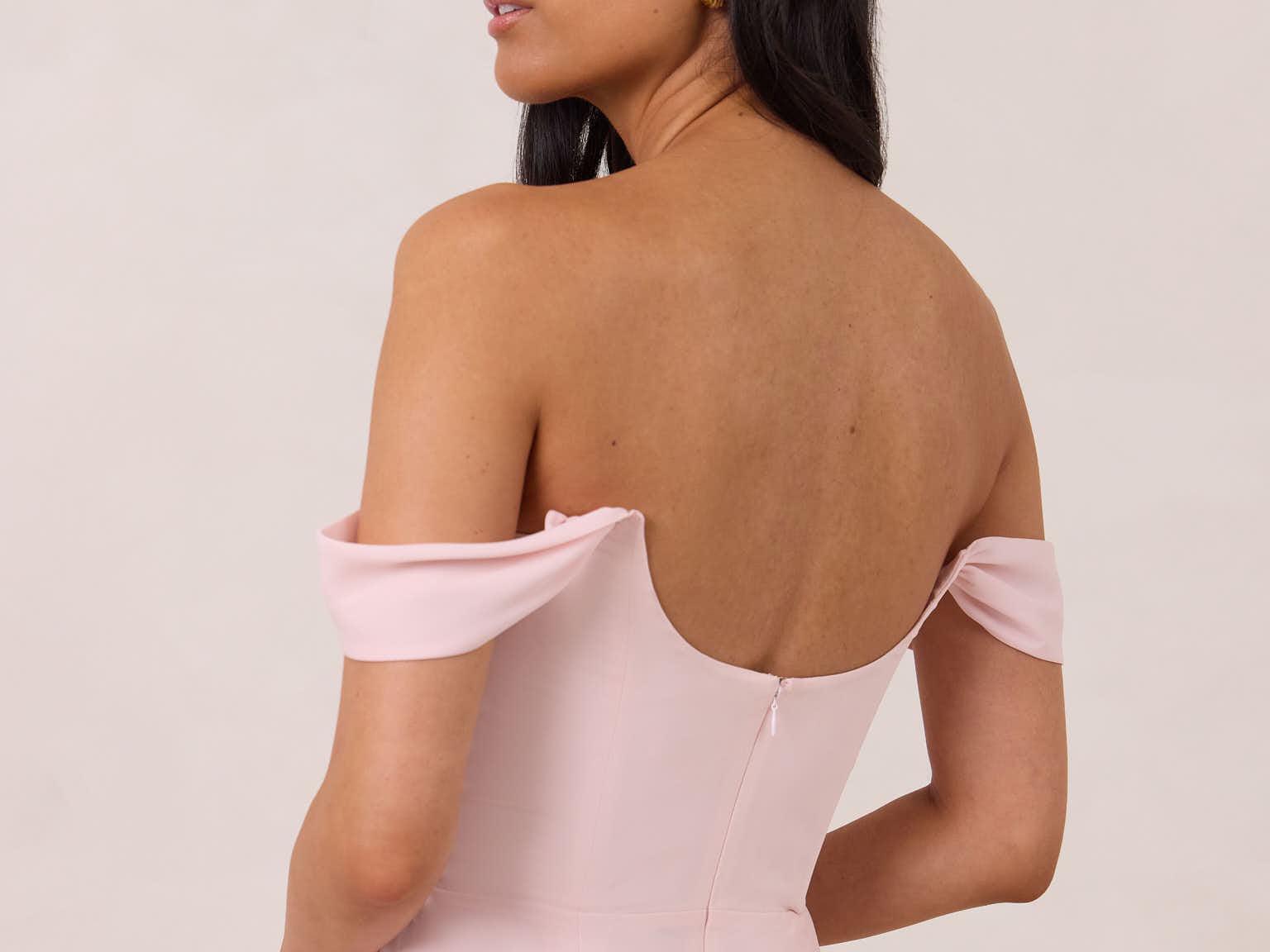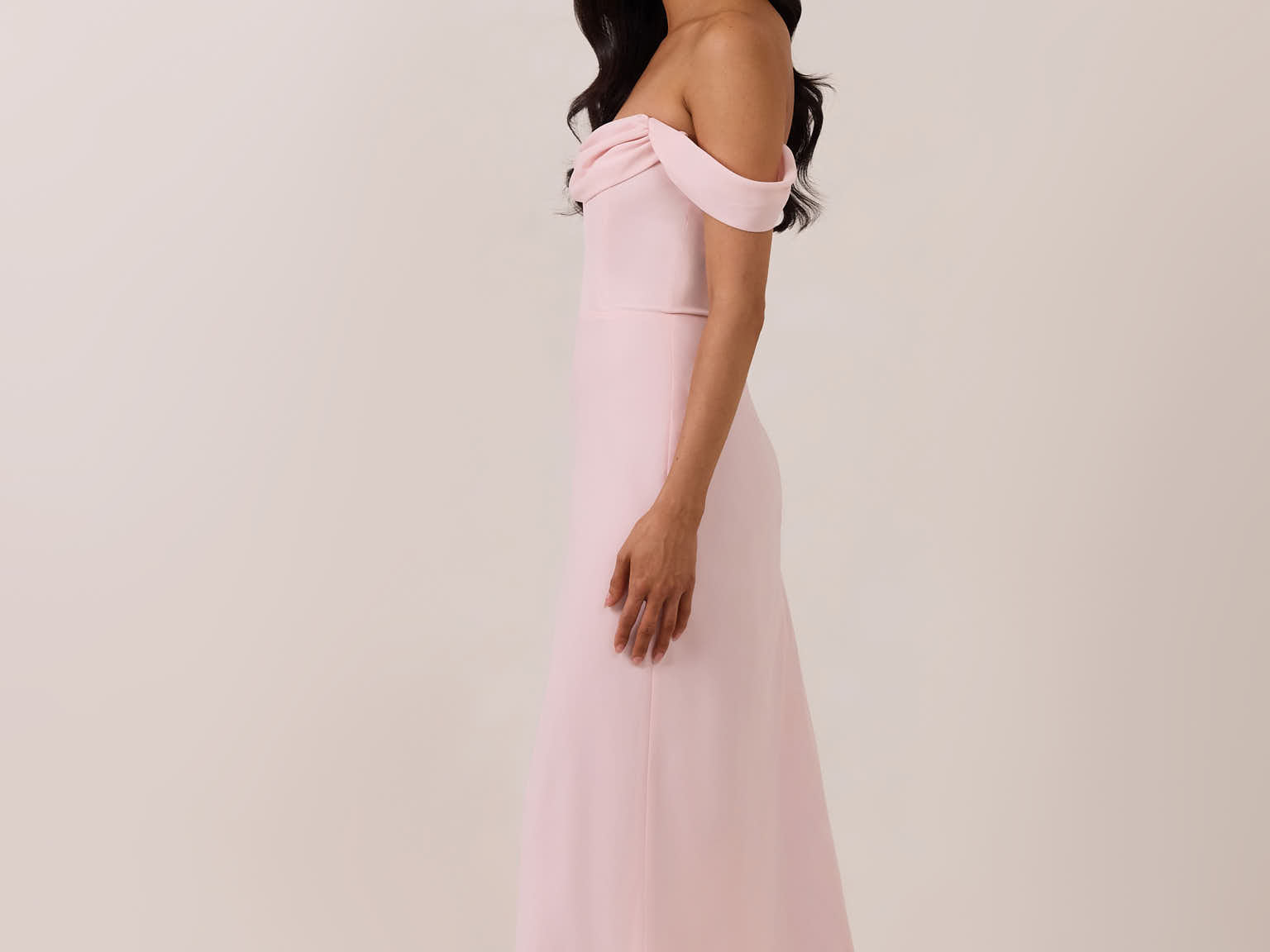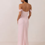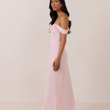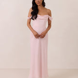 The Sutton Dress is the definition of effortless elegance. Designed with a soft draped chiffon neckline and delicate off-the-shoulder sleeves, it strikes the perfect balance between romance and refinement.
